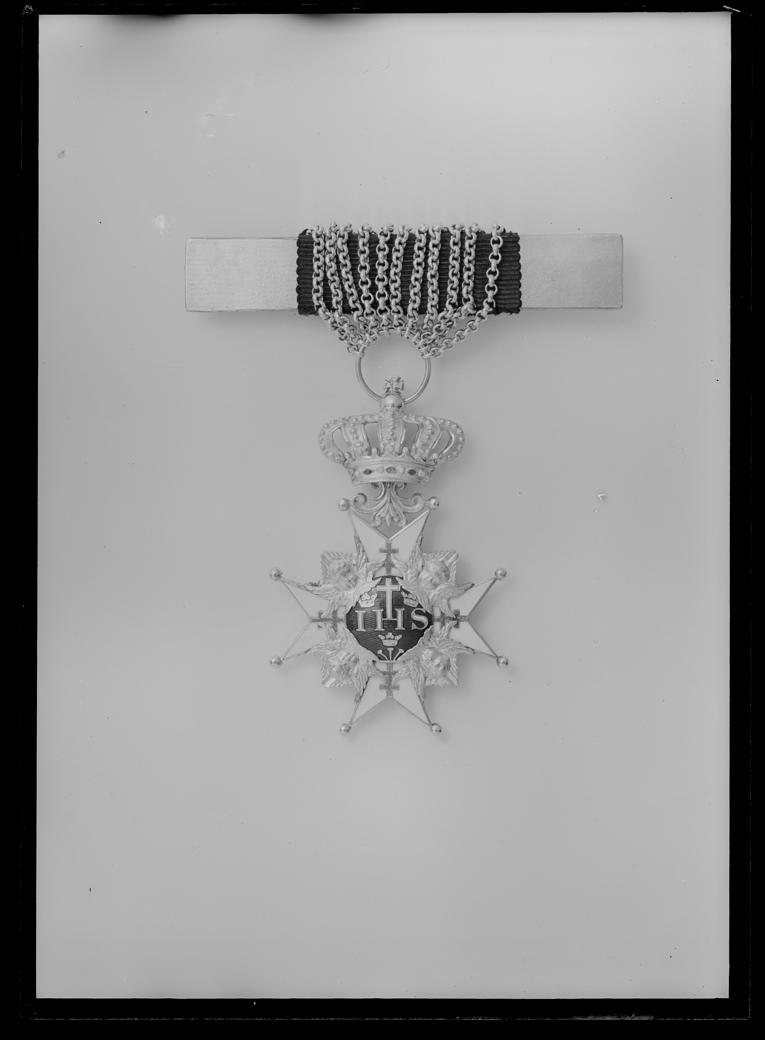 Lilla serafimerkorset (för underofficiant vid KMO) modell efter 1856, jfr nr 1730 och 498, buret i 11 st kedjor av små guldringar, fästade i överkanten av en platta av svart sidenmoaré (13x35 mm).
