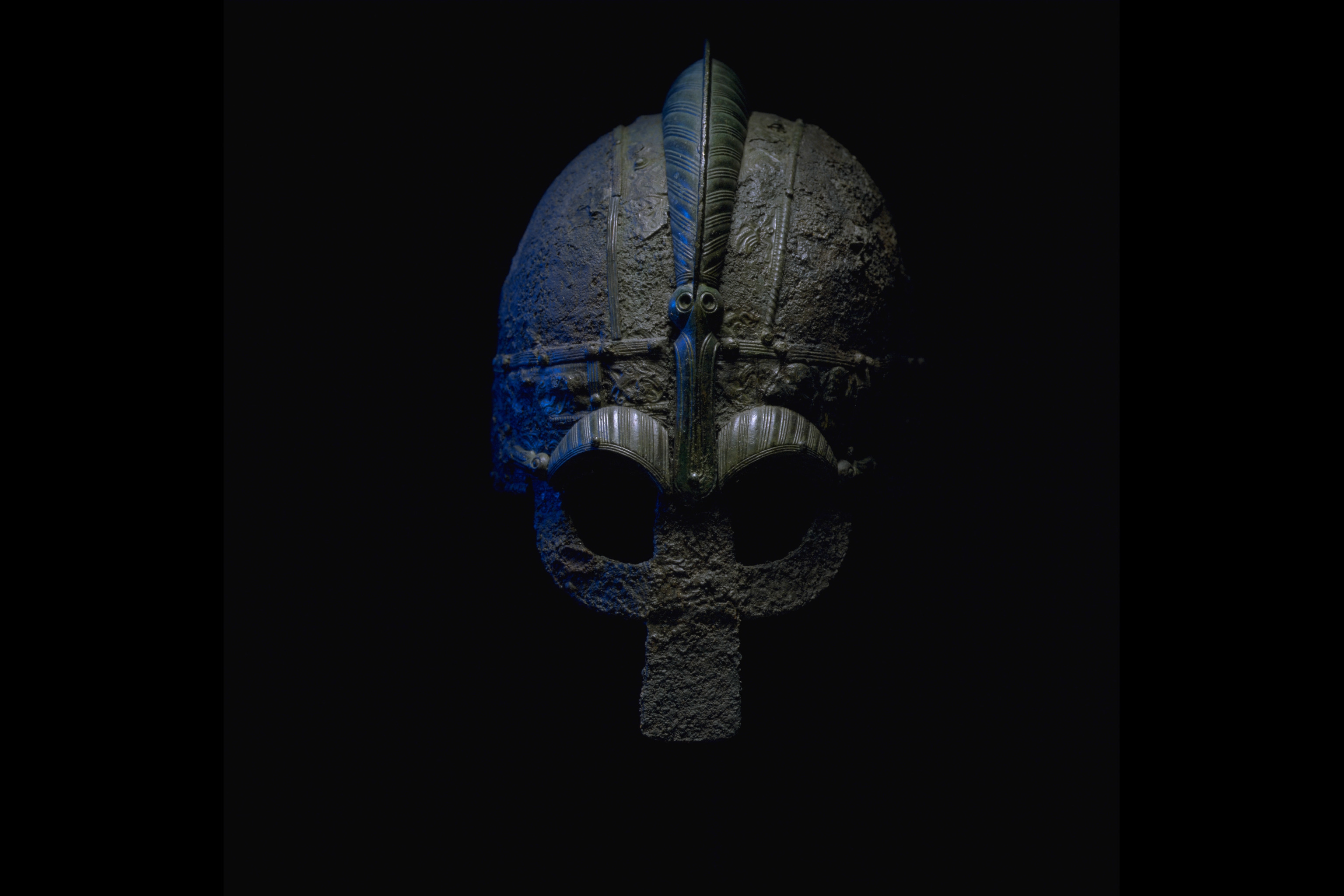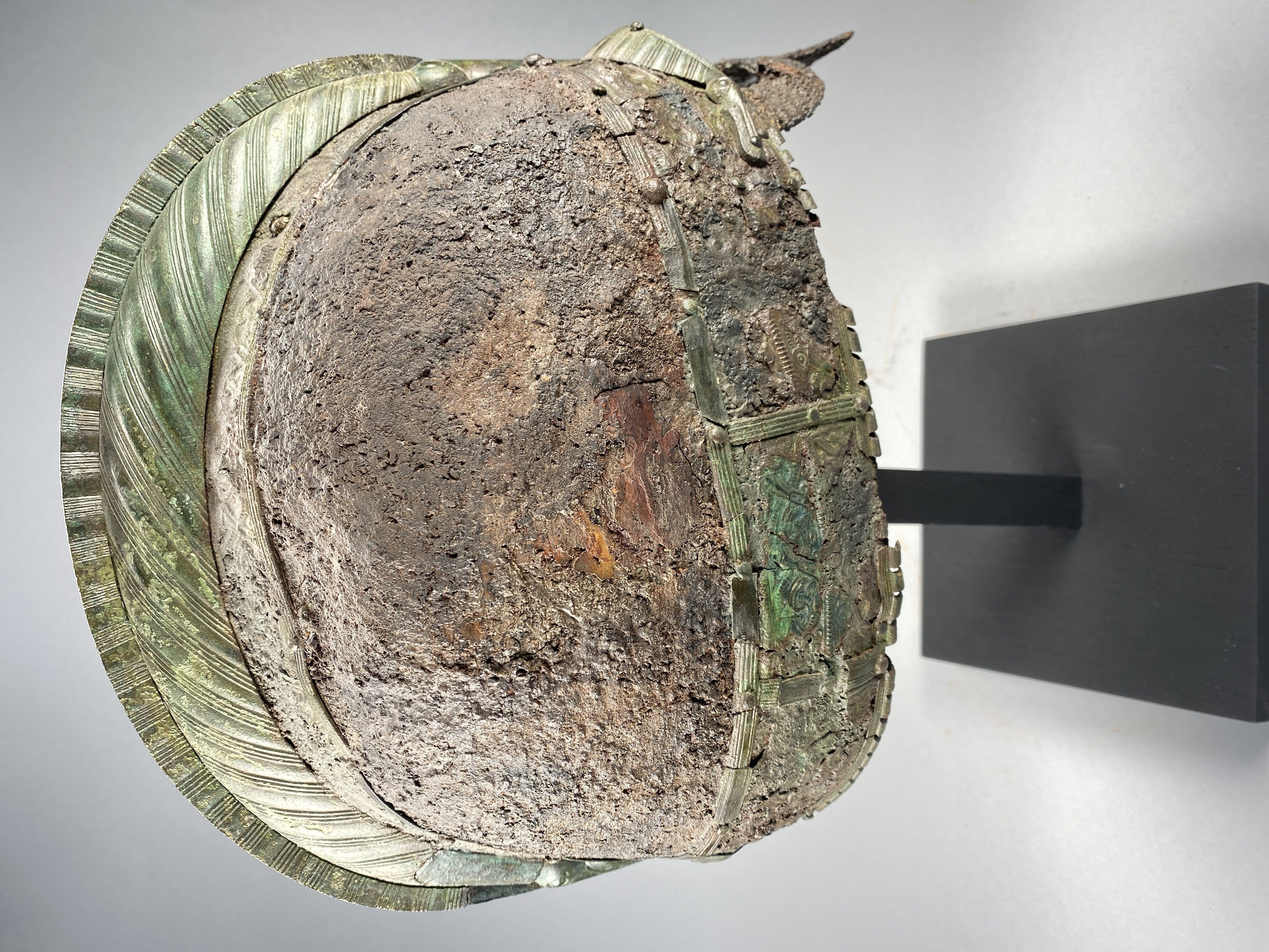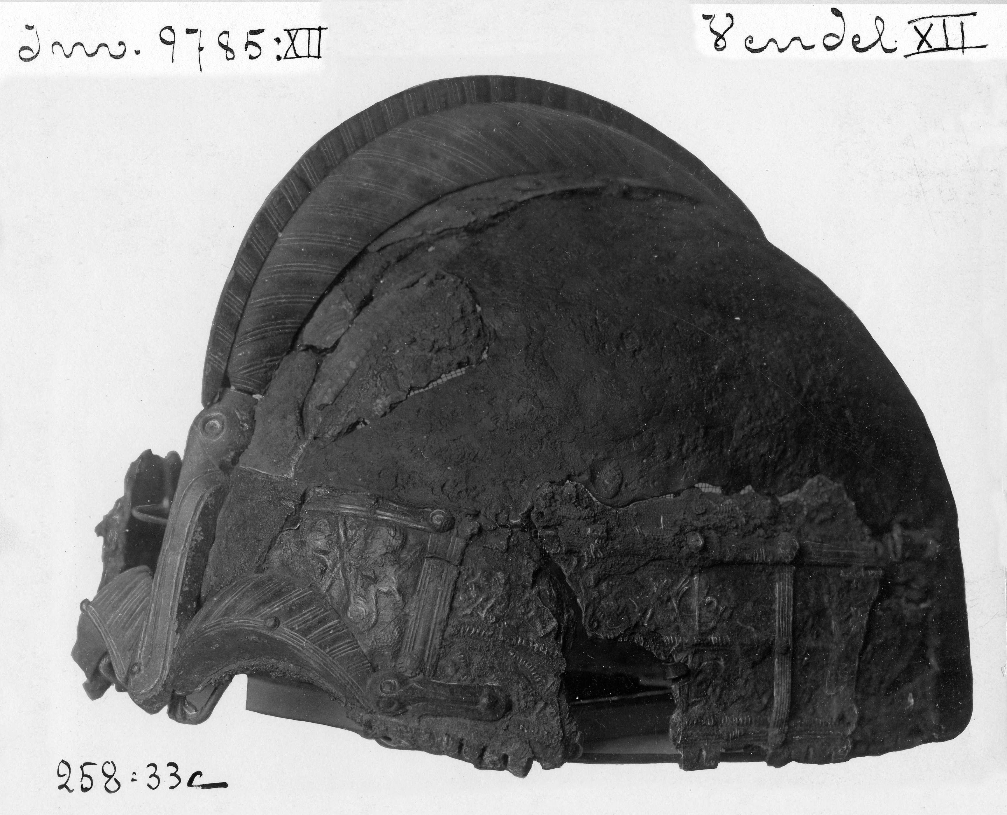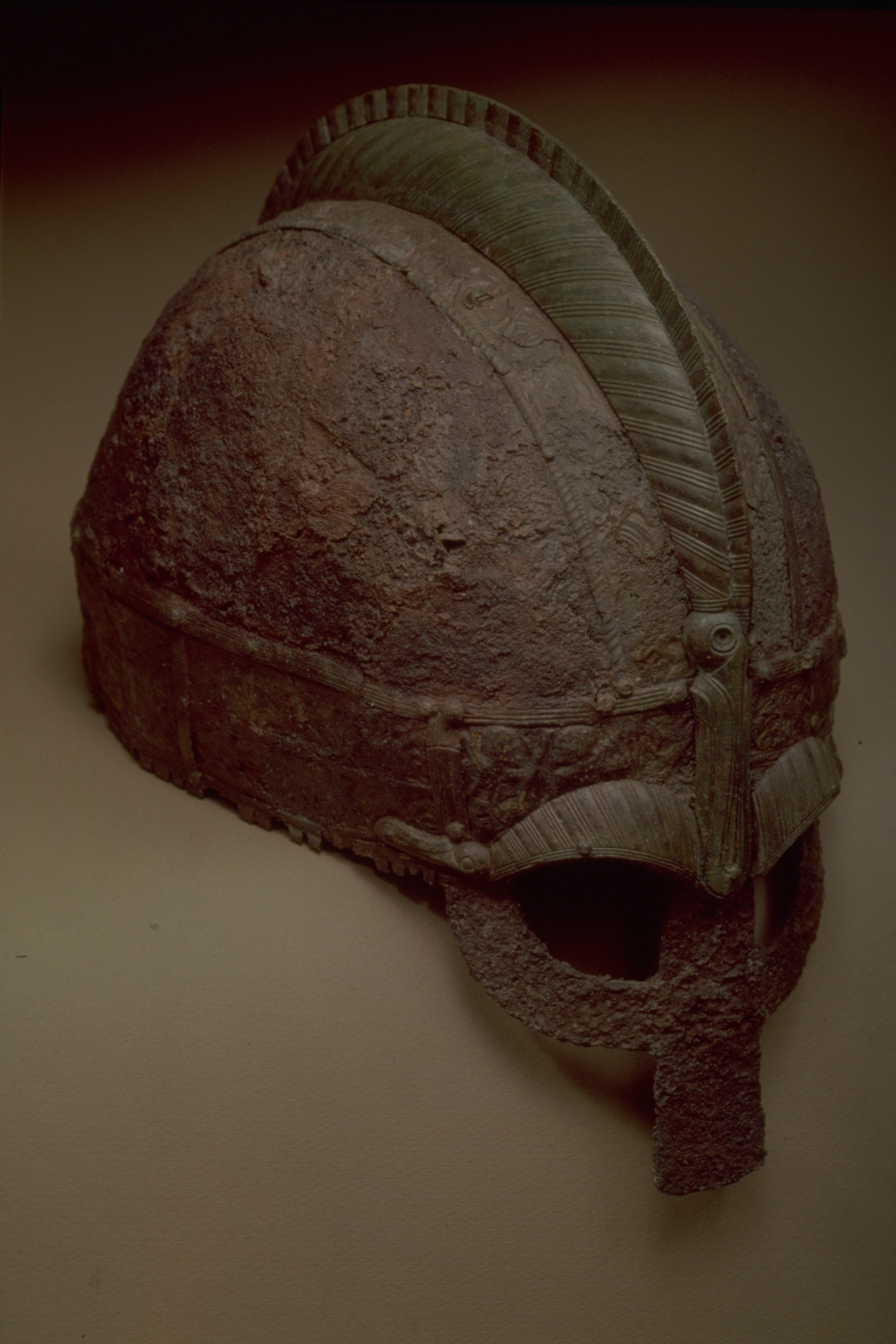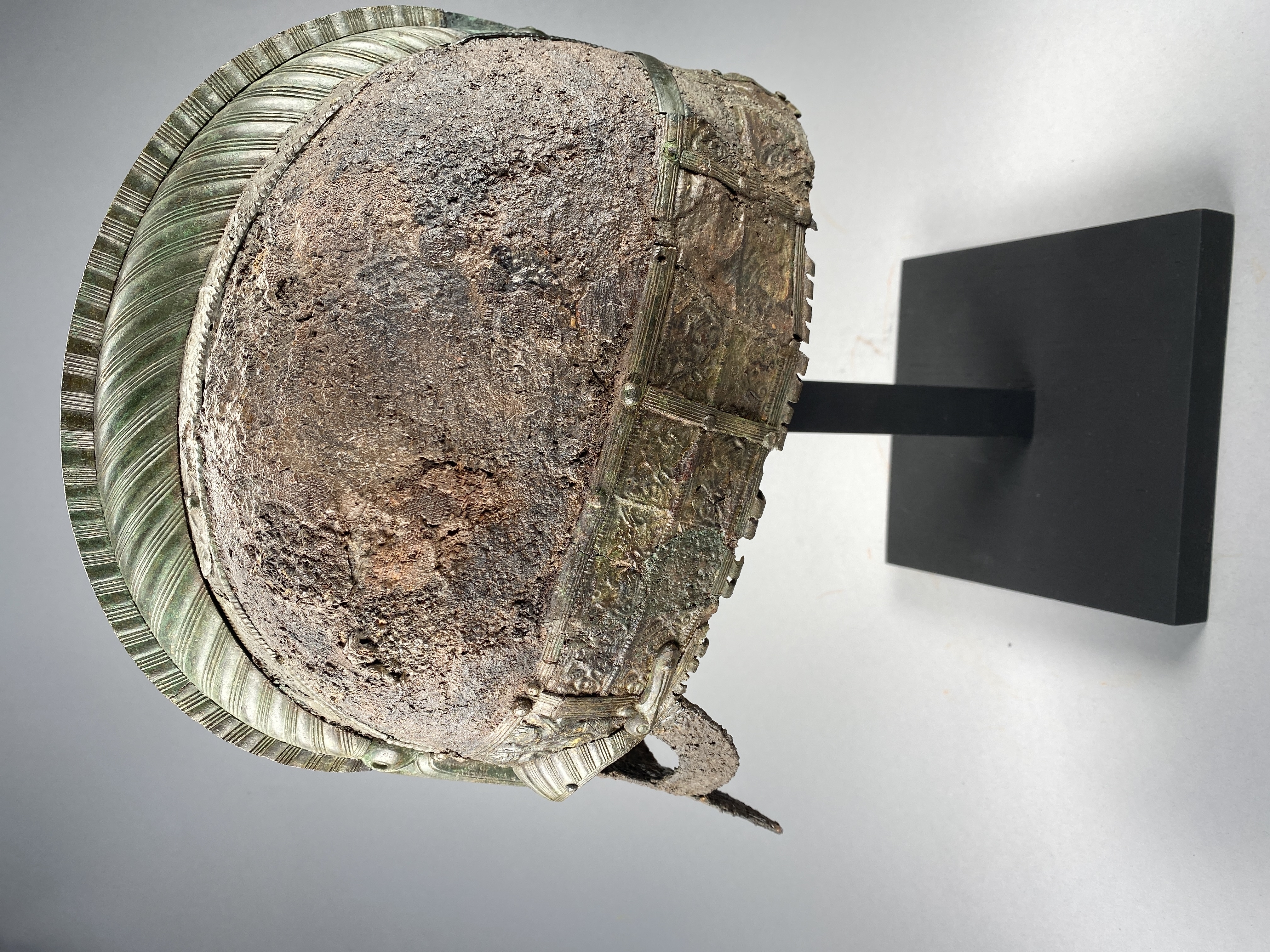 Prakthjälm av järn med bronsbeslag.