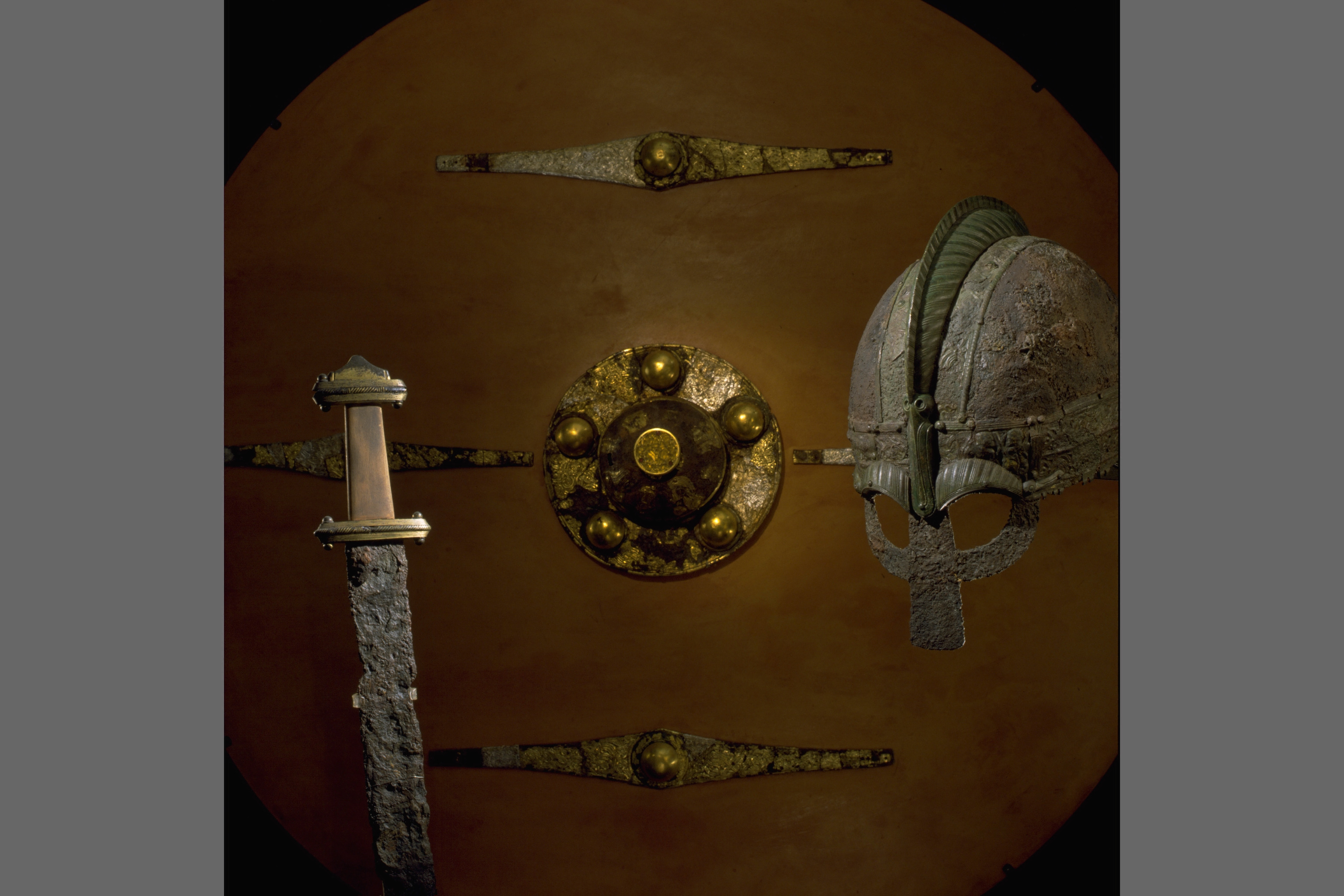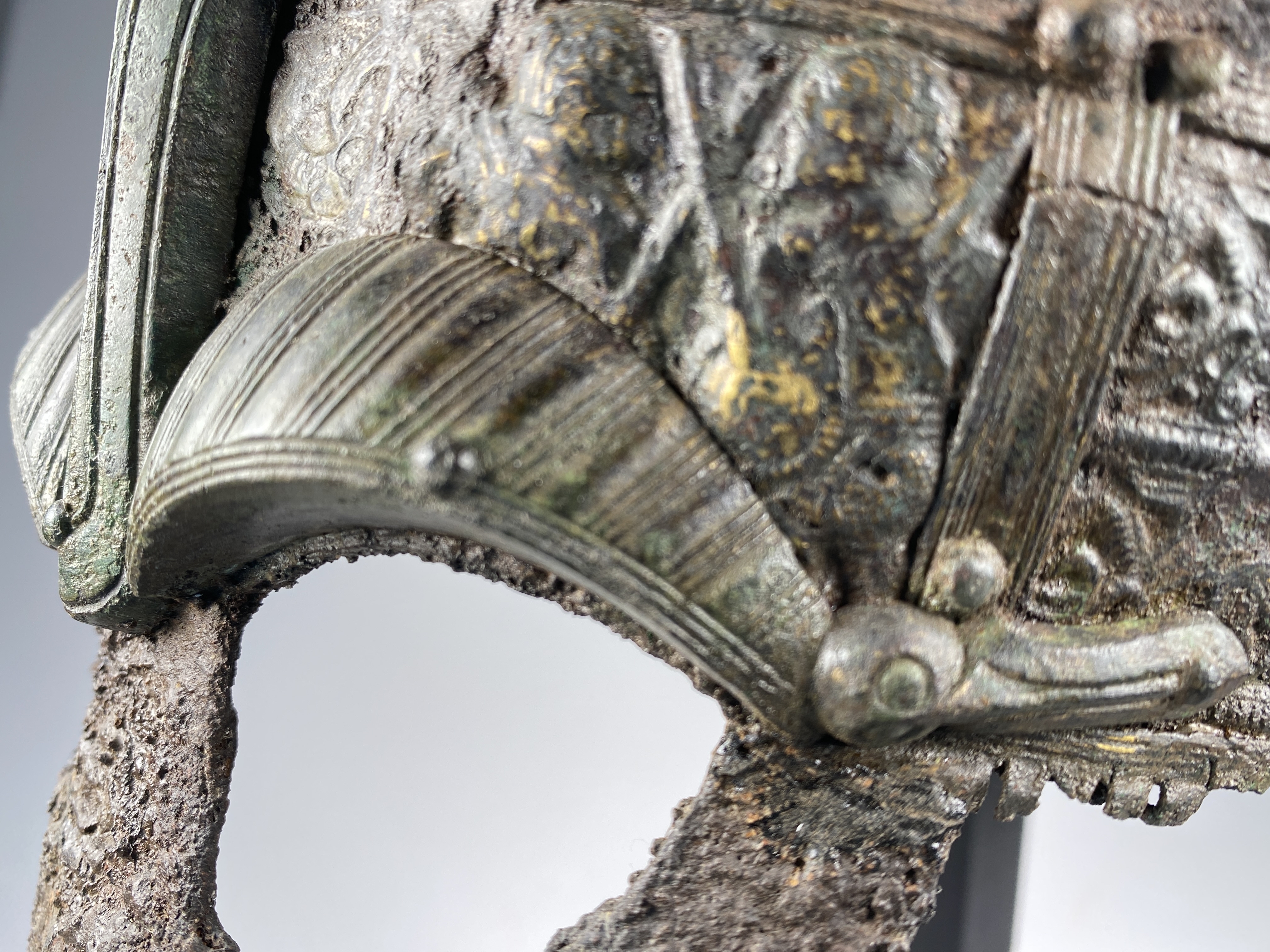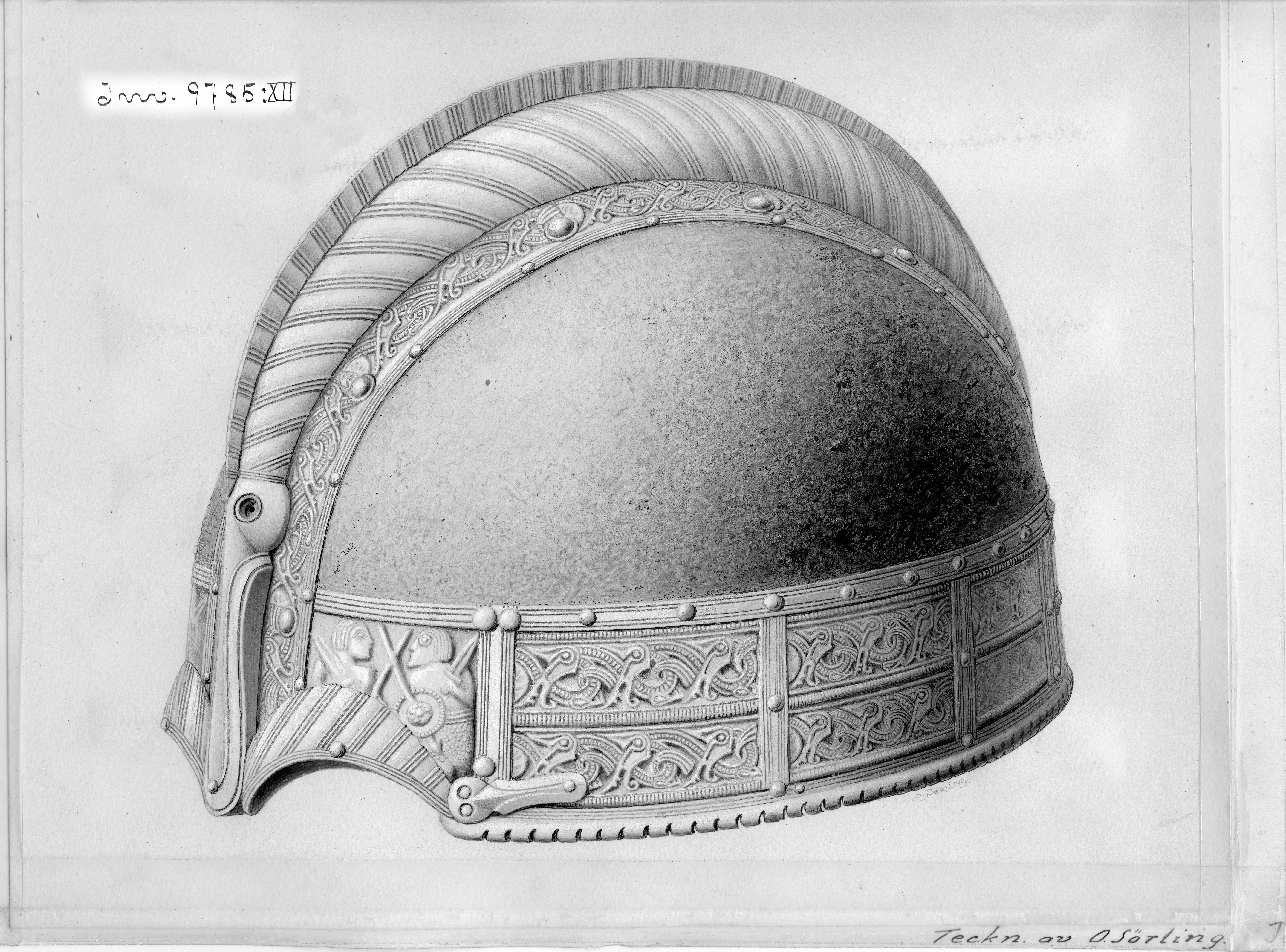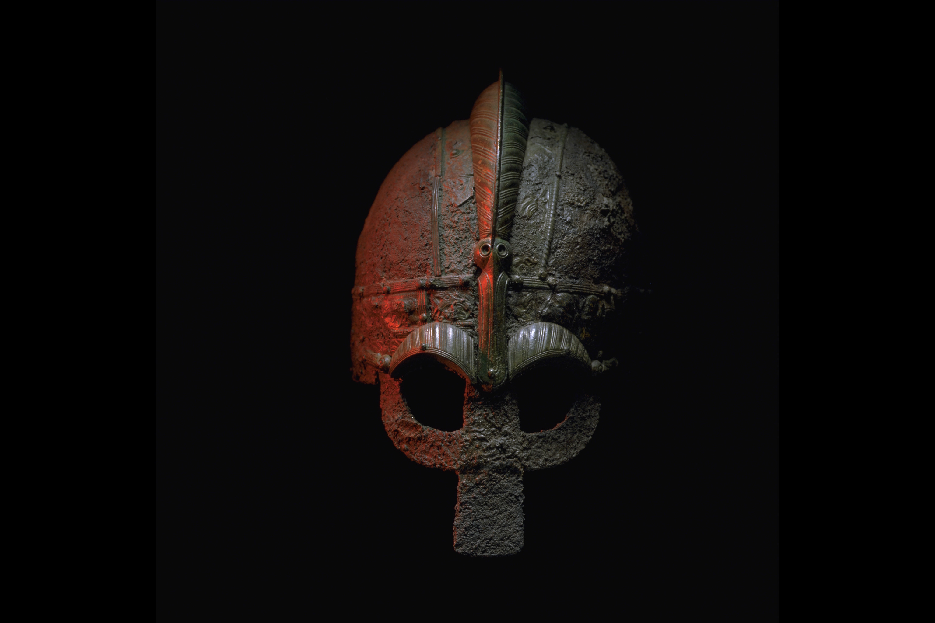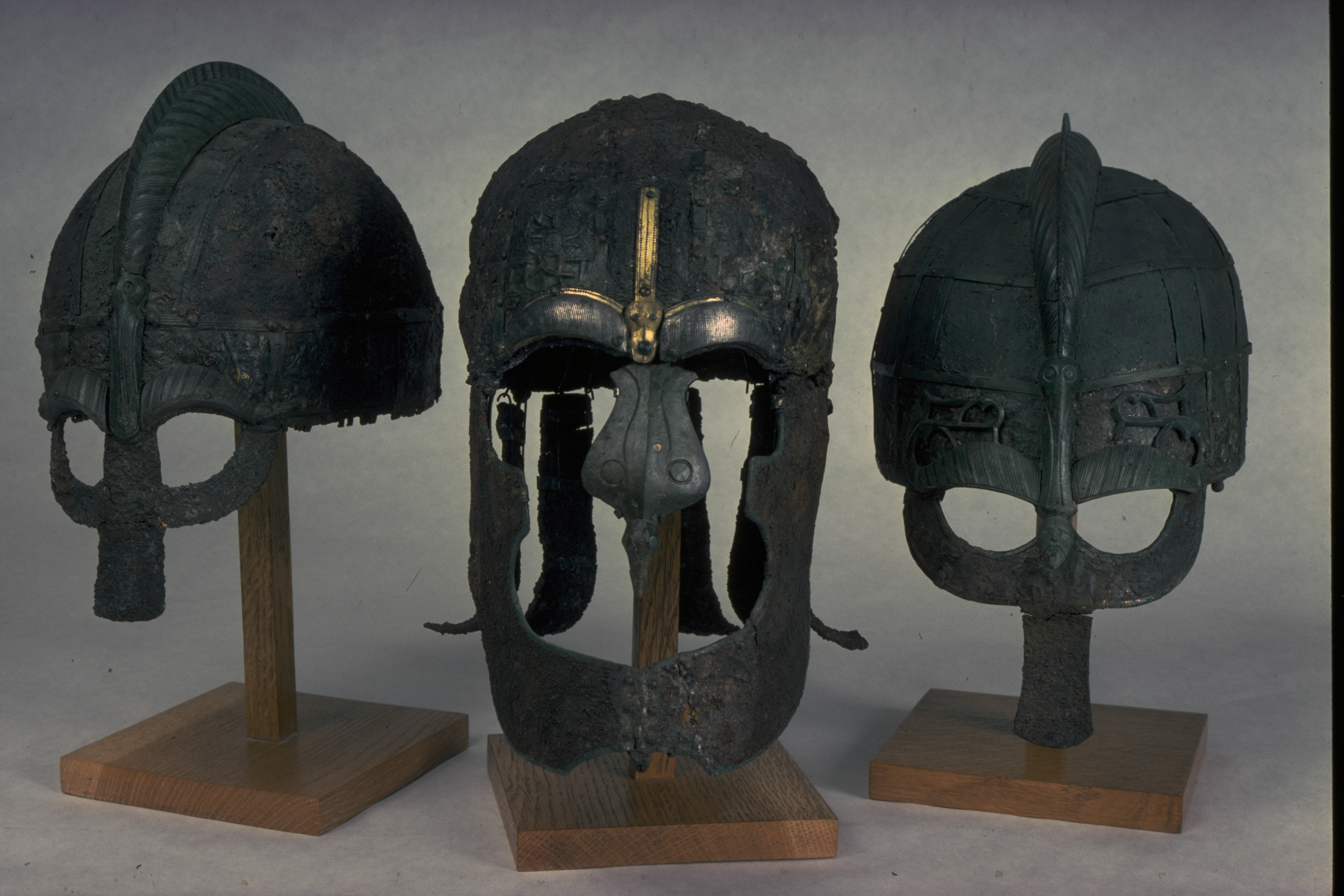 Prakthjälm av järn med bronsbeslag.