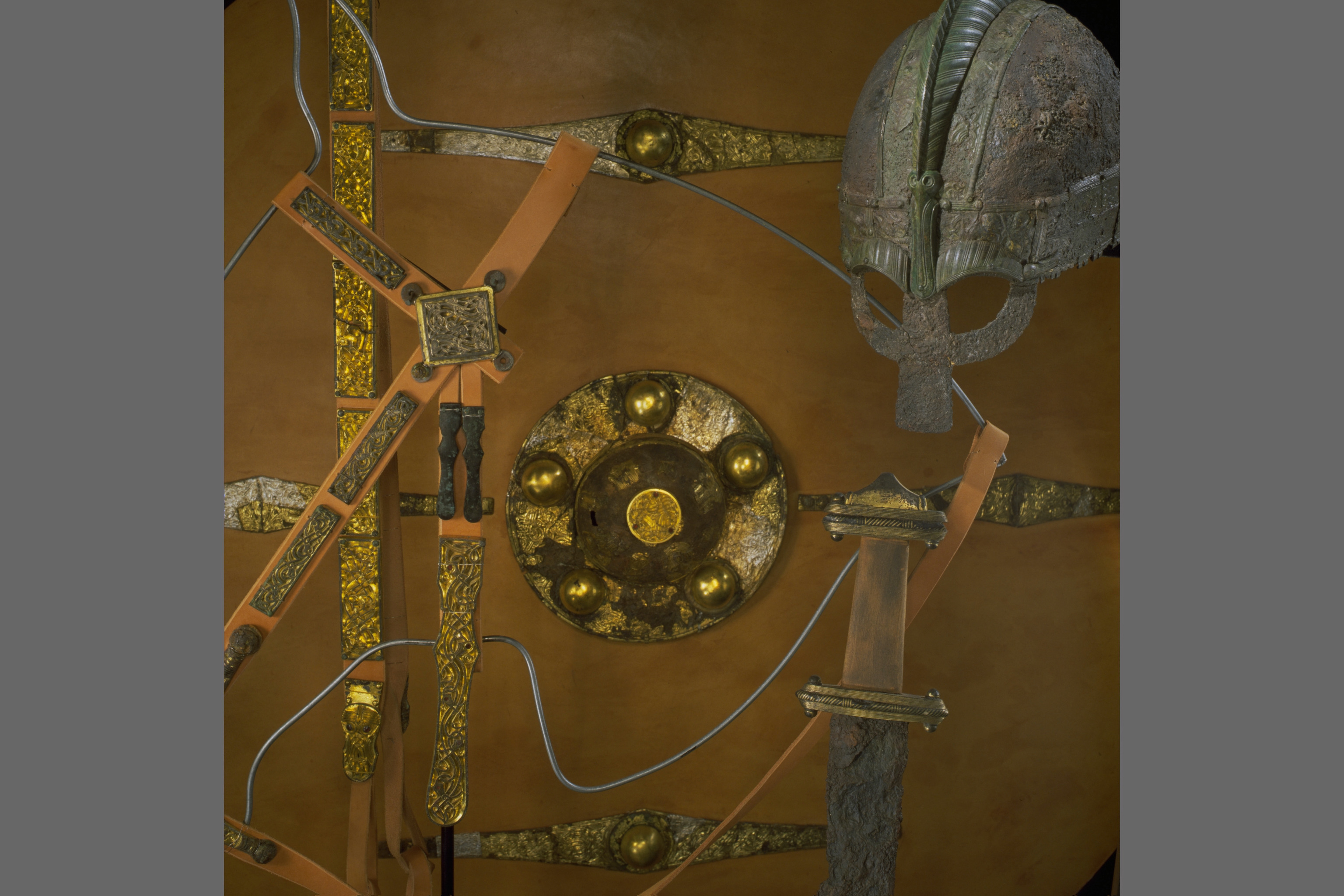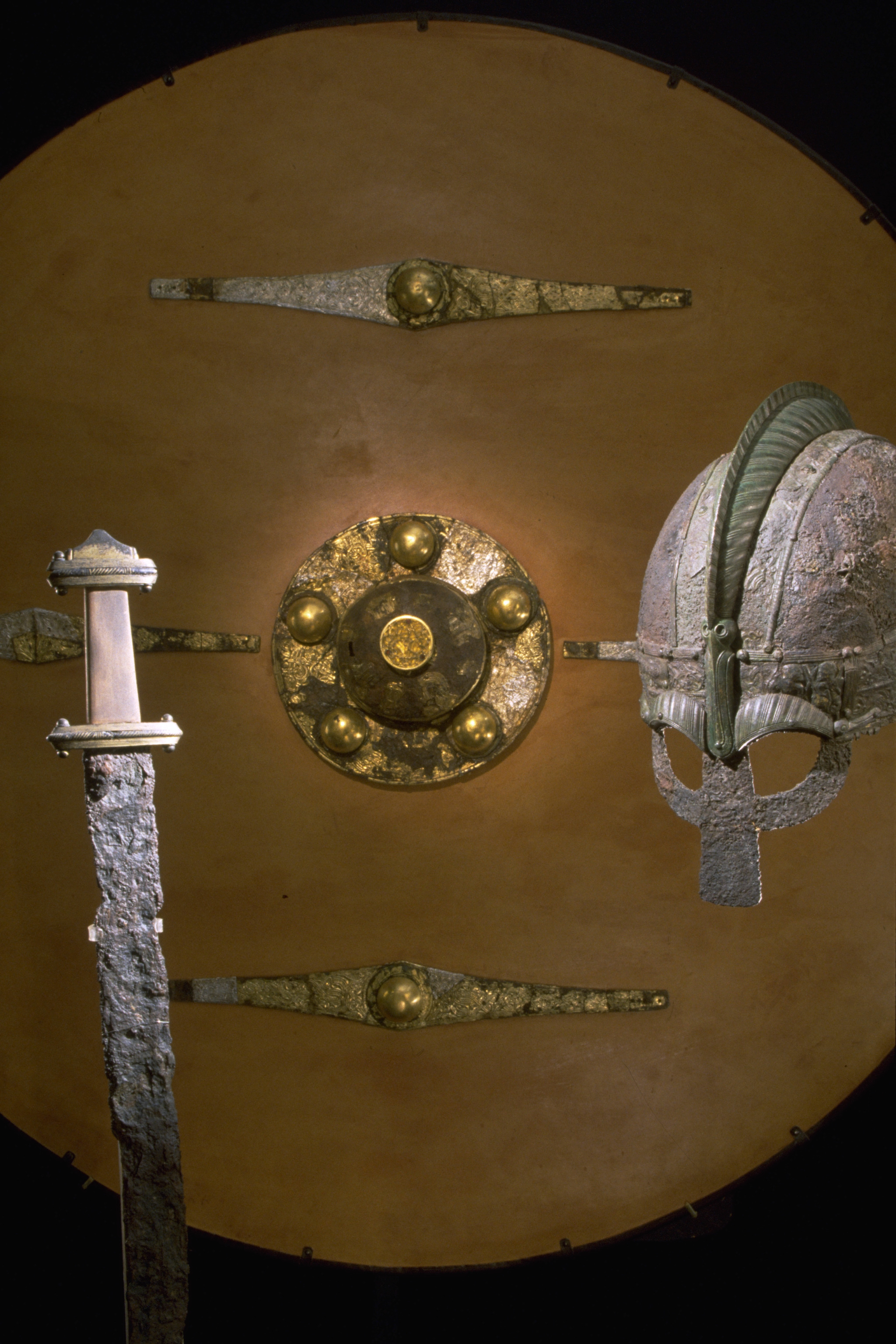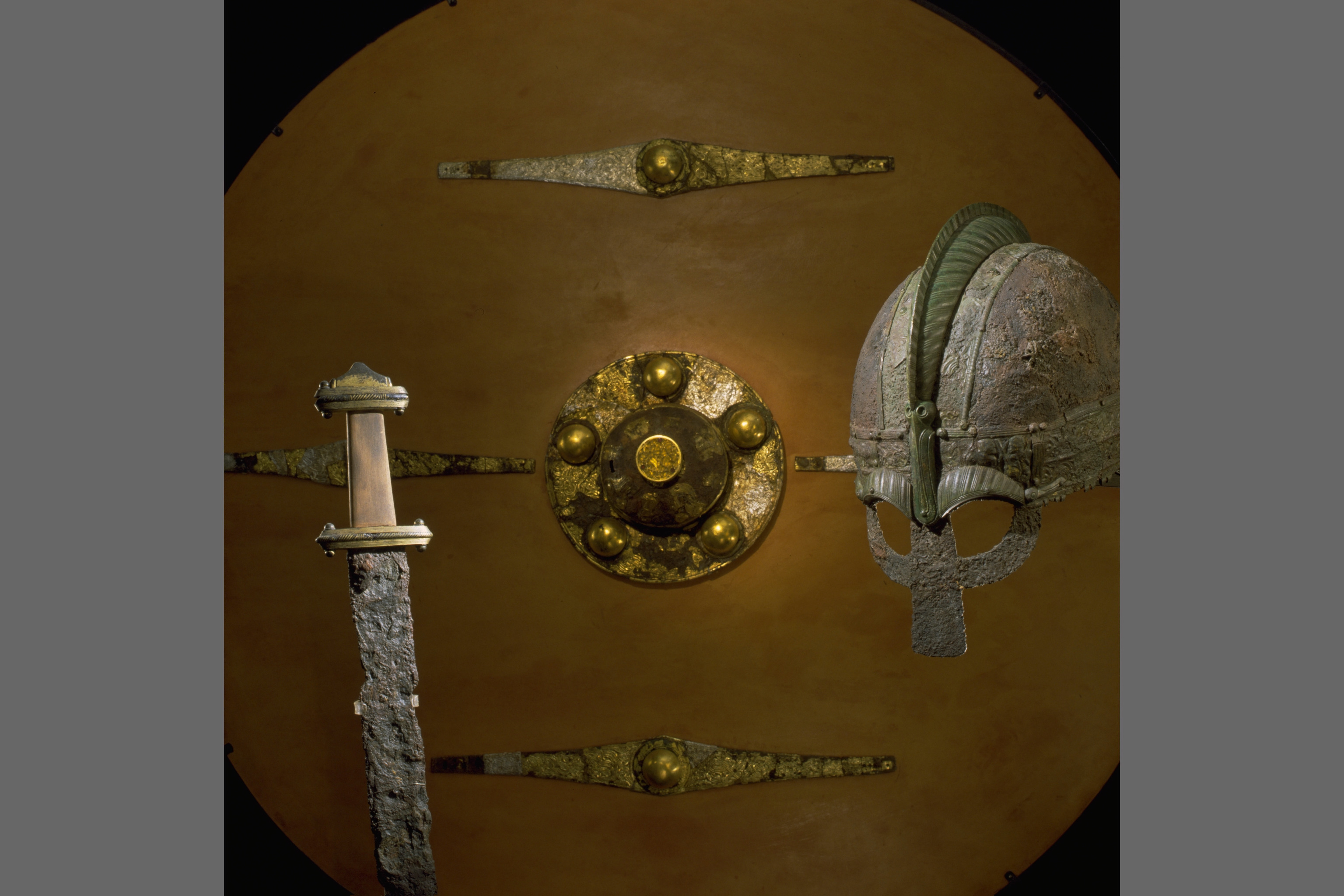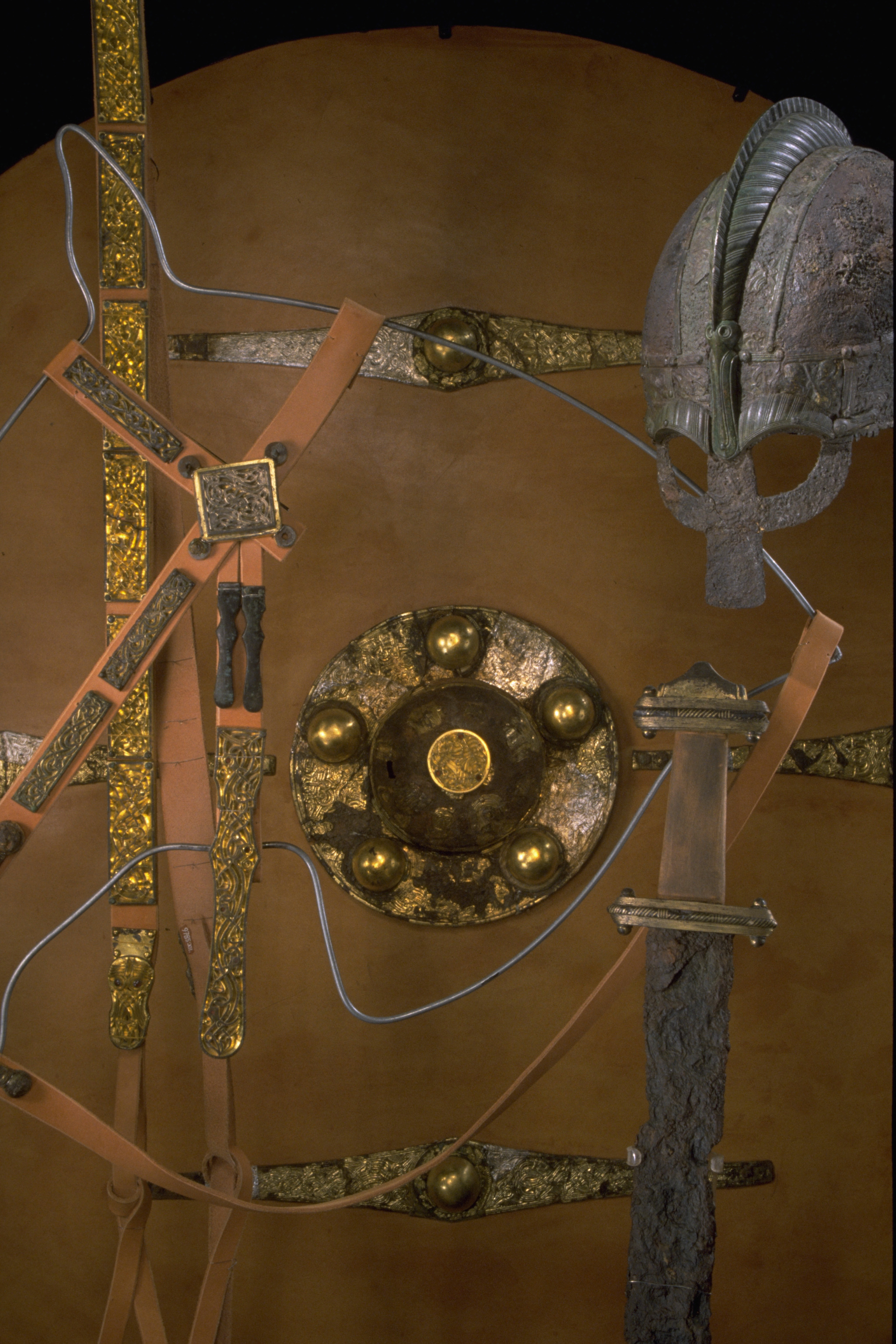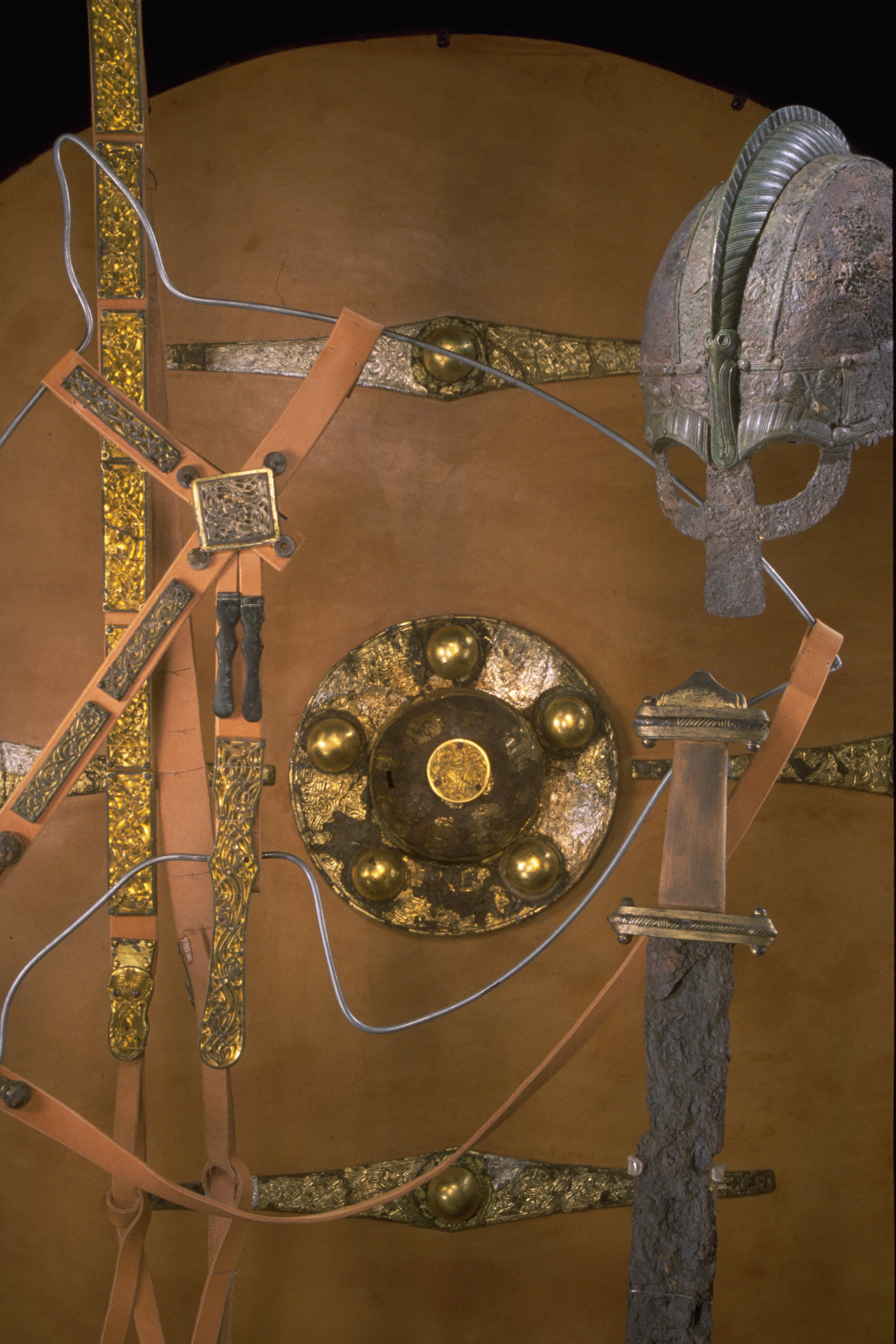 Prakthjälm av järn med bronsbeslag.