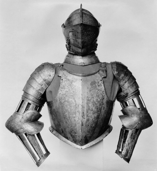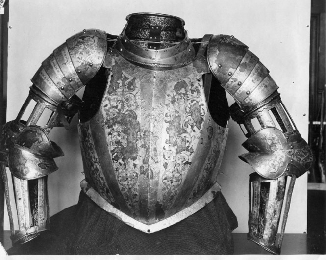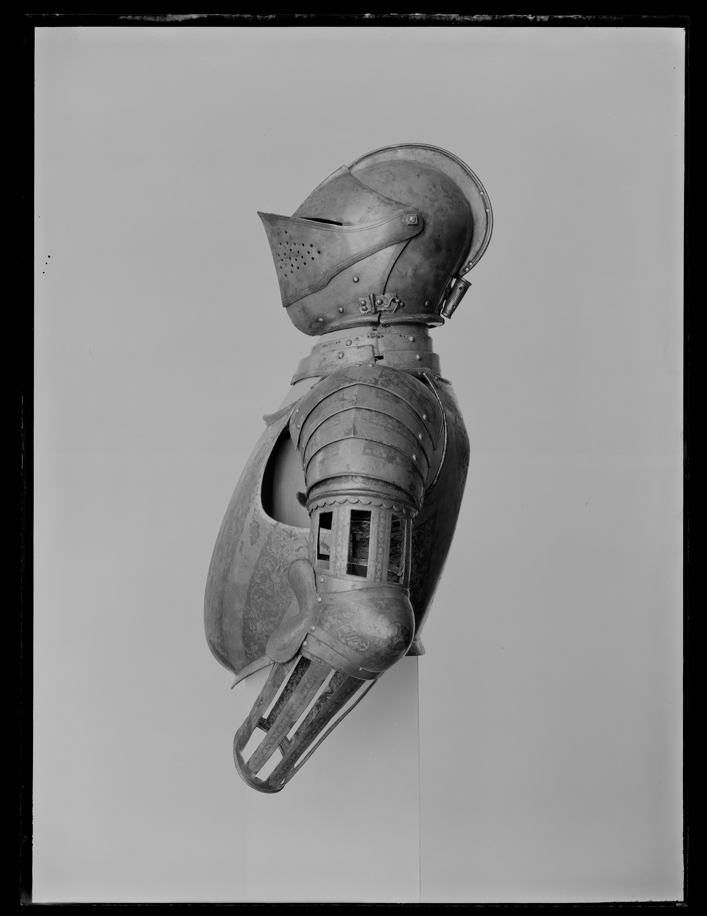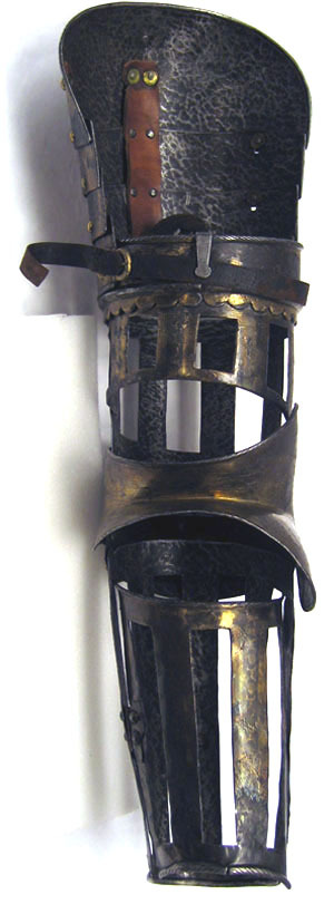 Driven stålplåt med dekor av påslagen guld- och silverfolie. Insidan svärtad med tydliga slagmärken. Av sammanlagt 11 delar. Axelstycke av fyra välvda skenor minskande i bredd nedåt. Fästade omlott med nitade läderband på insidan. Från utsidan en synlig nitrad i var sida. Översta skenan något utdragen bakåt med upptill i mitten tre nitar i grupp. Yttre kanterna omvikta, rundsmidda med filade snedställda linjer. I nedersta skenans ena kant en läderrem, i andra kanten en sölja. Remmen spänns runt armskenan. Överarmsdel av två rörformiga skenor sammanfogade med drivna åsar till en rörlig led. Övre skenan snett avtagen och öppen inåt med nedre kanten vågformad. Nedre skenan genombruten i åtta platta vertikalt ställda ribbor. Lutande urtagning mot armen. Upptill i inre kant en hake av platt stål, nitad på insidan och böjd över kanten. Armbuckla, utåt driven till rundaad spets och åt sidan utdragen till mussla med rundade kanter. Musslan V-formig och övergår till skena löpande över armvecket, som mot insidan planar ut till mindre mussla. Över och under bucklan en välvd mindre skena. Underarmsdel av två välvda skenor bilandes ett nedåt avsmalnande rör. Genombrutet i sju platta vertikalt ställda ribbor. Inre skenan kortare, h 160 mm, med inre kanten snett avtagen. Fästade vid varandra och öppnigsbara med mot insidan ett gångjärn och mot utsidan tapp genom hål. Dekor av påslagen guld- och silverfolie över rut-skrafferad yta. På guldfolien ett prickpunsat rankmönster, över silverfolien samma rankmönster men av påslaget guld med graverade detaljer. Alla yttre kanter på buckla och armskenor omvikt, rundsmidd med filade snedställda linjer. Alla kantnitar kullriga och förgyllda. Kan följas tillbaka i inventarierna till 1586 "blanncht och förgyllt med Rygg och bryst med Kragha och armtygh -1". Kan tyvärr inte följas tillbaka i räkenskaperna men antas vara ett svenskt arbete. Om så är fallet är Arboga den mest troliga tillverkningsorten. Dekoren bör ha utförts av damaskeneraren Antonius Lange som var verksam under den aktuella tiden och arbetade åt Johan III. Efter bröstharneskets form att döma borde det vara tillverkat något årtionde efter 1568, då Erik avsattes.