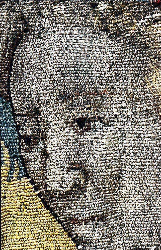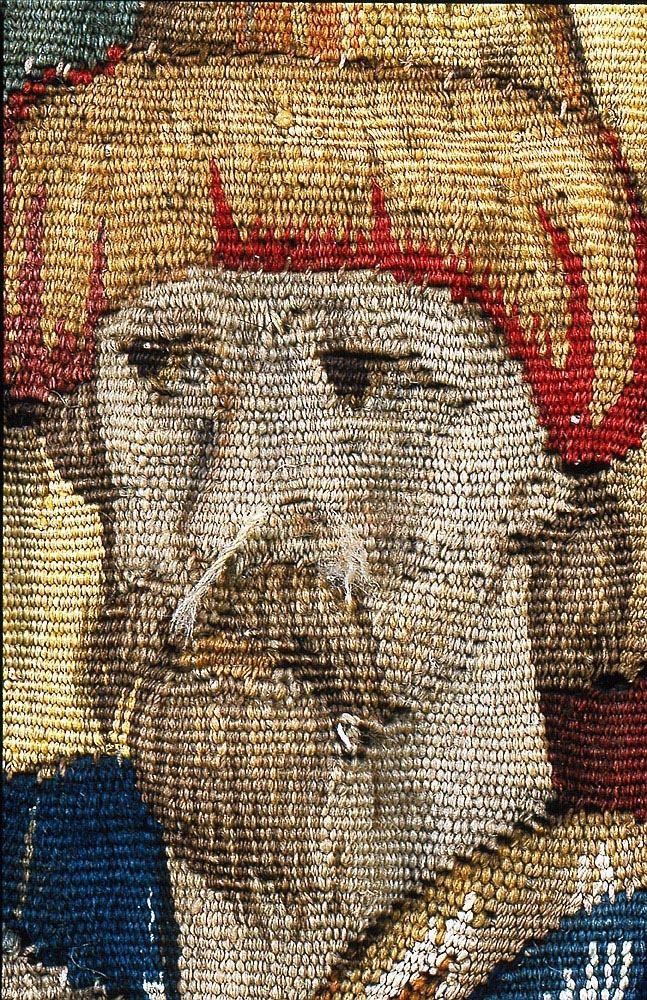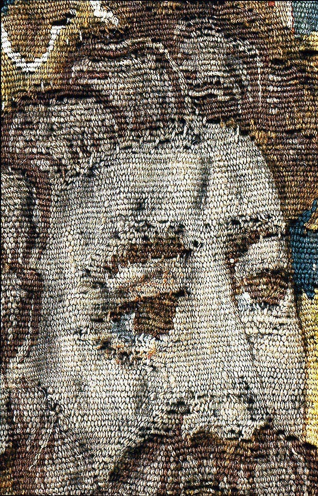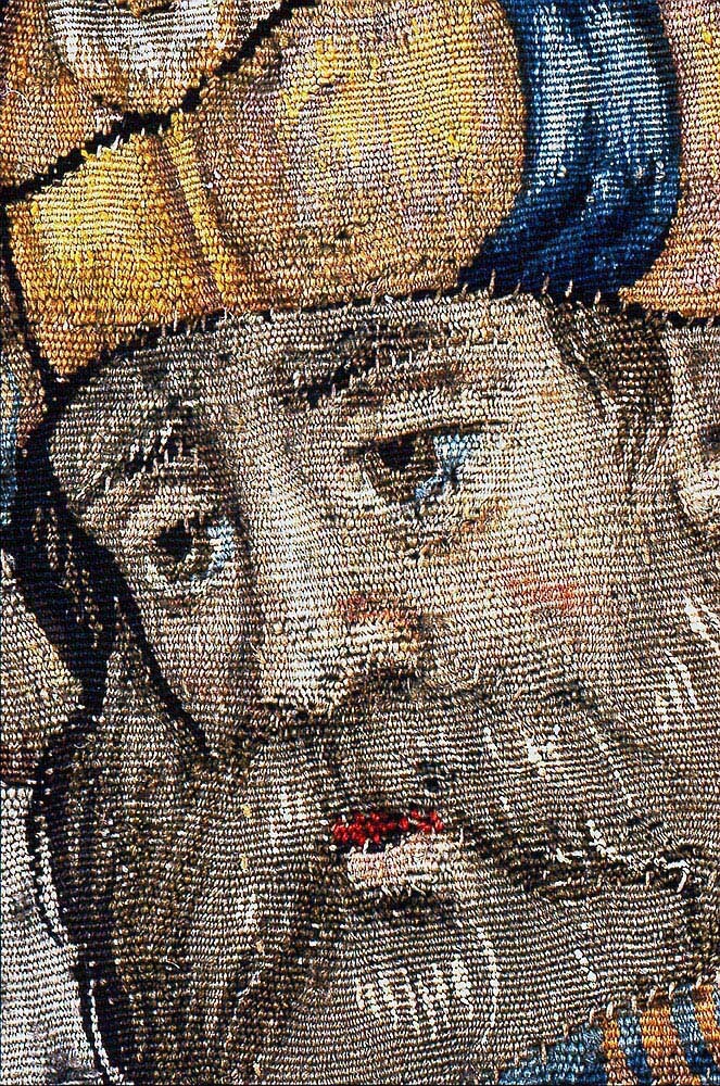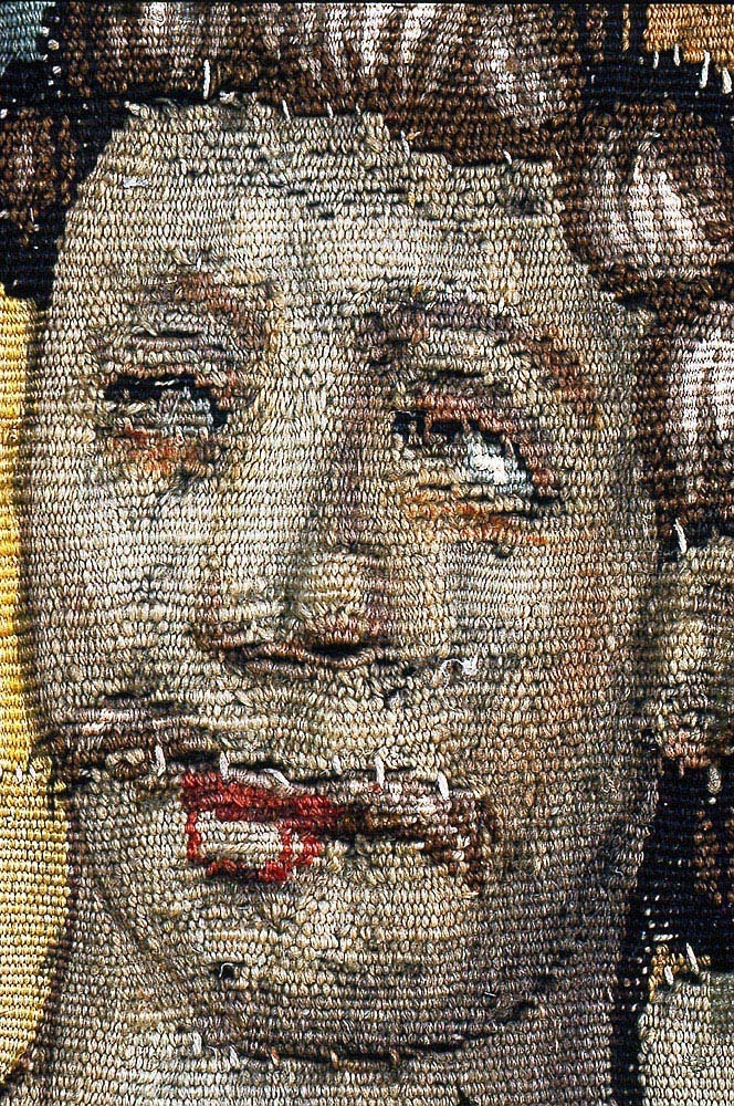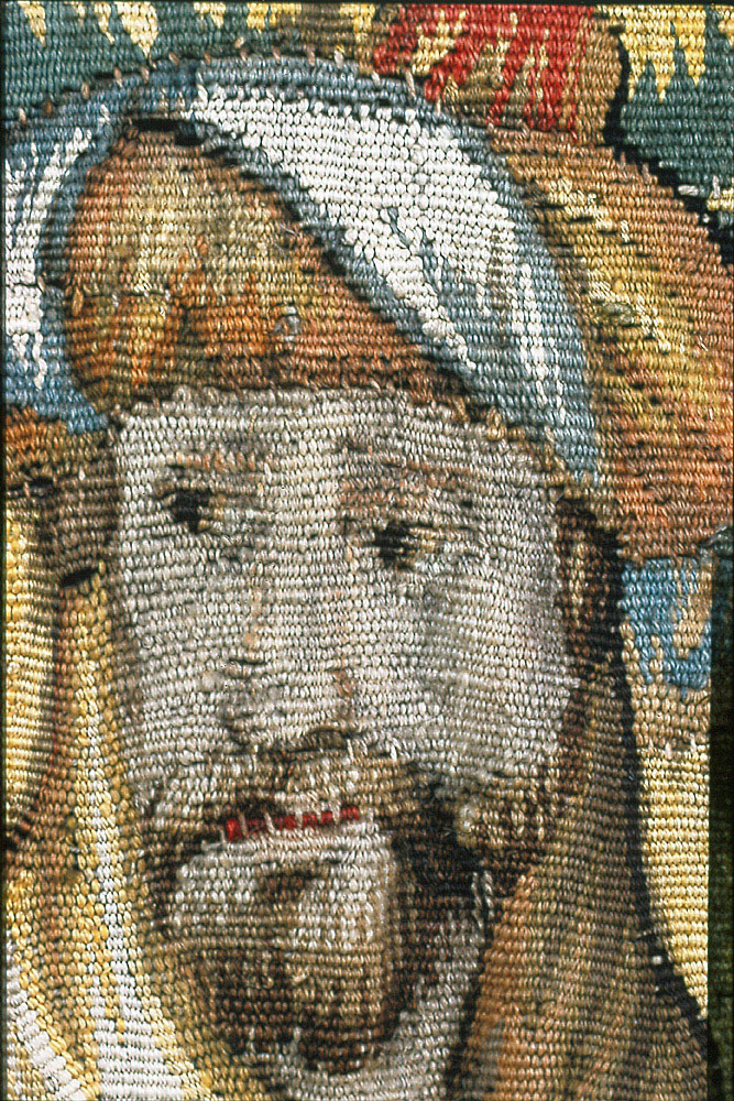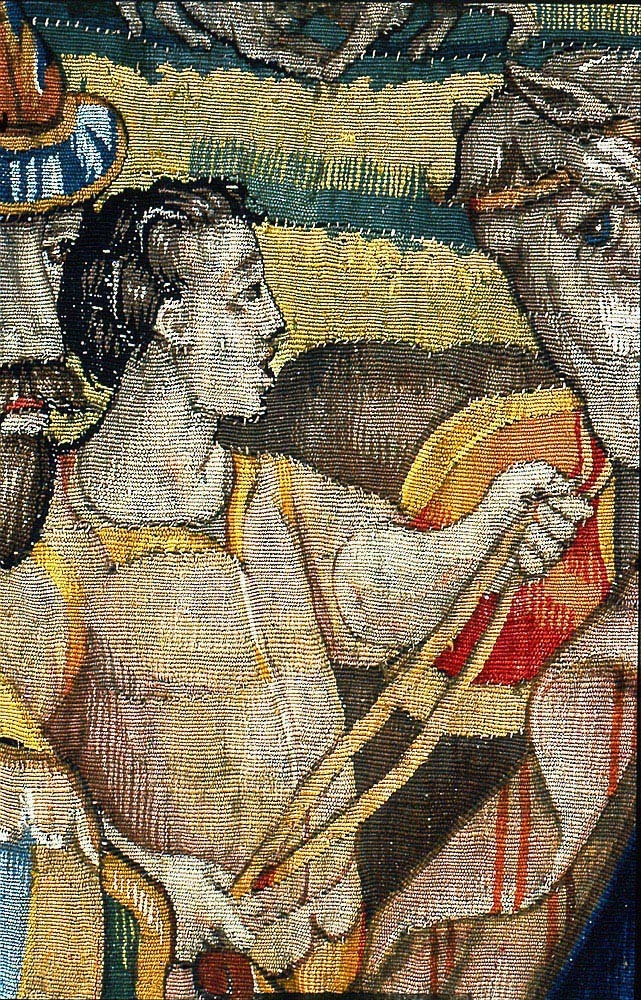 Av ylle och silke (6 trådar per cm) i gobelängteknik. Sign. i lisieren med bomärke och “BB” på var sida om sköld Martin Reimbouts, Bryssel 1570 - 1619.