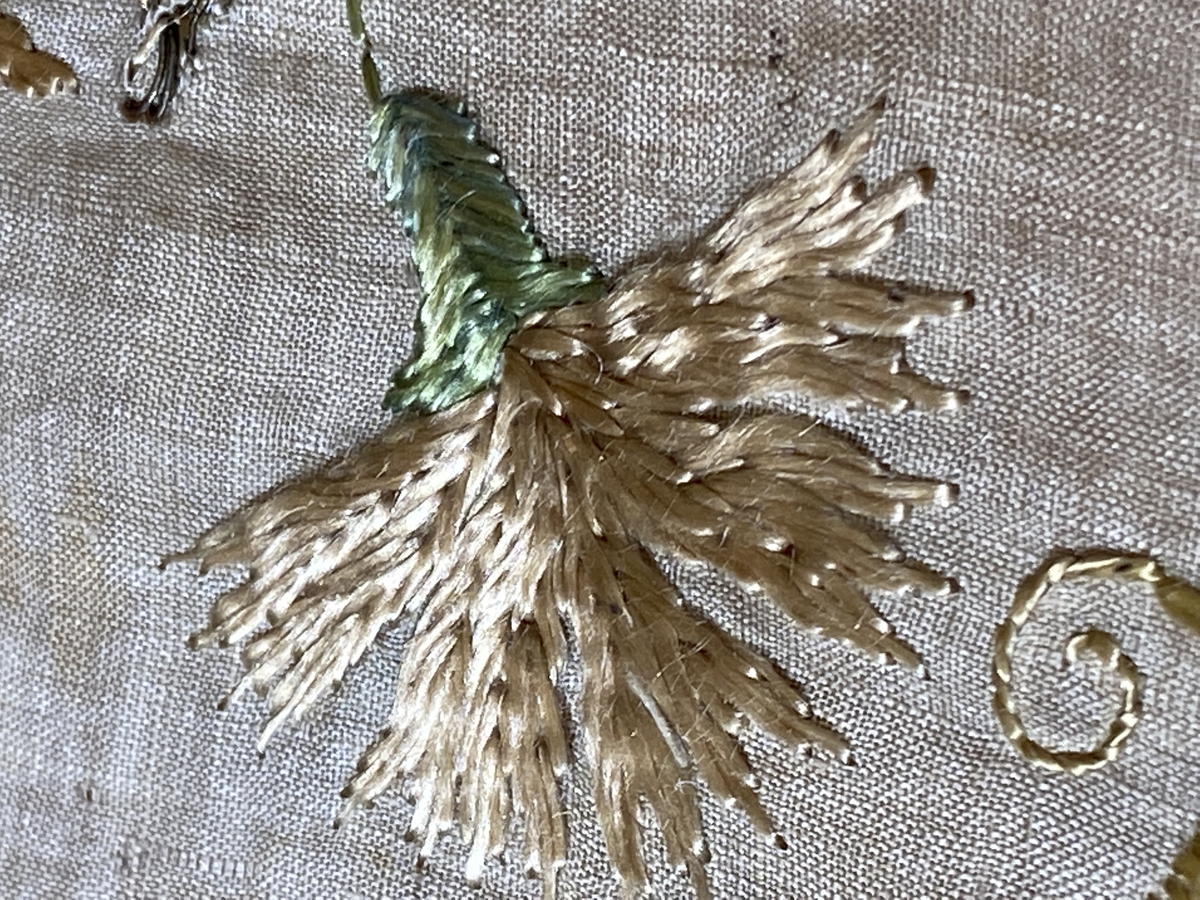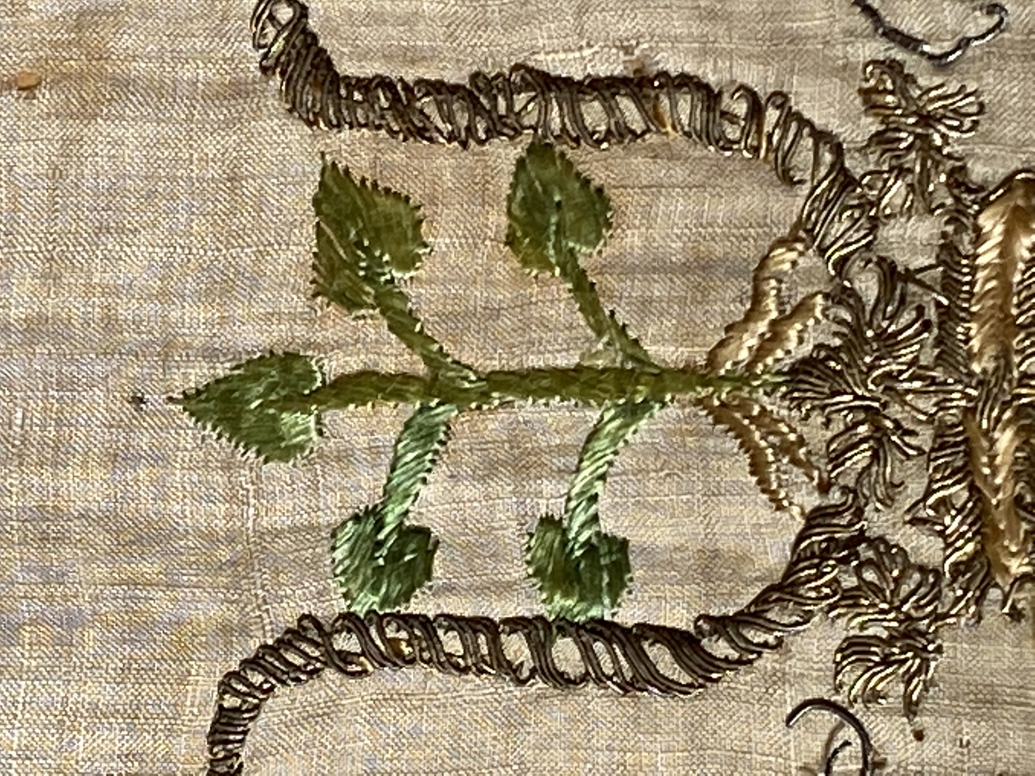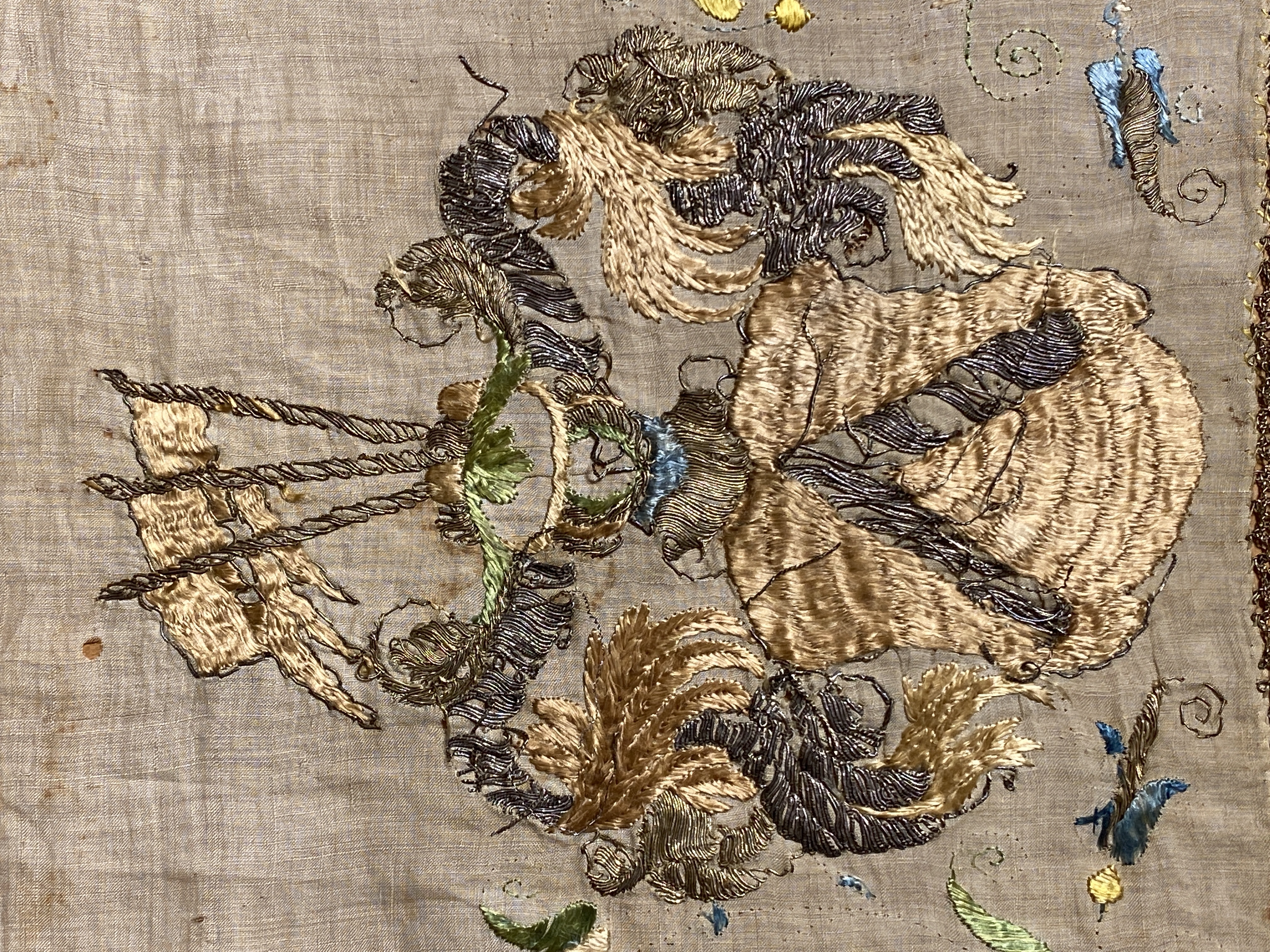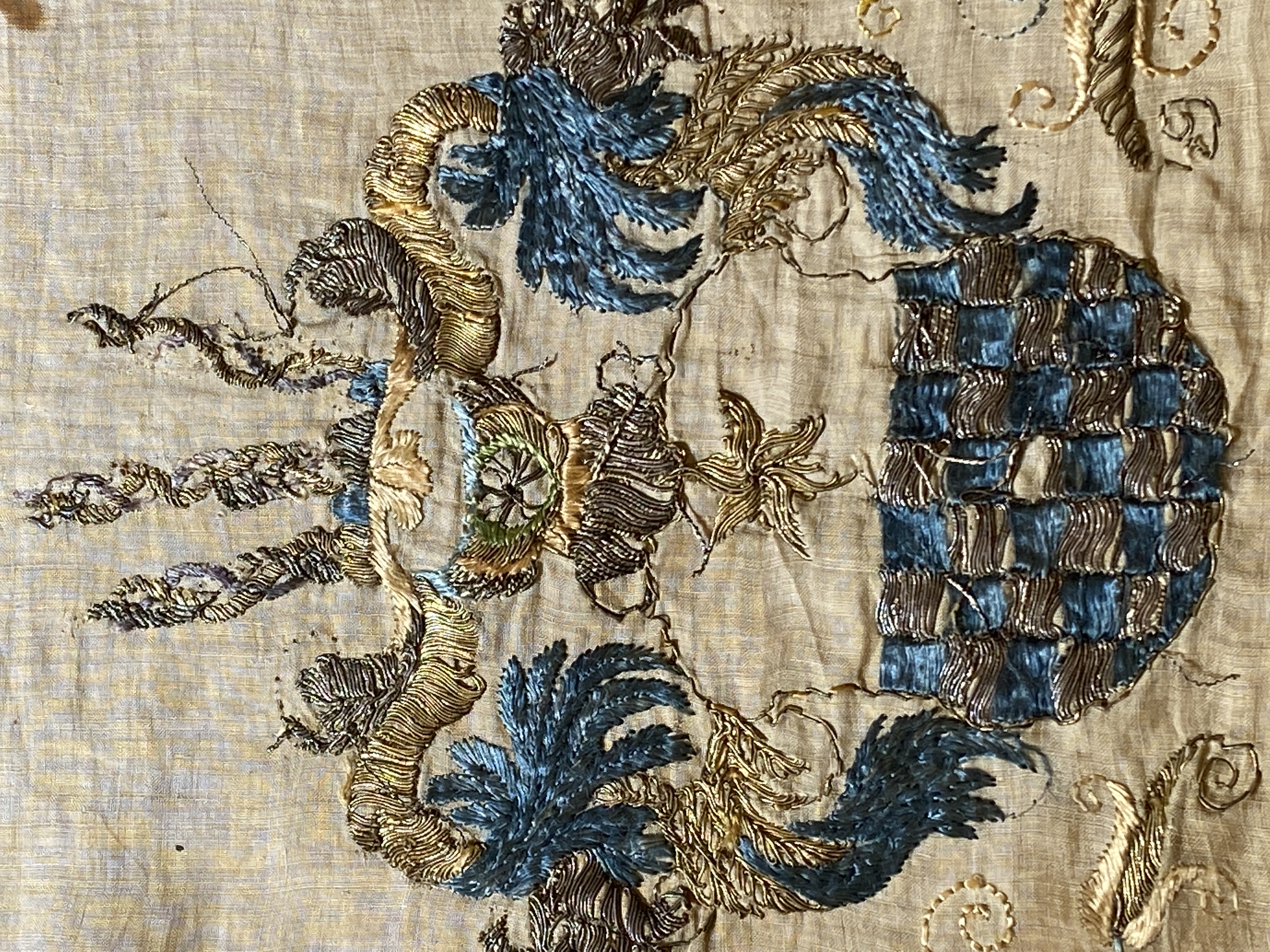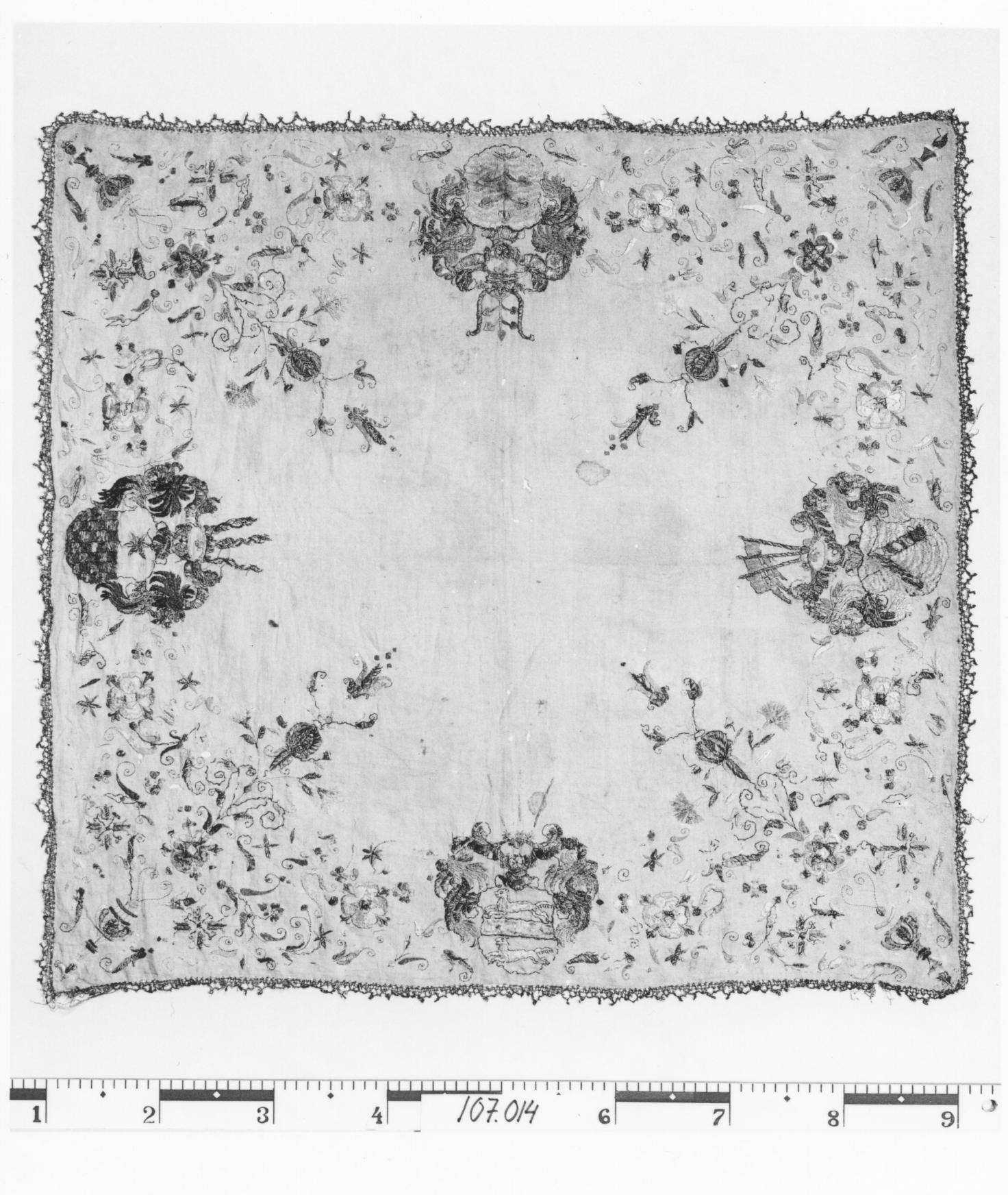 Benvit linnelärft med broderi i guld, silver och silke. I hörnen vaser med blommor, mitt på varje sidan vapensköldar för ätterna Sparre av Rossvik och Ramel, samt ytterligare två oidentifierade släkter.Kantad med knypplad gulduddspets. Ofodrad. Deposition från Nordiska museet 1998 (Nm 107.014).