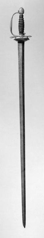 Fäste av reliefornerad, förgylld mässing, tämligen litet och av typ anslutande till det karolinska kommendervärjefästet. Knapp nötformig, ornerad med vertikala räfflor, upptill och nedtill en bladkrans. Nitknapp deformerad (tillplattad). Handbygel tämligen smal, mittpartiet något ansvällt, räfflat, överdelen fäst vid knappen med en skruv genom en uppåtvikt fot.Parerstänger raka, något nedåtriktade och ornerade med sex grunda räfflor, ytterändarna spetsiga. Fingerbyglar små. Parerplåtar små, njurformiga och genombrutna med ett ytmönster av små, fyrsidiga hål, intill krysset på ut- och insidan en bladkrans, utmed kanterna en list. Kavellindning av två parter tämligen tjocka, tvinnade silvertrådar, omväxlande med smala, släta och (utmed sidorna) tvinnade, förgyllda mässingstrådar. Upptill och nertill en krans av tvinnad, tunn, förgylld mässingstråd. Klinga rak, slipad med tre eggar, tidig s. k. halv stukatklinga; utsidans egg förskjuten mot den bakre eggen. Starka delen med etsad ornering, lika på båda sidor: upptill ett blomsterornament, härnedanför Karl XI:s monogram (dubbelt C omslutande ordningssiffran XI) under öppen krona. Inskription i skrivstil i fyra rader: "Viuat carolus Rex Sueciae"; vidare ett biskopshuvud, upptill och nedtill åtföljt av initialerna "P M" (Solingen-mästaren Peter Münnich).
