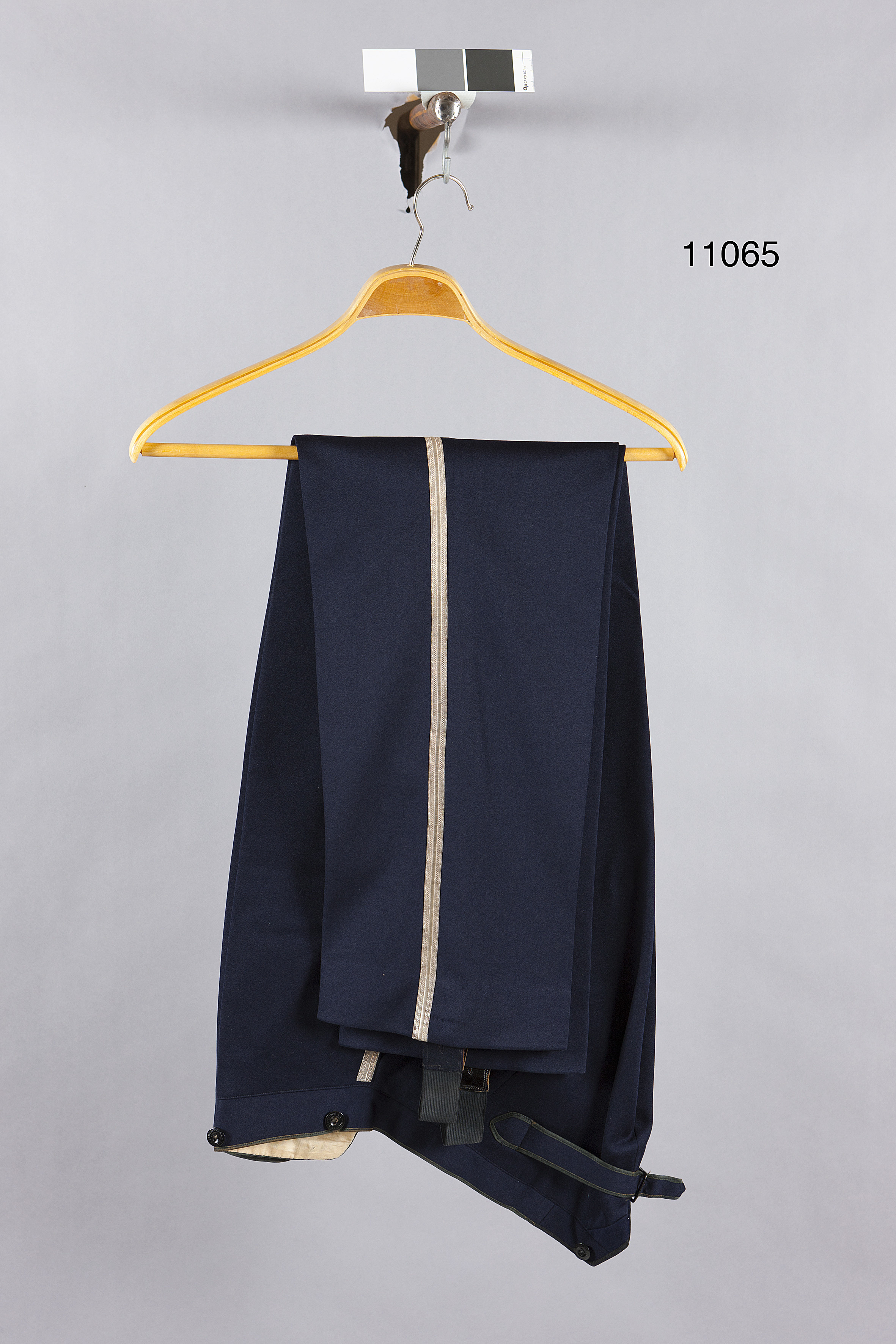 Långbyxor av mörkblå diagonal, knäppta med gylf, med fem knappar, d: 14 mm,med firmamärke: "MILITÄR EKIPERINGS AB".I linningen sju knappar, varv en klädd med svart siden. De övrig alika som föregående m, d: 16 mm. I mittsömmen bak V-format sprund samt spänntampar med rektangulär sölja. Fickor i sidsömmarna, utmed dessa breda silvergaloner. Nedtill hällor av resår fastknäppta på byxbenens insidor. Foder i linningen av vit bomull samt framtill tamp med firmamärke: "Militär Ekiperings AB )) Kungl. Hofleverantör )) Stockholm den 10.10.1912 )) MEA )) Herr HKH )) Prins Eugen".