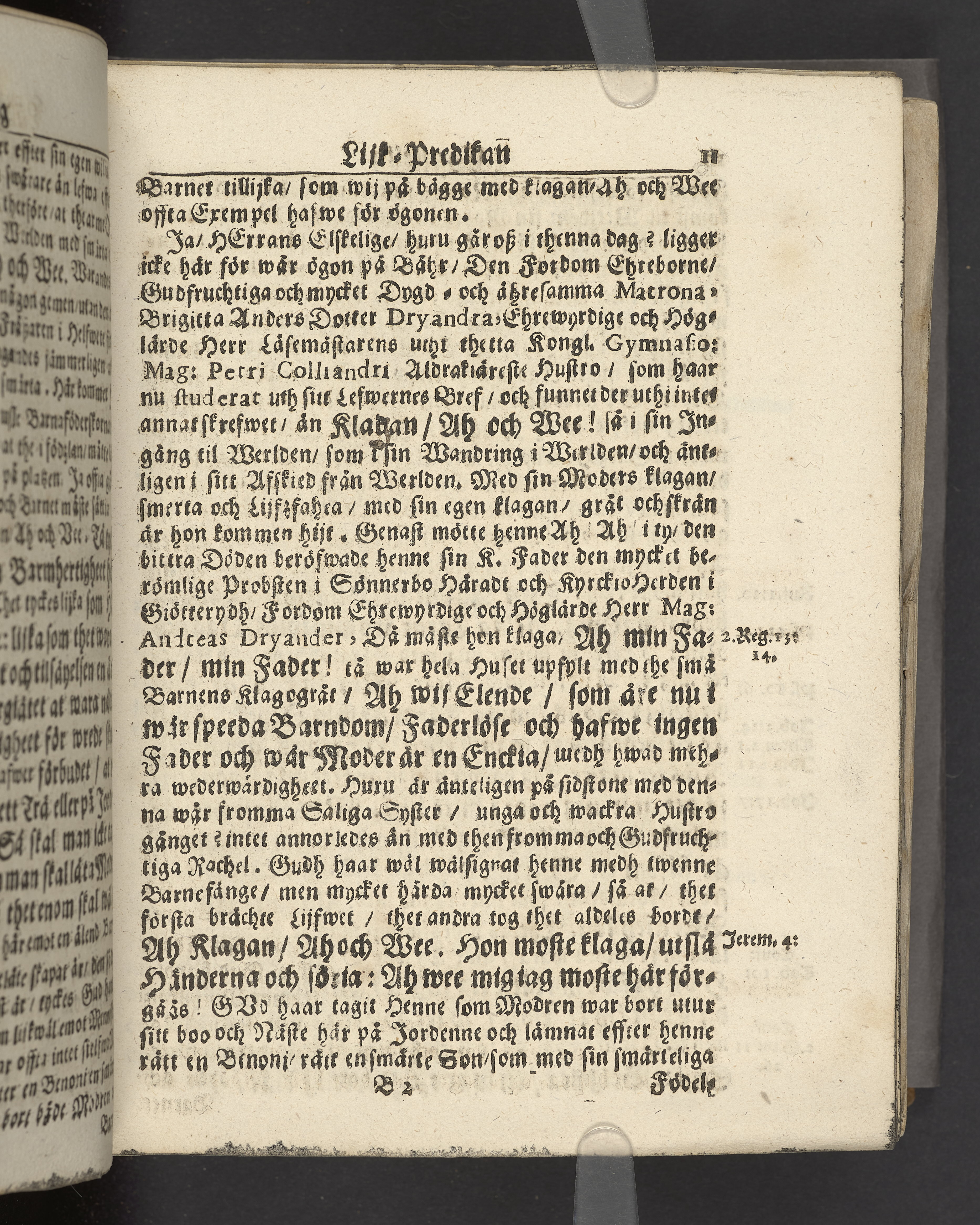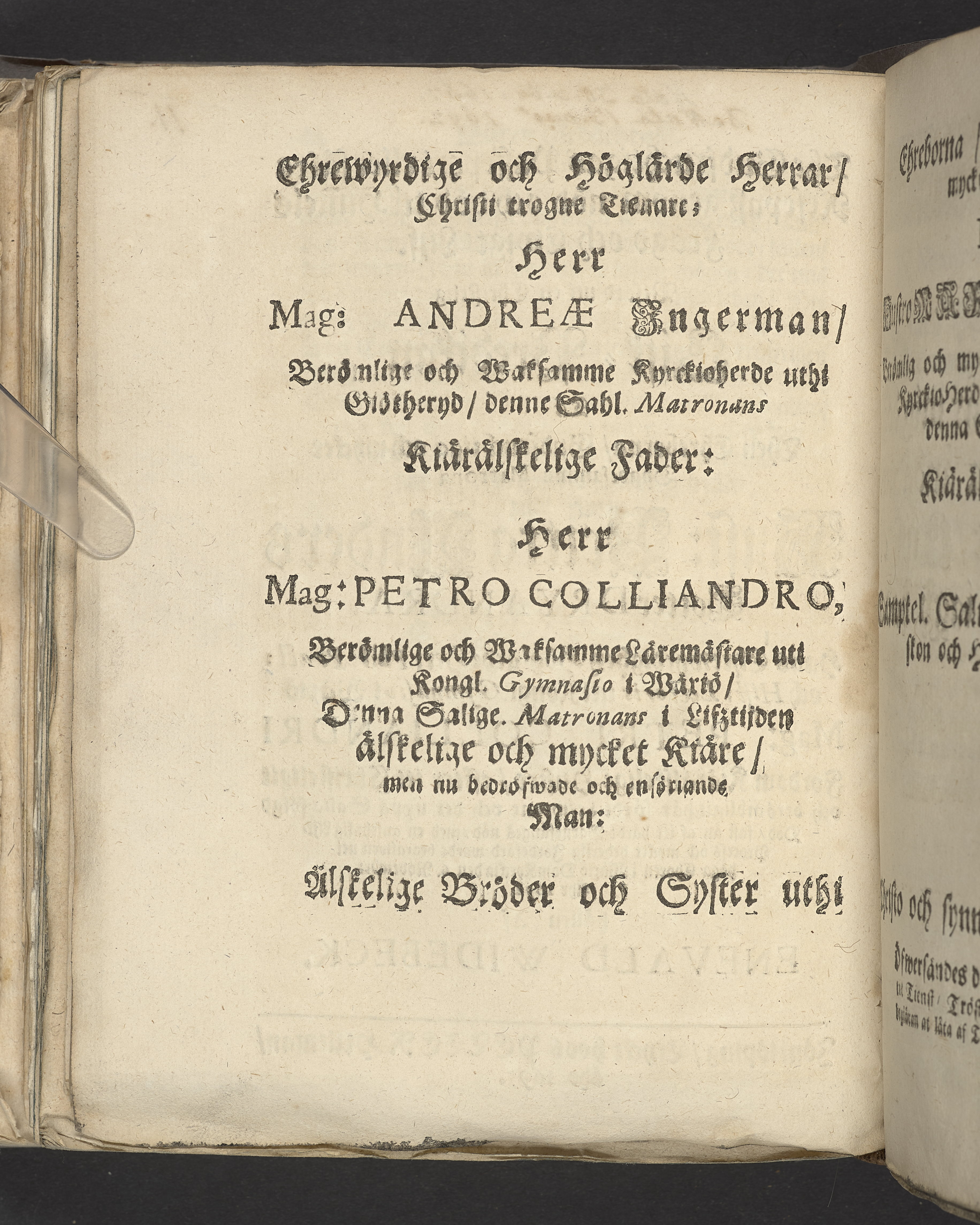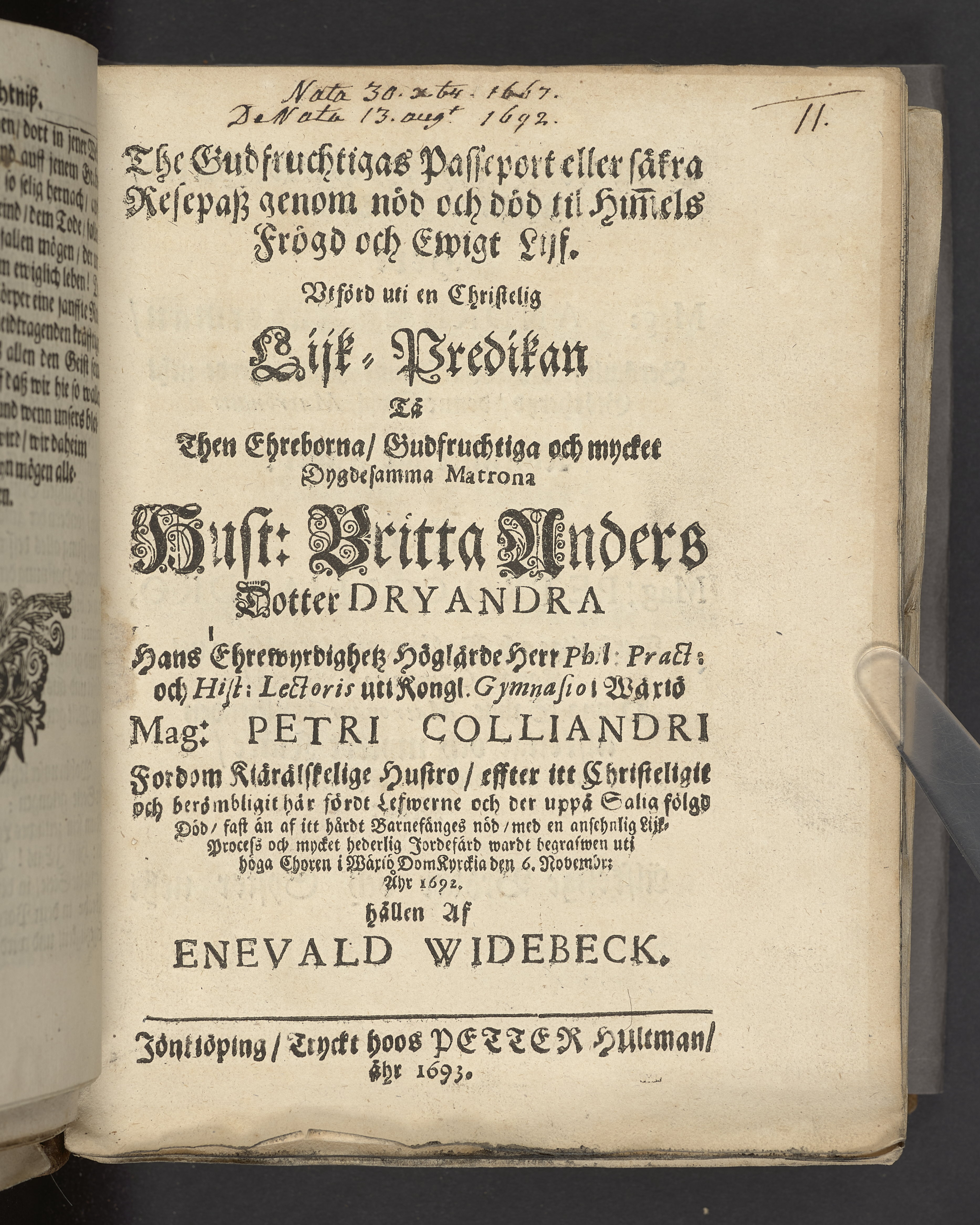 The gudfruchtigas passeport eller säkra resepasz genom nöd och död til him[m]els frögd och ewigt lijf. Vthförd uti en christelig lijk-predikan tå ... Britta Anders dotter Dryandra ... mag. Petri Colliandri fordom kiärälskelige hustro ... wardt begrafwen ... i Wäxiö dom kyrckia den 6. novembr. åhr 1692. Hållen af Enevald Widebeck. Jönkiöping, tryckt hoos Petter Hultman, åhr 1693.