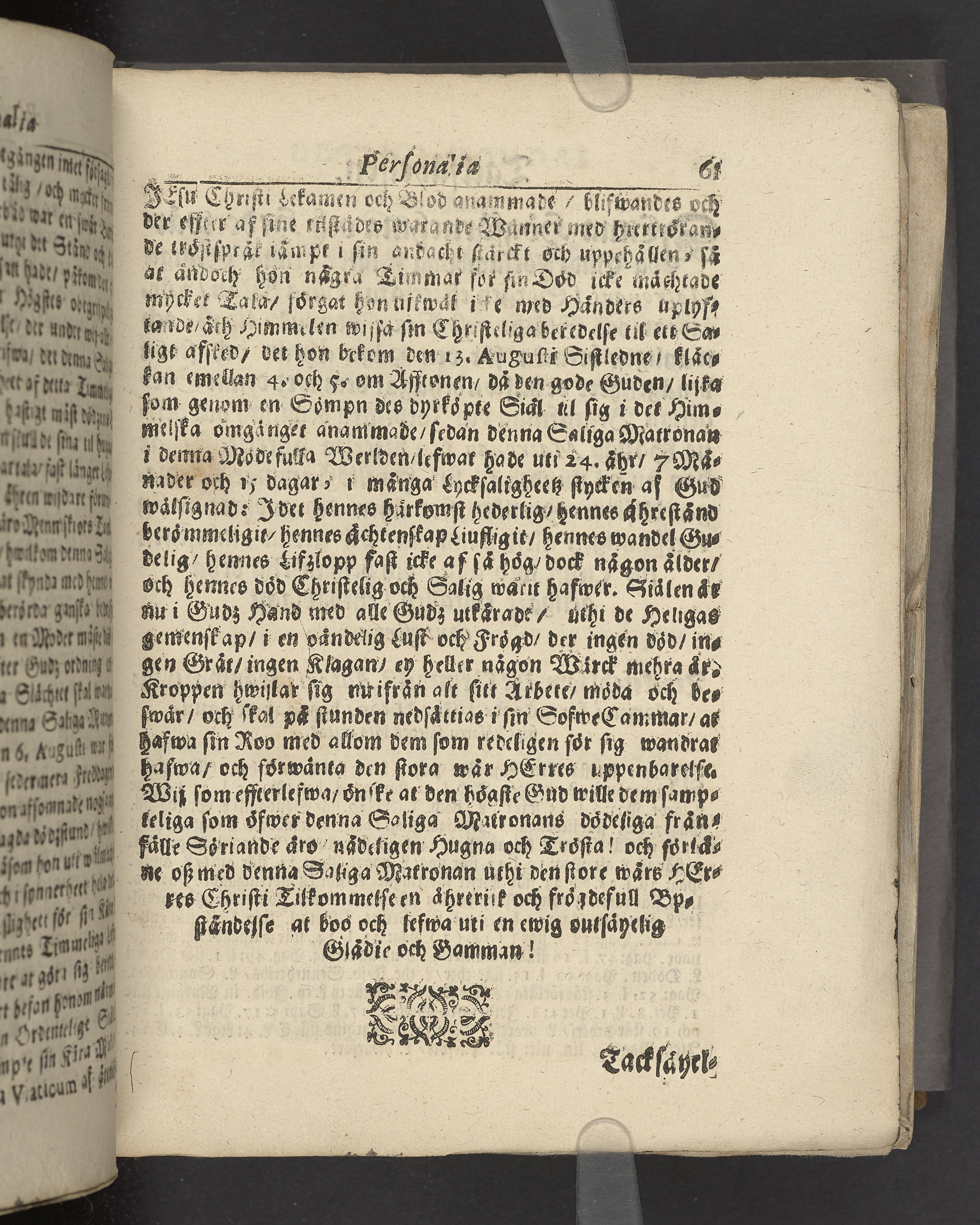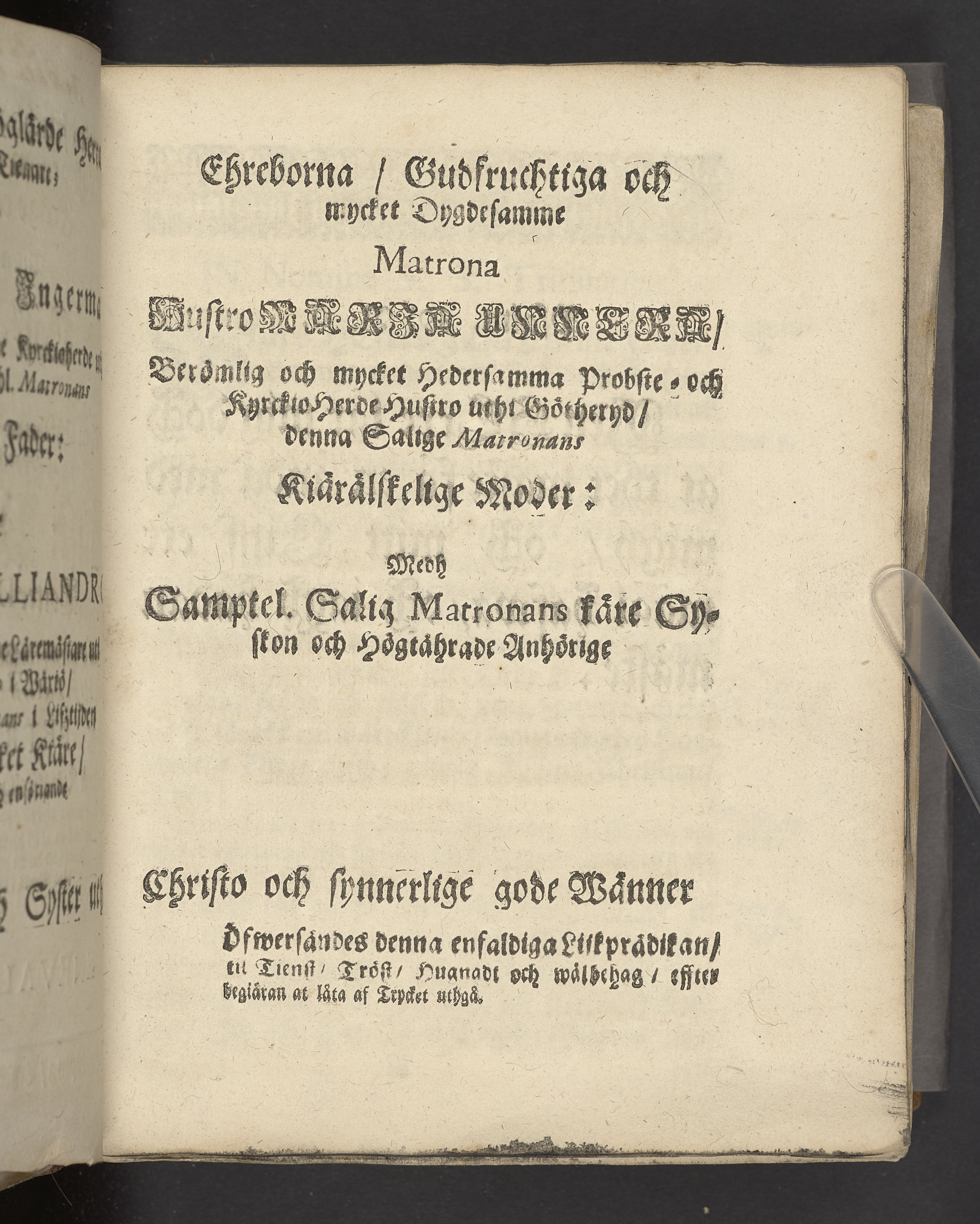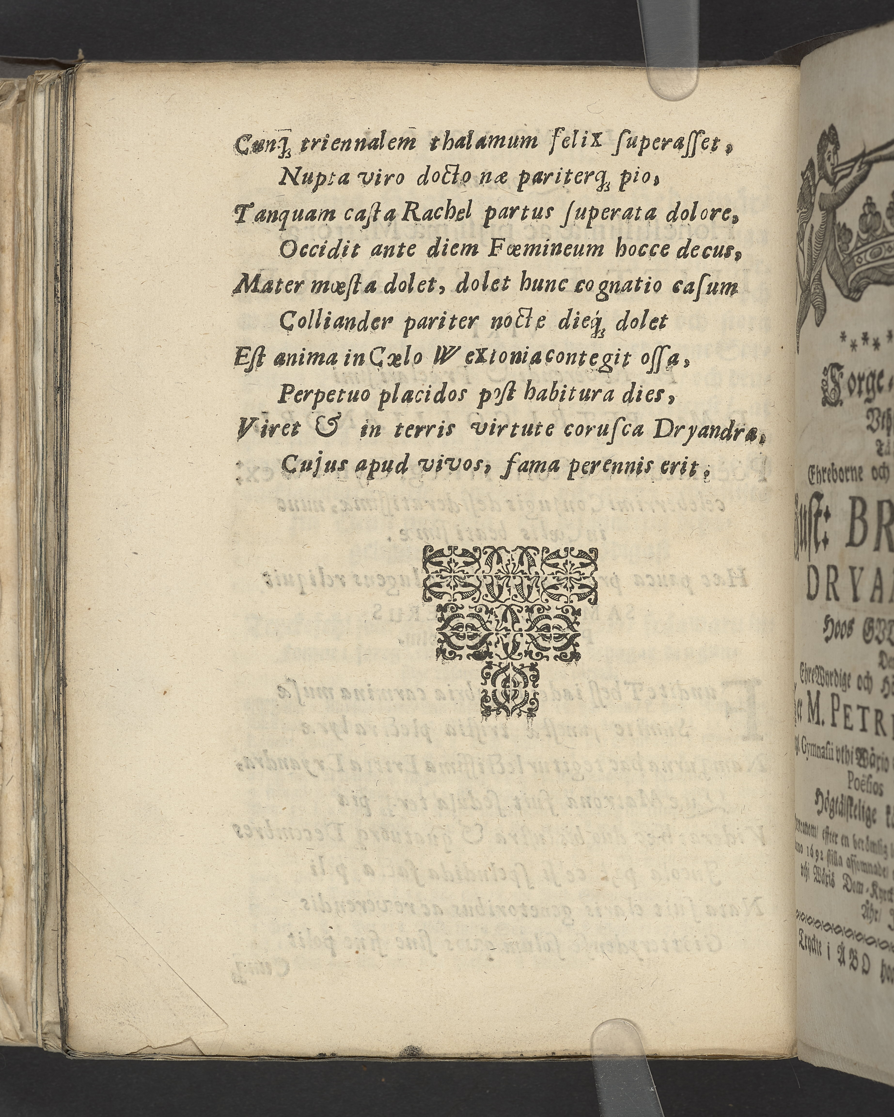 The gudfruchtigas passeport eller säkra resepasz genom nöd och död til him[m]els frögd och ewigt lijf. Vthförd uti en christelig lijk-predikan tå ... Britta Anders dotter Dryandra ... mag. Petri Colliandri fordom kiärälskelige hustro ... wardt begrafwen ... i Wäxiö dom kyrckia den 6. novembr. åhr 1692. Hållen af Enevald Widebeck. Jönkiöping, tryckt hoos Petter Hultman, åhr 1693.