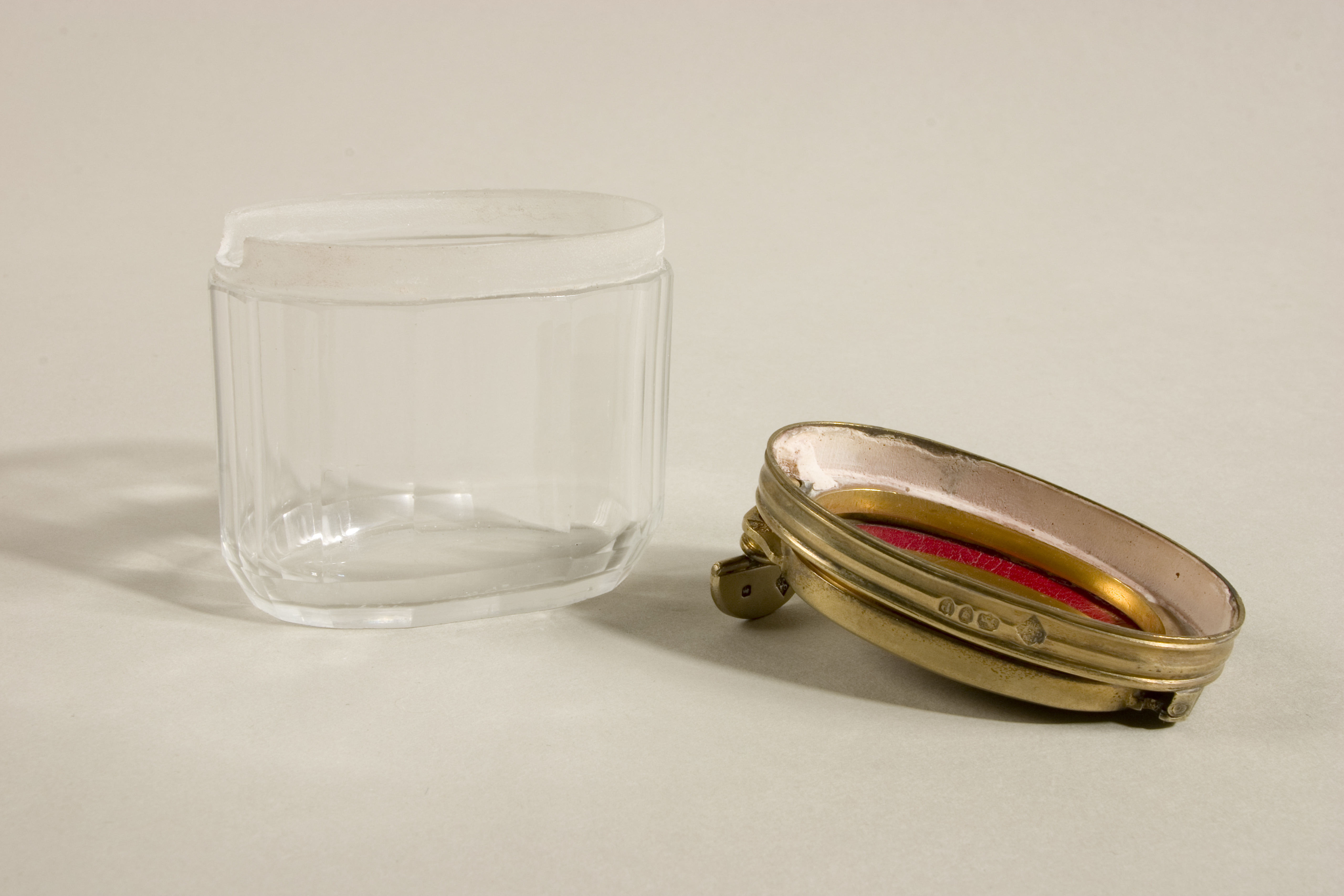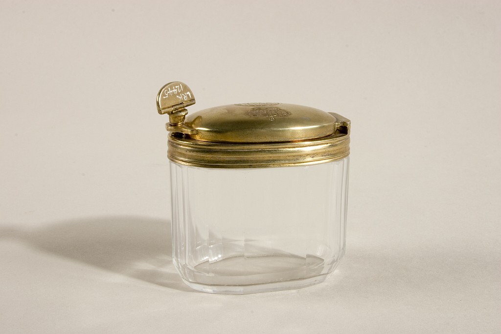 Oval glasburk med plan botten och fasetterade sidor som avfasats vid botten. Påträtt, förgyllt silverlock med gångjärn och en skruv som lås. Inuti är locket klätt med rött läder och en stor oval platta som håller en korkskiva på plats. På den förgyllda silverskruven som har ett nedvikbart handtag, instämplat lejonmärke och i en romb: G B // C J R // J B. På övriga delar av locket följande stämplar: i en romb: G B // G W B // J B, ett lejon i en vapensköld i en oval och ett P (1890) i en vapensköld. På locket graverad krönt ring med: VICTORIA. I undre locket grå limmassa.