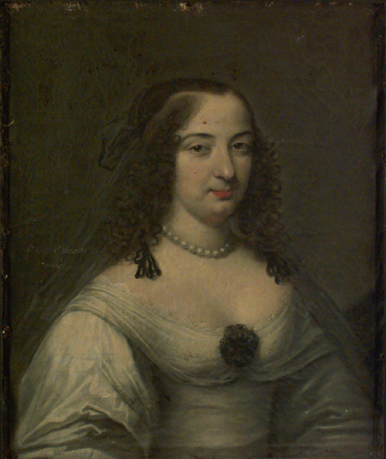 Långt brunt hår, vit urringad klänning med svart spetsrosett vid ringningen. Grå bakgrund. Senare inskrift: “ Kon Carl Stuart Gemål”. Bak på duken med svart färg “N 58 EL”. På spännramen med bläck “Konung Carl Stuart Gemål”. På ramen liten fyrkantig lapp: “N 5”? Stiftad spännram. Svart profilerad ram, bredd 75 mm.