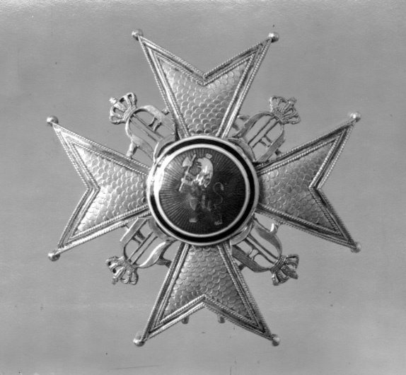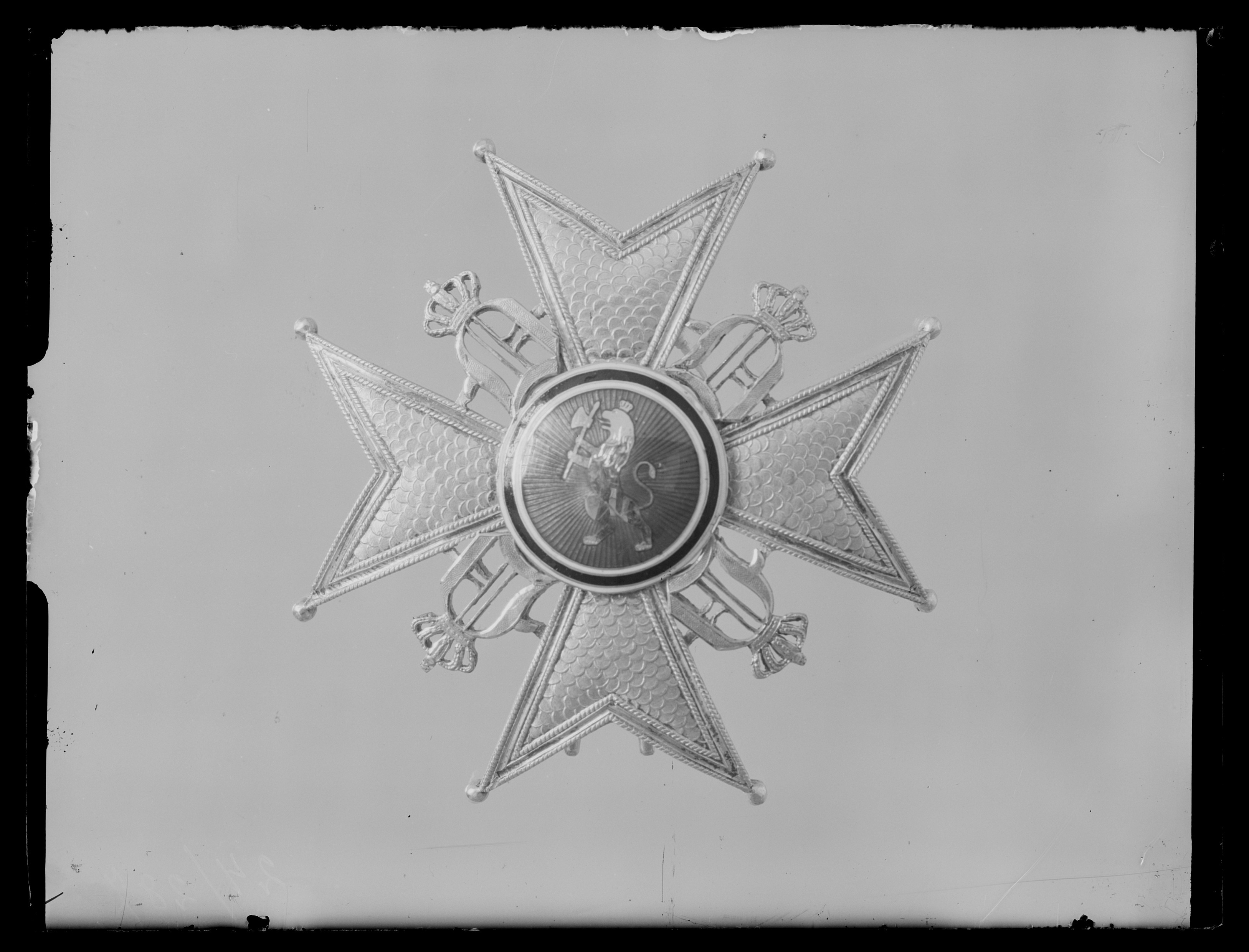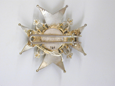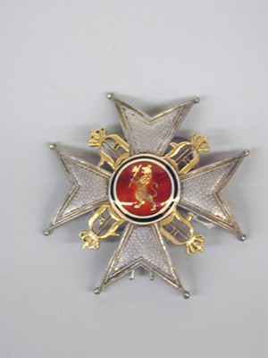 Malteserkors av silver, slät fiskfjällsdekor på armarna, dubbel repstavskantbård, kulor på spetsarna. Mellan korsarmarna krönta anglosachsiska O:n, täckta av guldbleck av samma form, fästade på baksidan med vardera tre omböjda piggar. Välvd medaljong täckt med röd, genomsynlig emalj, däri krönt lejon av guld med guldyxa i framtassarna, vit-blå-vit kantbård. På baksidan säkerhetsnål av silver.