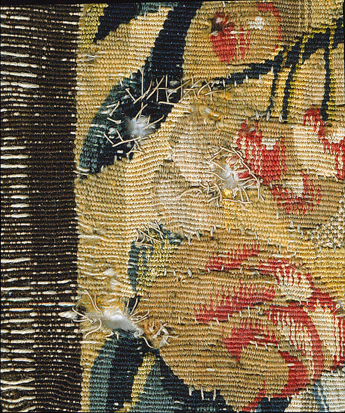 Ingår i en svit bestående av fyra vävda tapeter. Verdurer med små figurframställningar av ylle i gobelinteknik, 5 - 6 trådar per kvadrat cm. Bård av blommor och frukter. I övre och nedre bården blå respektive röd kartusch. Bryssel.