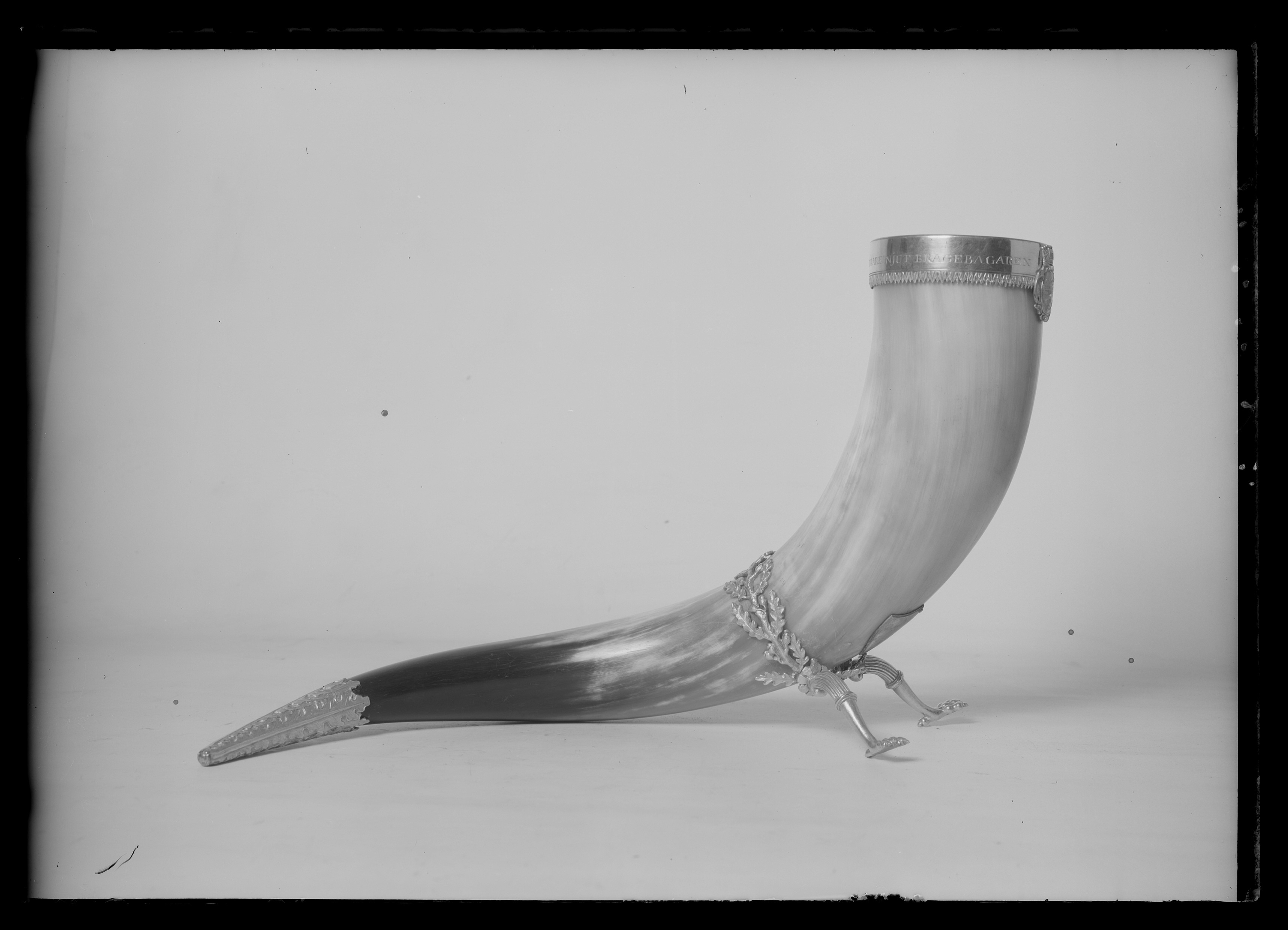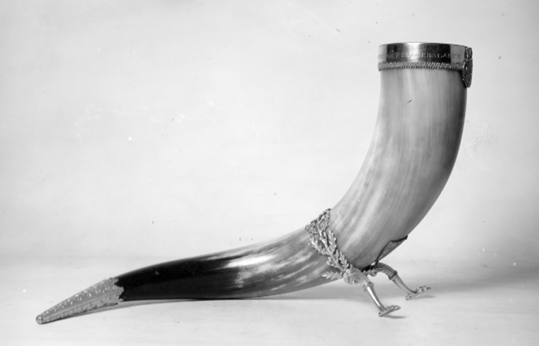 Stort dryckeshorn med förgyllda silverbeslag. Nötkreaturshorn, spiralvridet i s-form, grågult mot spetsen nästan svart. Insidan klädd med förgyllt silver vikt i krage över kanten, avslutad med en ciselerad bladbård. Runt bredden graverat: "NJUT BRAGEBÄGAREN KRAFTENS, SUNDHETENS OCH NÖJETS BEFODRARE !" Texten delad av reliefkartusch på kragens framsida, krönt med kronprinskrona, omslutande ciselerad oval i vars övre hälft ett spegelmonogram av ett kursivt G, i det nedre fältet en älg. Mellan fälten en horisontal bård graverad: "ORNÖ JAGTKLUBB". Hornet stöder på två gripfötter, vilka utgår från en runt livet gående eklövskrans av förgyllt silver. På framsidan omedelbart ovanför kransen en fastnitad sköld av förgylld mässing varpå graverat: "Till // Ornö jaktklubb // från // Figge Lagerfelt // 18 14/4 95". Hornets spets med en skoning av förgyllt silver - skoningen ornerad med relief i form av långsträckta flikiga ekliknande blad.