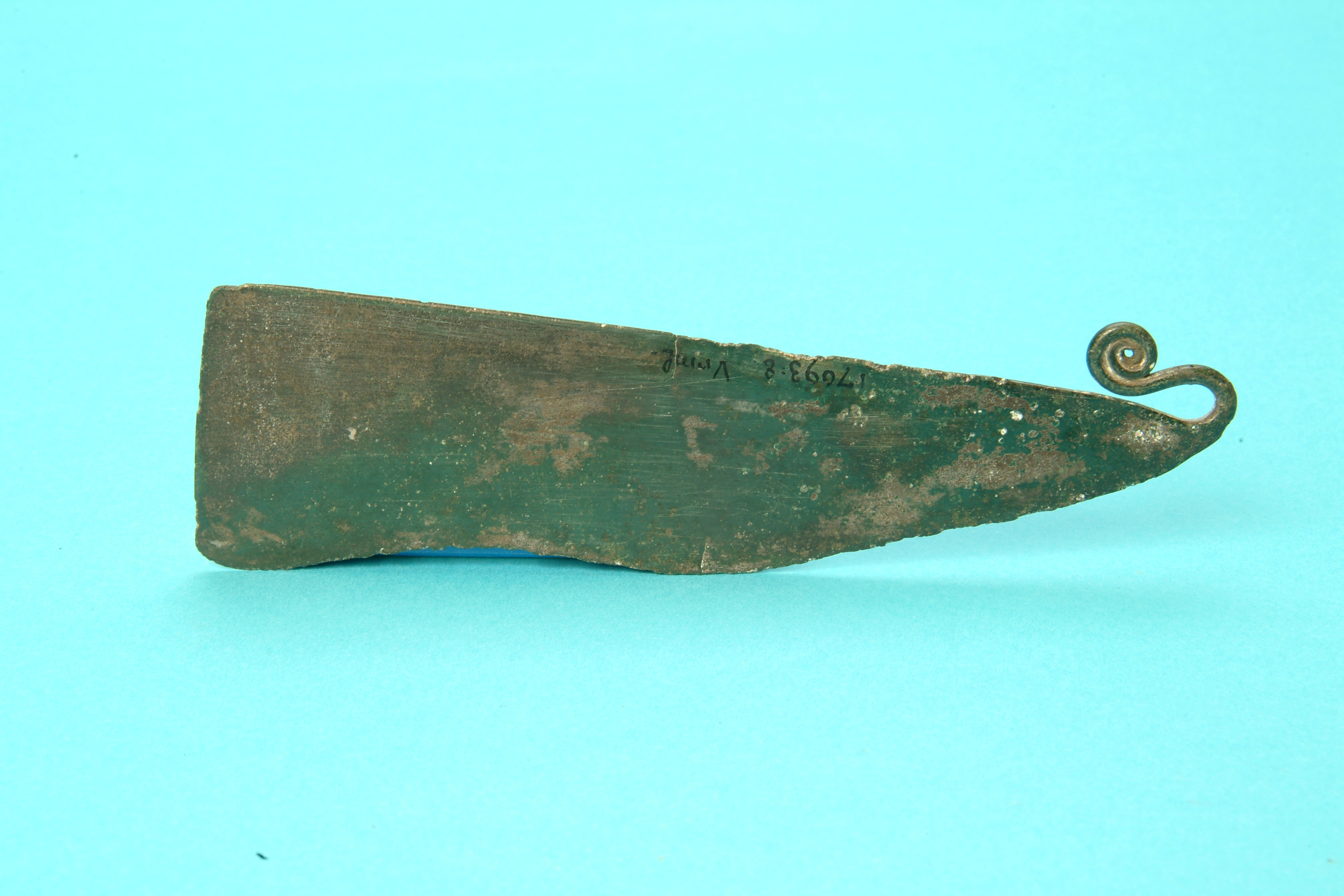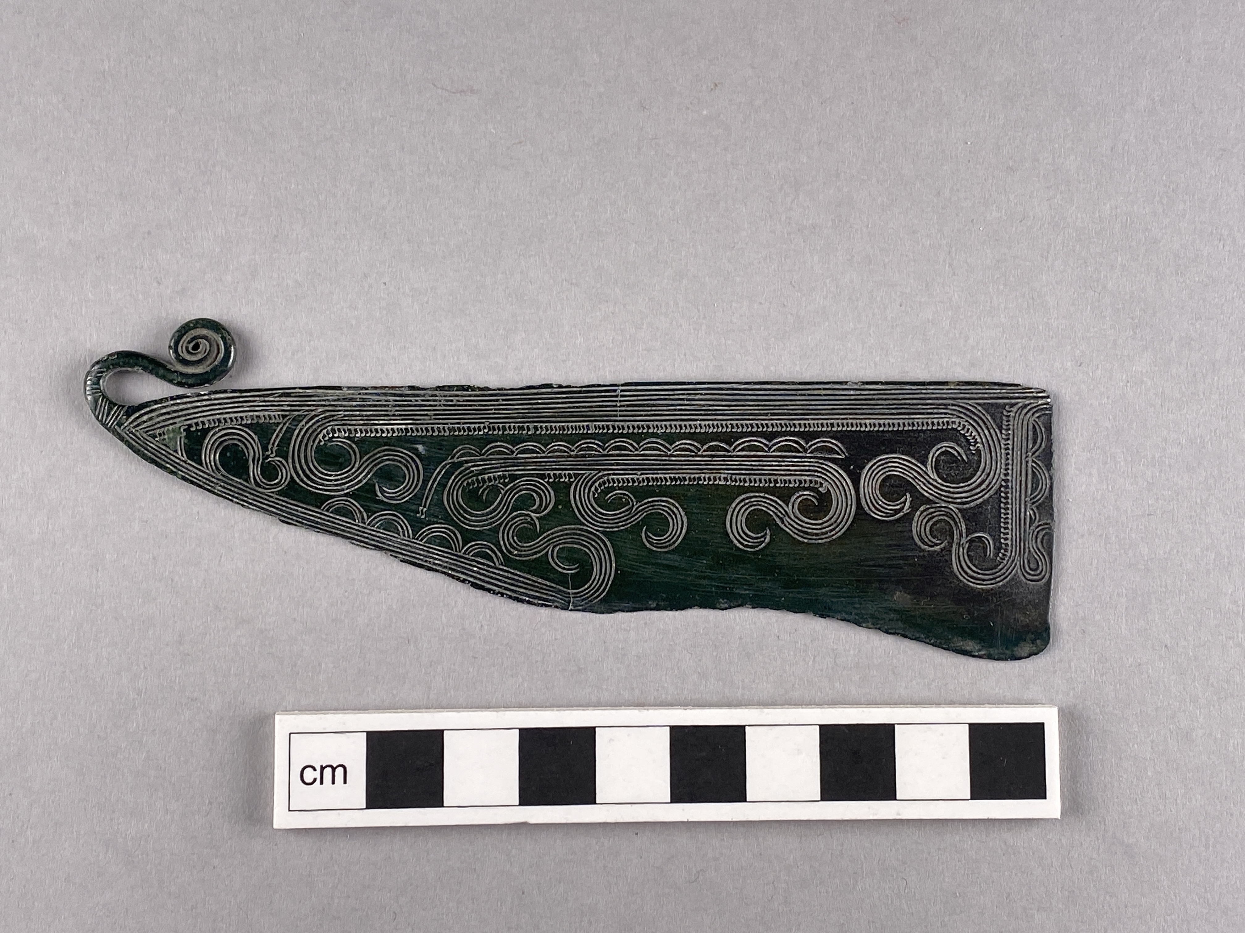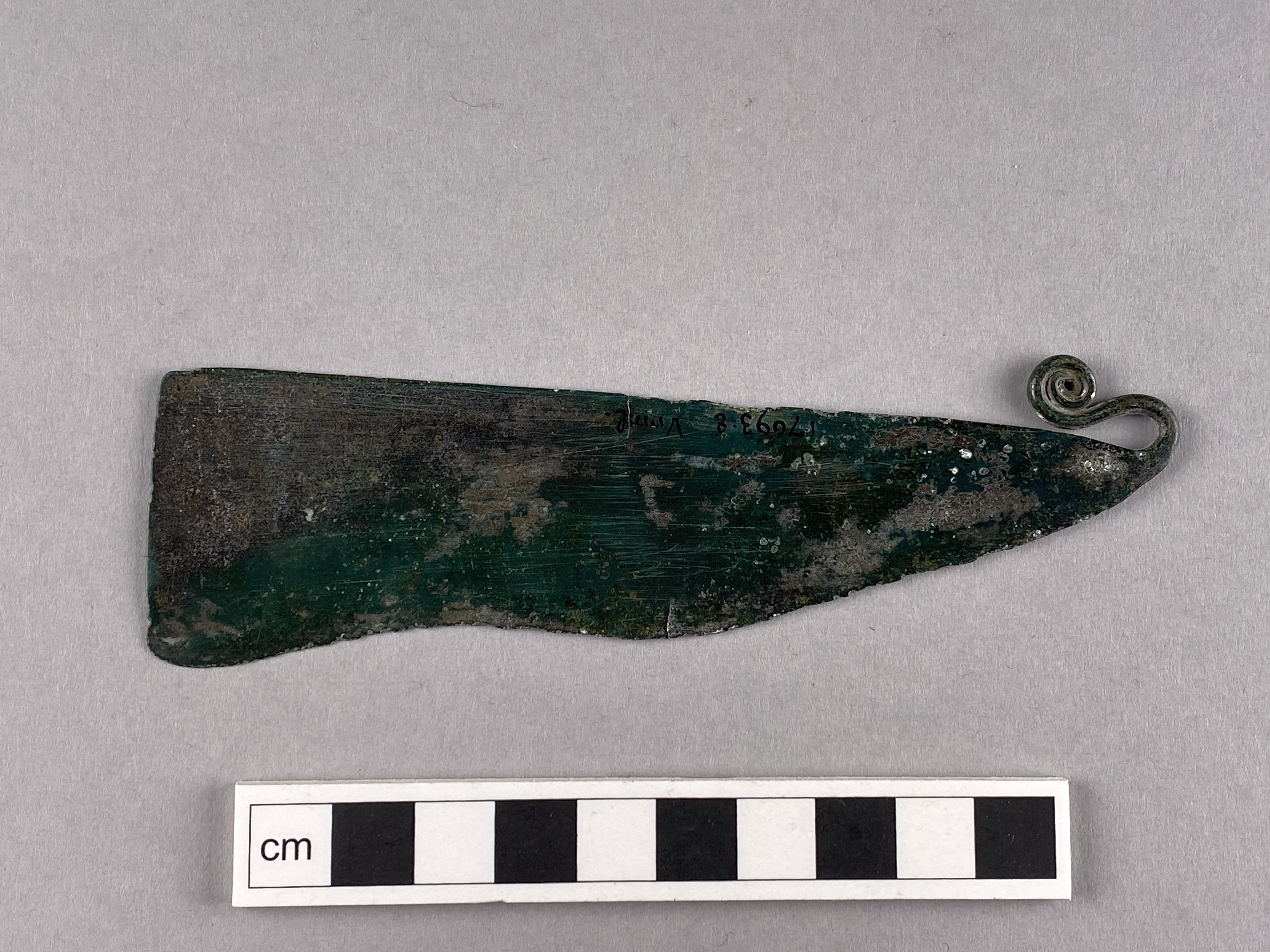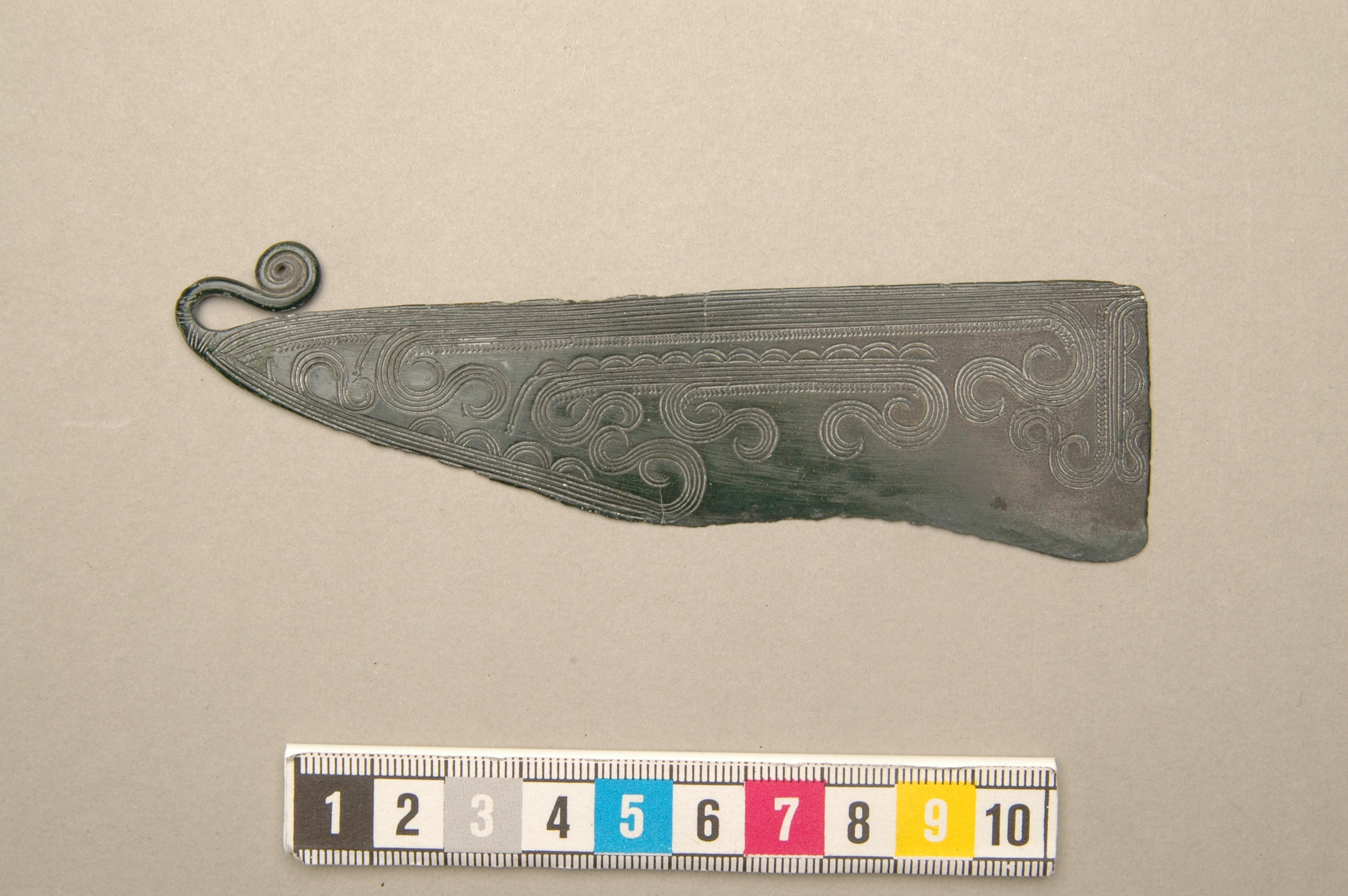 Rakkniv av brons med spiralupprullat fäste. Ornerat vid basen på ena sidan med två grupper av tvärgående streck. Kniven är framtill tvärt avskuren, rygglinjer är rak. Eggen, vilken omfattar halva kniven är svagt konkav och tydligt uppslipad. Ena sidan är rikt ornerad med linjeband, rader av små s-formiga figurer och små halvbågar med 1-3 linjer, bildande stiliserade skeppsfigurer.
