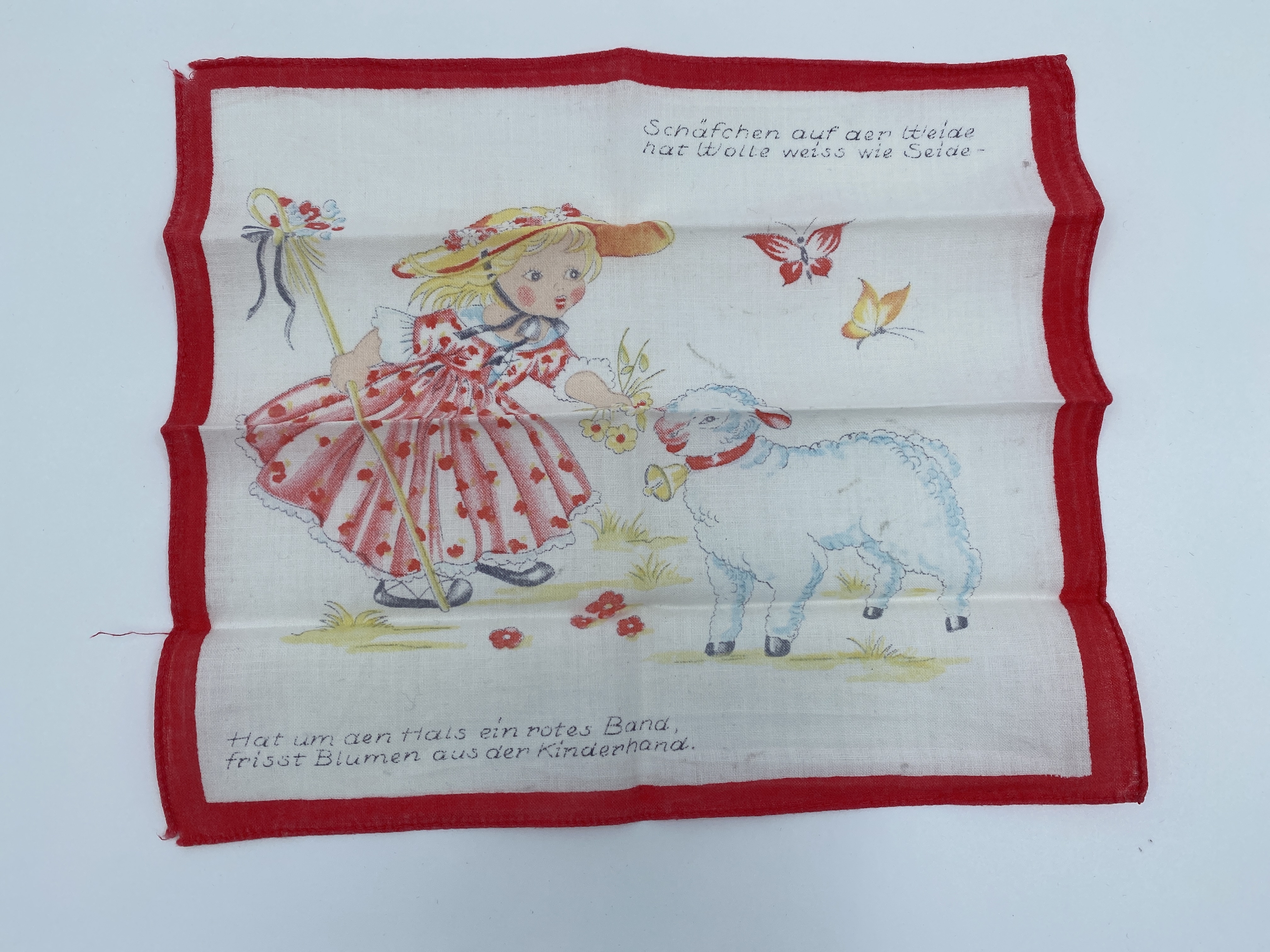 Barnnäsduk i bomull med motiv föreställande en flicka med herdestav klädd i mönstrad klänning tillsammans med ett lamm. I över och nederkant finns en verstext på tyska. Troligen del av Marion Loewes packning då hon kom till Sverige med kindertransport.