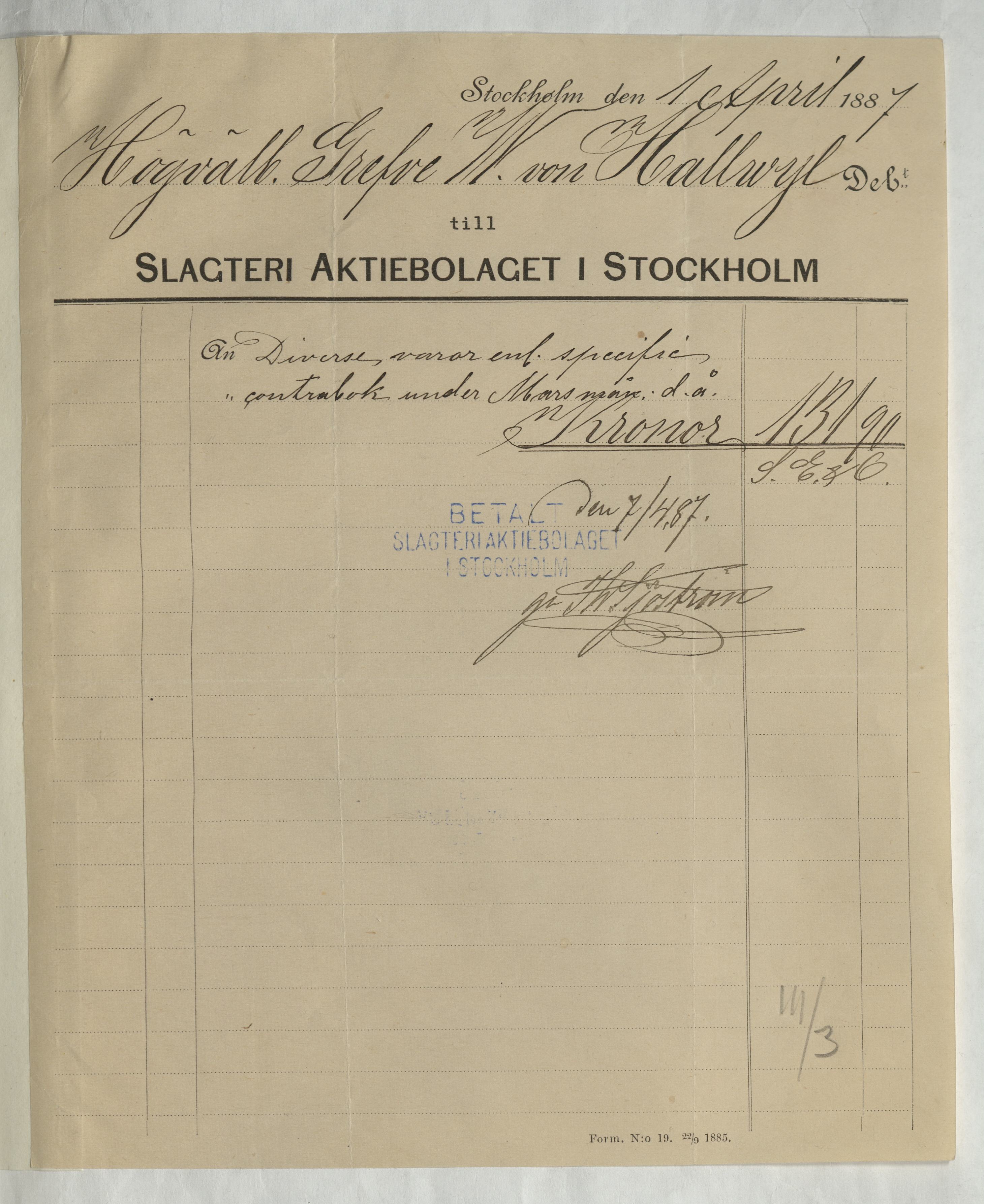 Kvitto från Slagteri Aktiebolaget i Stockholm