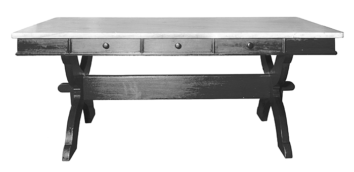 KÖKSBORD Med fotställ av ek och skiva av marmor. Rektangulärt; bonat. Fotstället bestående av två korskryss med bågformiga armar, kryssen sammanhållna av en kantställd grov slå med kälade kanter samt gående genom vartdera krysset med en tapp, som på kryssets utsida är försedd med en genom tappen gående kil. Ovanpå fotstället en lös sarg, vari på vardera långsidan tre lådor, varje med en svarvad knopp av trä; längs sargens nedre kant samt mellan lådorna en stavlist (s. k. platt och stav). Skiva av gråflammig vit marmor. Höjd: 79 cm, utan skiva 76 cm, Längd: 1,94m.; bredd: 91,5 Skiva, längd: 2 m.; bredd: 97 cm.; tjocklek 3 cm. Förfärdigat efter beställning, genom Hallwylska husets byggmästare Olof Mattsson, av snickaren Magnus Pettersson. Marmorskivan inköpt 1898 hos W. Jagdmanns Mekaniska Stenhuggeri, Stockholm.