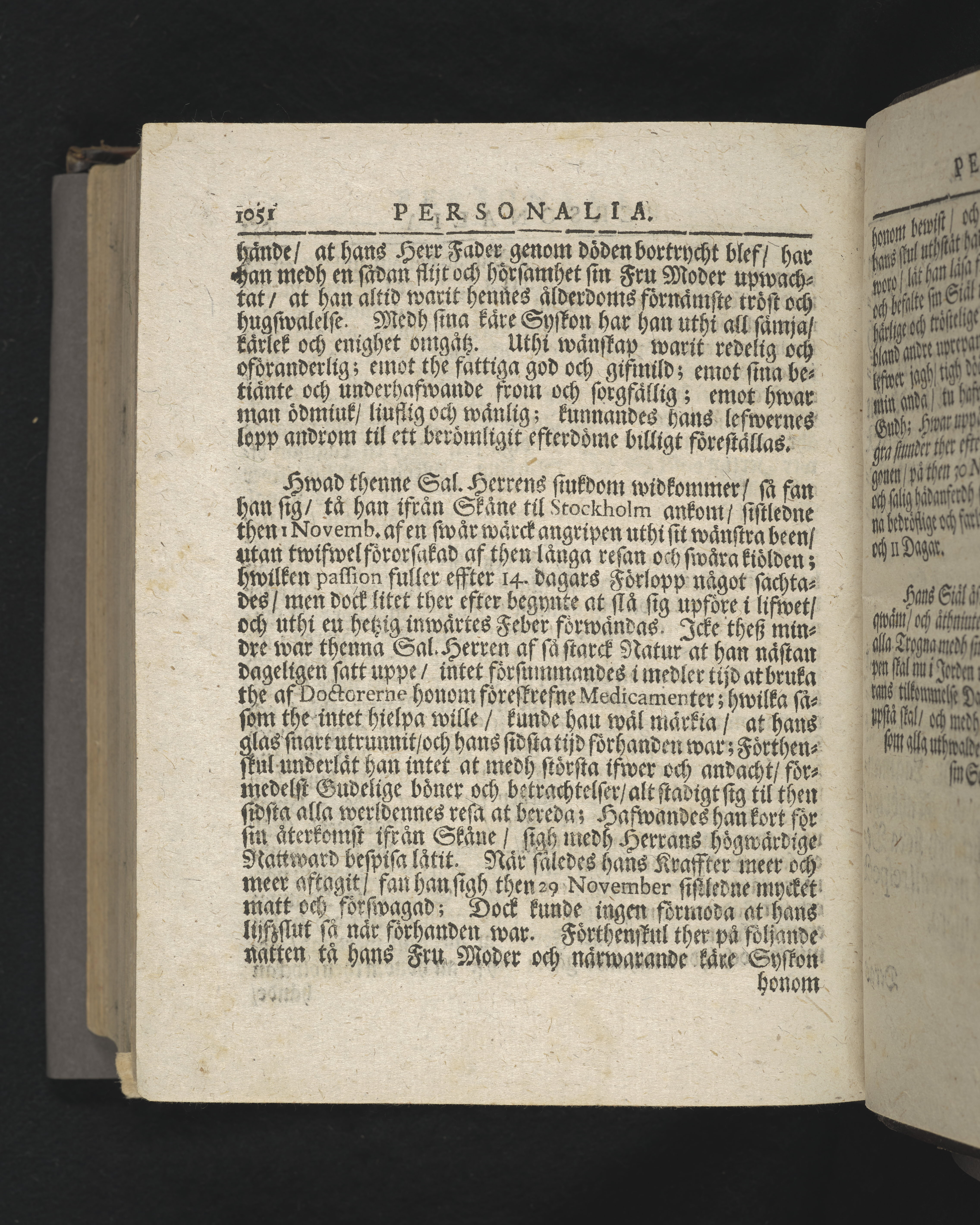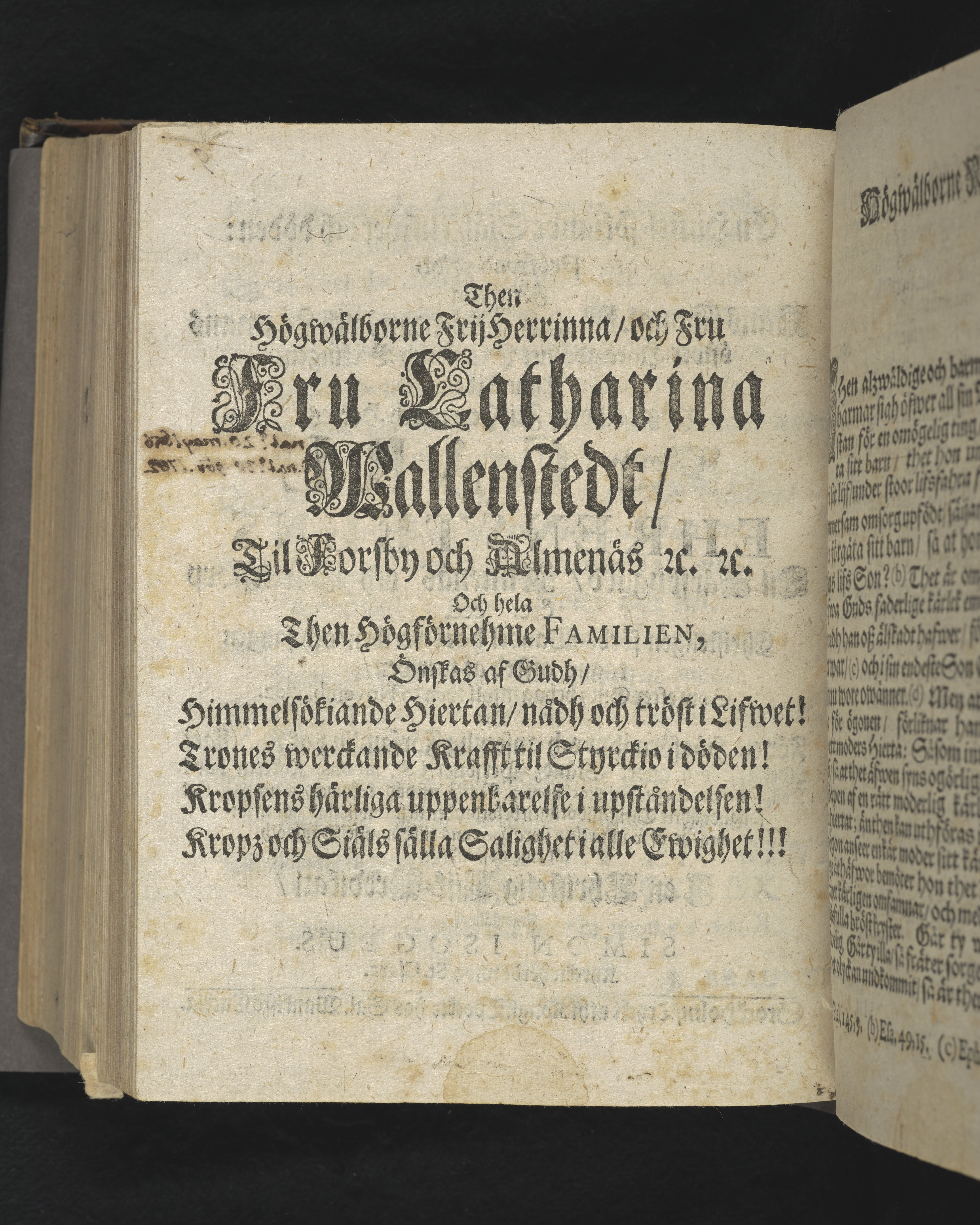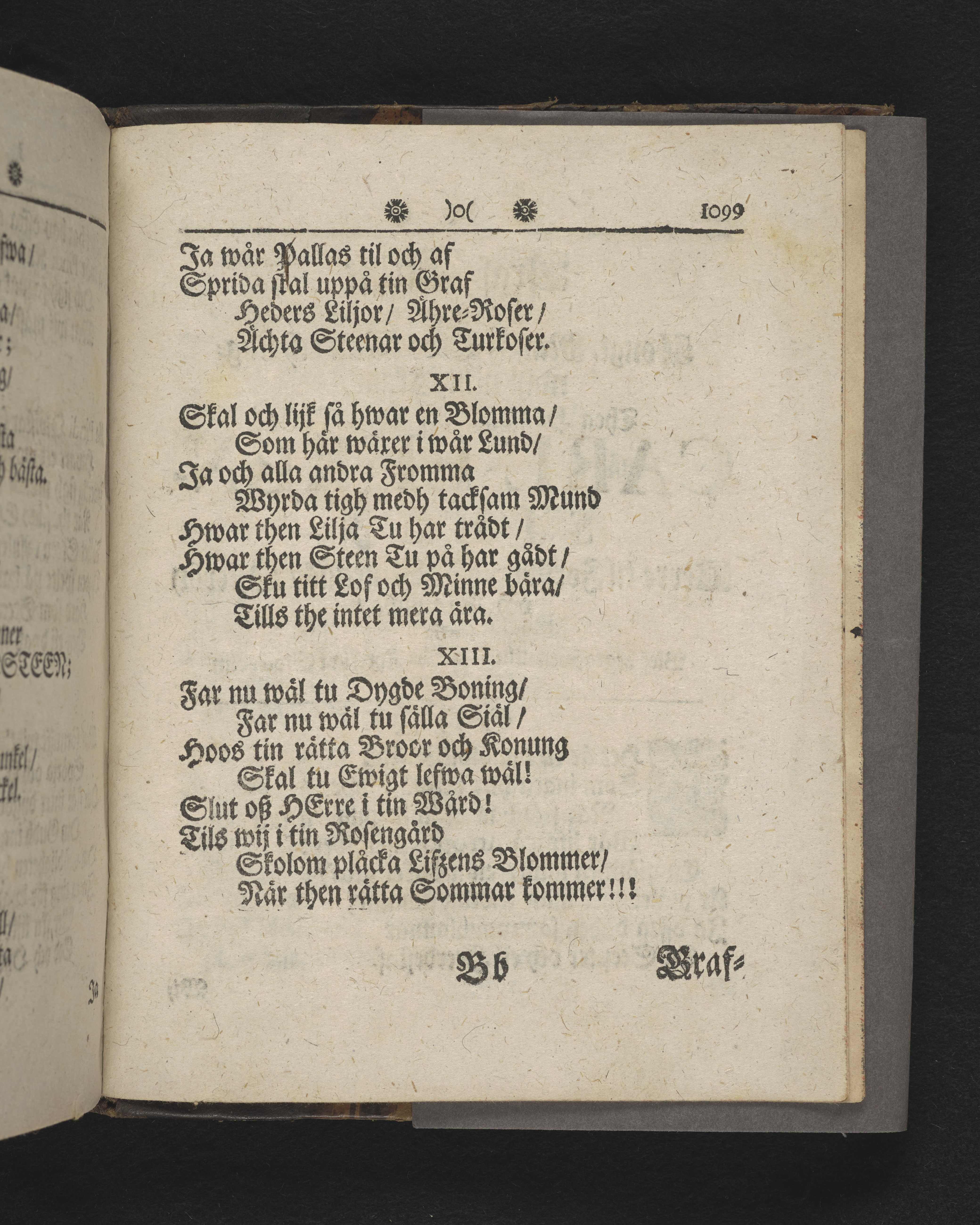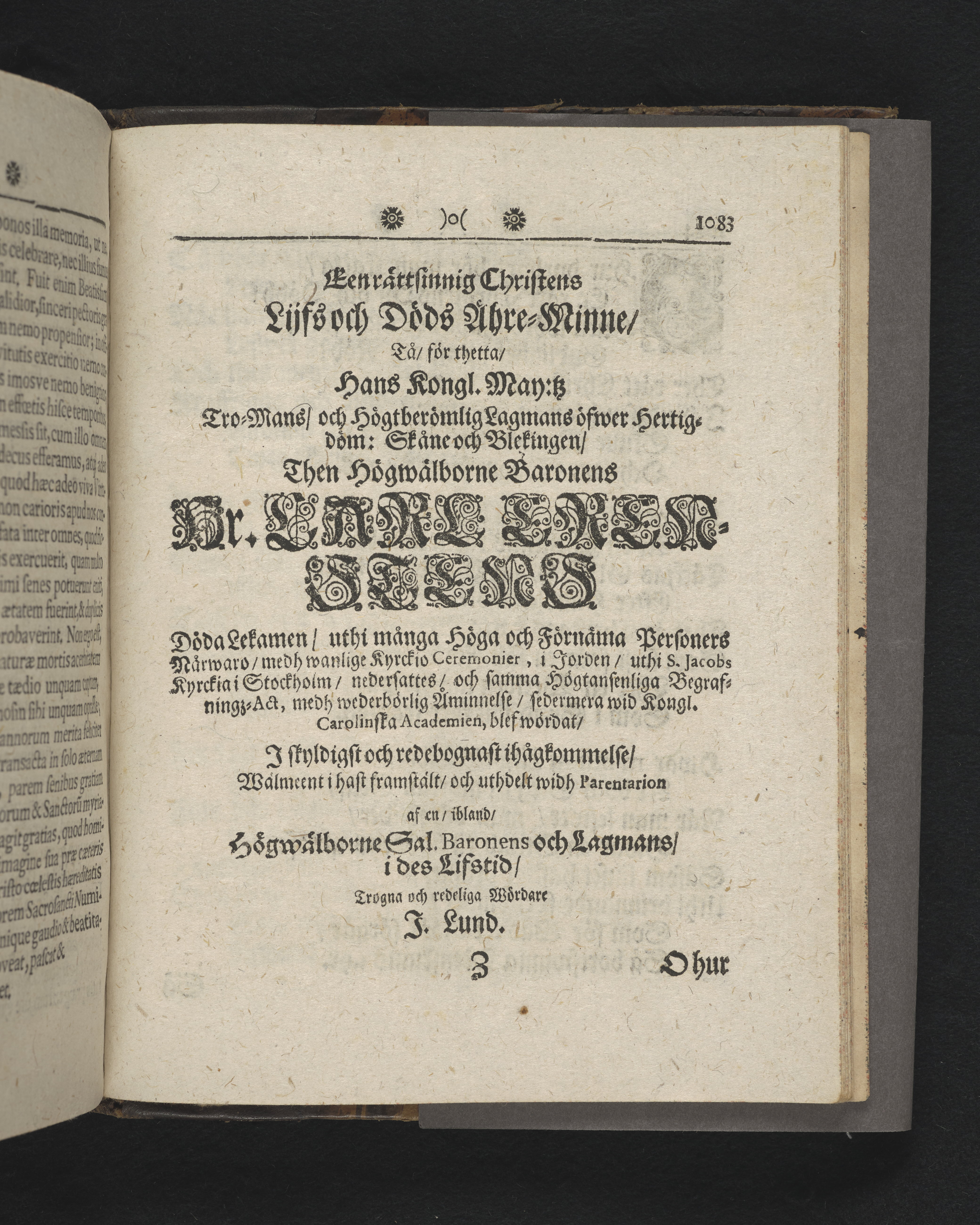 Innehåller förutom Isogaeus likpredikan med personali även gravtal och dikter undertecknade Thomas Ihre, I. Lund, Andreas Stobaeus, A. Riddermarck, J.G. Werwing.
