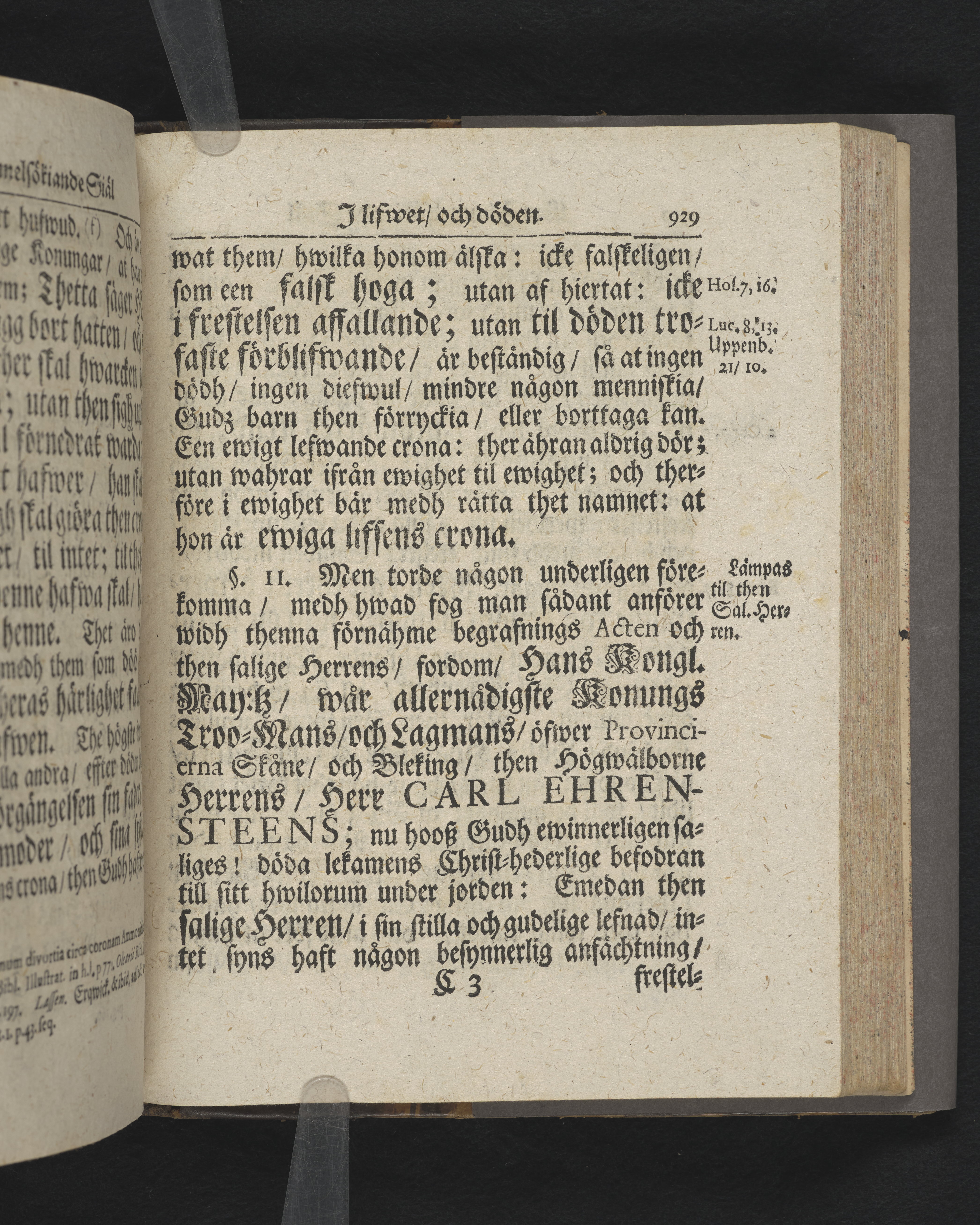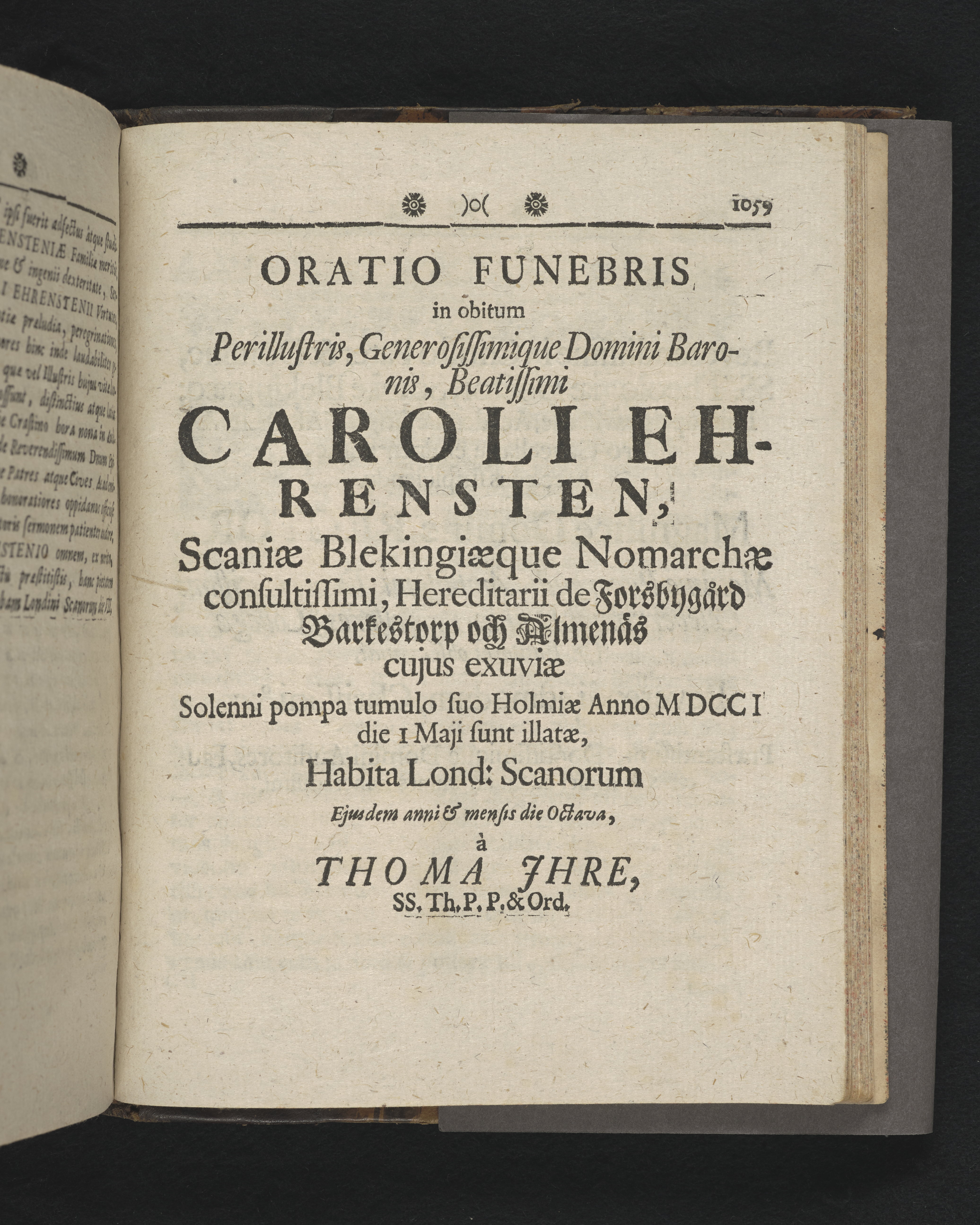 En him[m]el-sökiande siäl, i lifwet och döden: pröfwad widh för thetta hans kongl. May:tz tro-mans och lagmans öfwer härtigdömet Skåne och Blekingen, then fordom högwälborne friherres och herres, Herr Carl Ehrensteens... afsked af werlden, som efter Gudz behag inföll then 30 Novemb. 1702... i St. Jacobs Kyrckia här i... Stockholm; när thesz döde lekamen... befordrades til sin hwilostad... I en christelig lijkpredikan, framstäld af Simon Isogæus... Stockholm, Tryckt... hos sal. Wankijffs enckia.