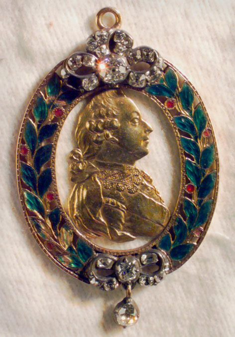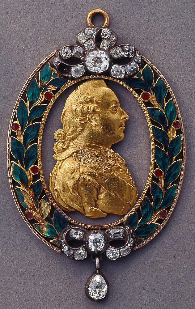 Tillverkad: Troligen Stockholm, 1778. Föreställande Gustaf III (SPA 1922:242). Guld, ram i polykrom emalj med silver infattade, äldre briljantslipning (lefi 2015-08-11). Baksidan med text: "Gifvit af K. Gustaf III till Greve Mag. F. Brahe Som bar Sverges Kron Prints Gustaf Adolph till Dopet d. 10 November 1778". Ostämplad. Minnestecken för kronprinsens (Gustaf IV Adolf) dop. Porträttets höjd 36 mm, bredd 24,5 mm. Ram i form av lagerkrans i grön gropemalj, med röda bär. Upptill och nertill rosetter av ursprungligen 26 större och mindre briljanter i avdeckt fattning, av silver. I den undre rosetten hänger en större briljantpendeloque i avdeckt fattning. Ögla upptill. I samband med kronprinsens dop utdelades denna medaljong, i varierade utseende efter rang, till Ärkebiskopen (helt briljerad krans), Lantmarskalken och tre grevar (med emalj, briljantrosetter och pendeloque), tre friherrar och biskoparna (med emalj, briljantrosetter, inget hänge), sex deputerande ur Riddarklassen (övre rosetten briljanterad, nedre rödemaljerad). Övriga fick helt emaljerade kransar. Medaljongen var avsedd att bäras guldkedja om halsen, vilket Magnus Fredrik Brahe gör på ett porträtt av Karl Fredrik von Breda (sko inv. nr: 1857).