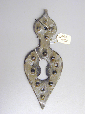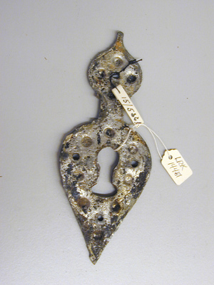 Skylt av förtennt stål i form av droppformig större platta med spetsen nedåt med hål för nyckeln samt tre skruvhål, två och ett och åtta från baksidan drivna sfäriska förhöjningar. Upptill liknande, mindre platta med ett skruvhål och fyra förhöjningar, plattorna förenade med kvadratiskt parti. På framsidan rester av målning med grå oljefärg (?).
