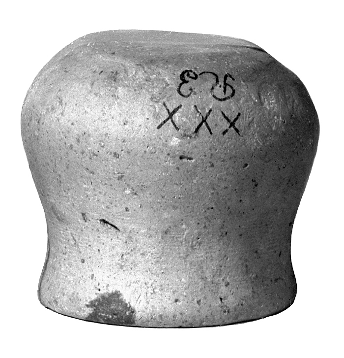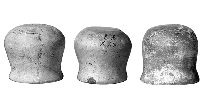 KÄRL, koppglas tre stycken Av ljusbrunt, rödbrunt resp. svårtgrått lergods. Hopsatt av ett flertal fragment. Koppformiga med utvidgat rundat bottenparti samt något utböjd bräddkant. Höjd: 3,5-4 cm Brädd diameter: 4--4,4 cm, diameter vid buken: 4--4,1 cm