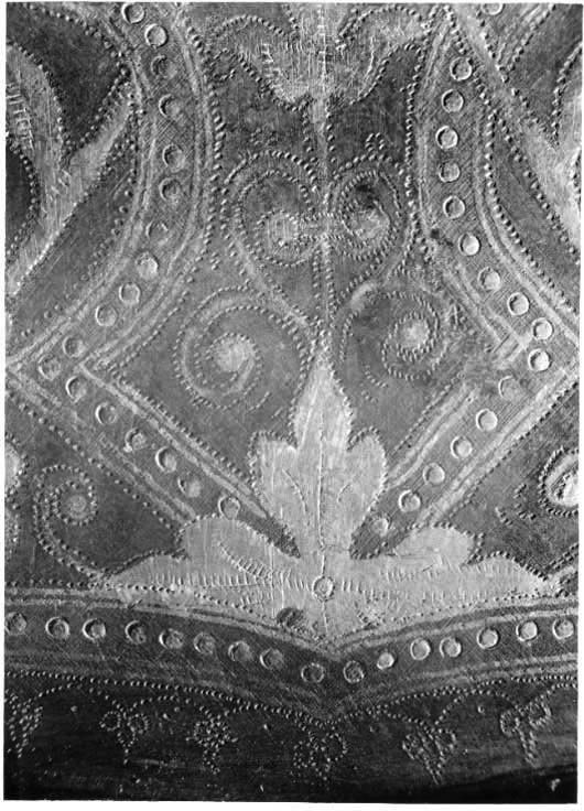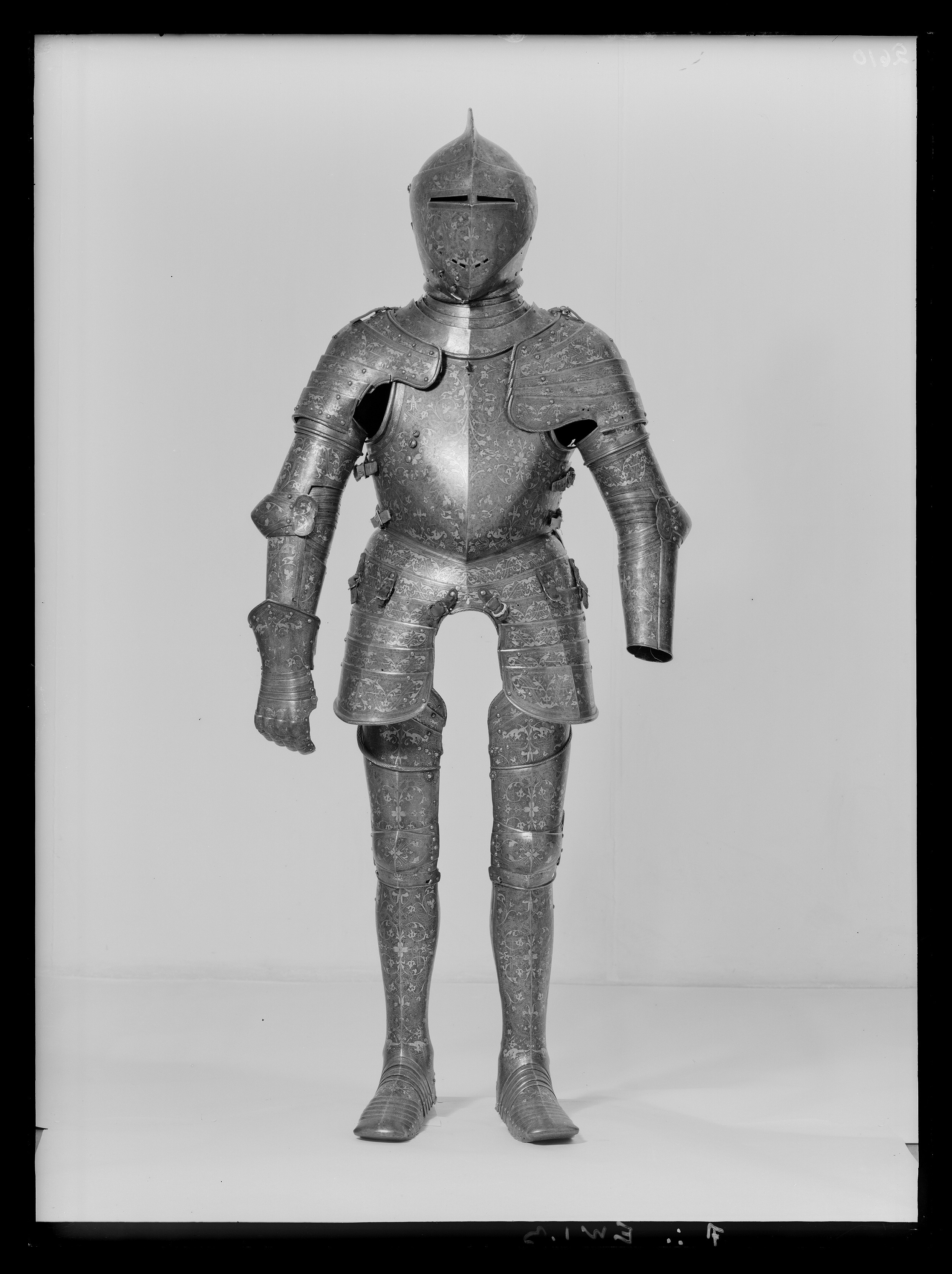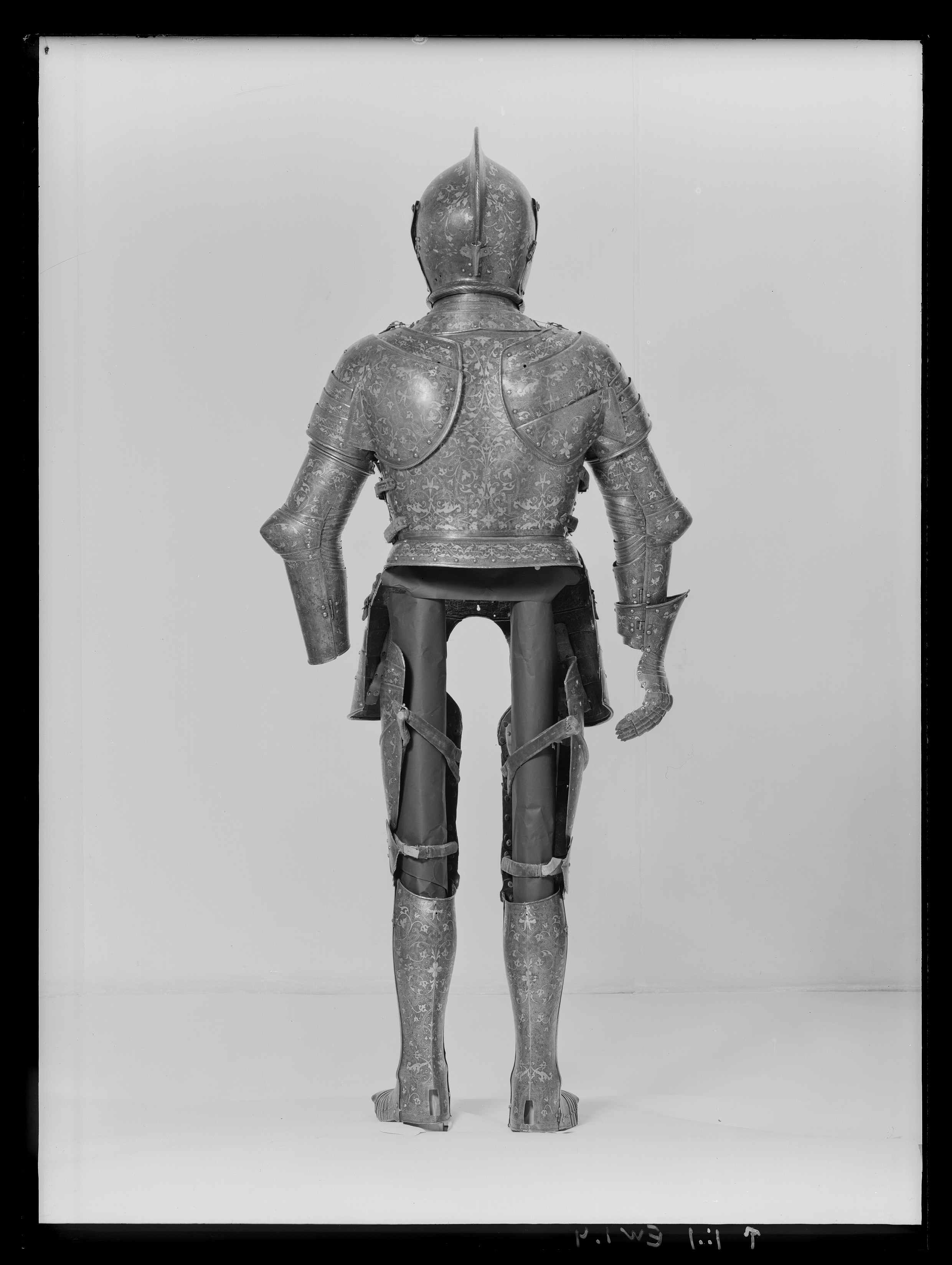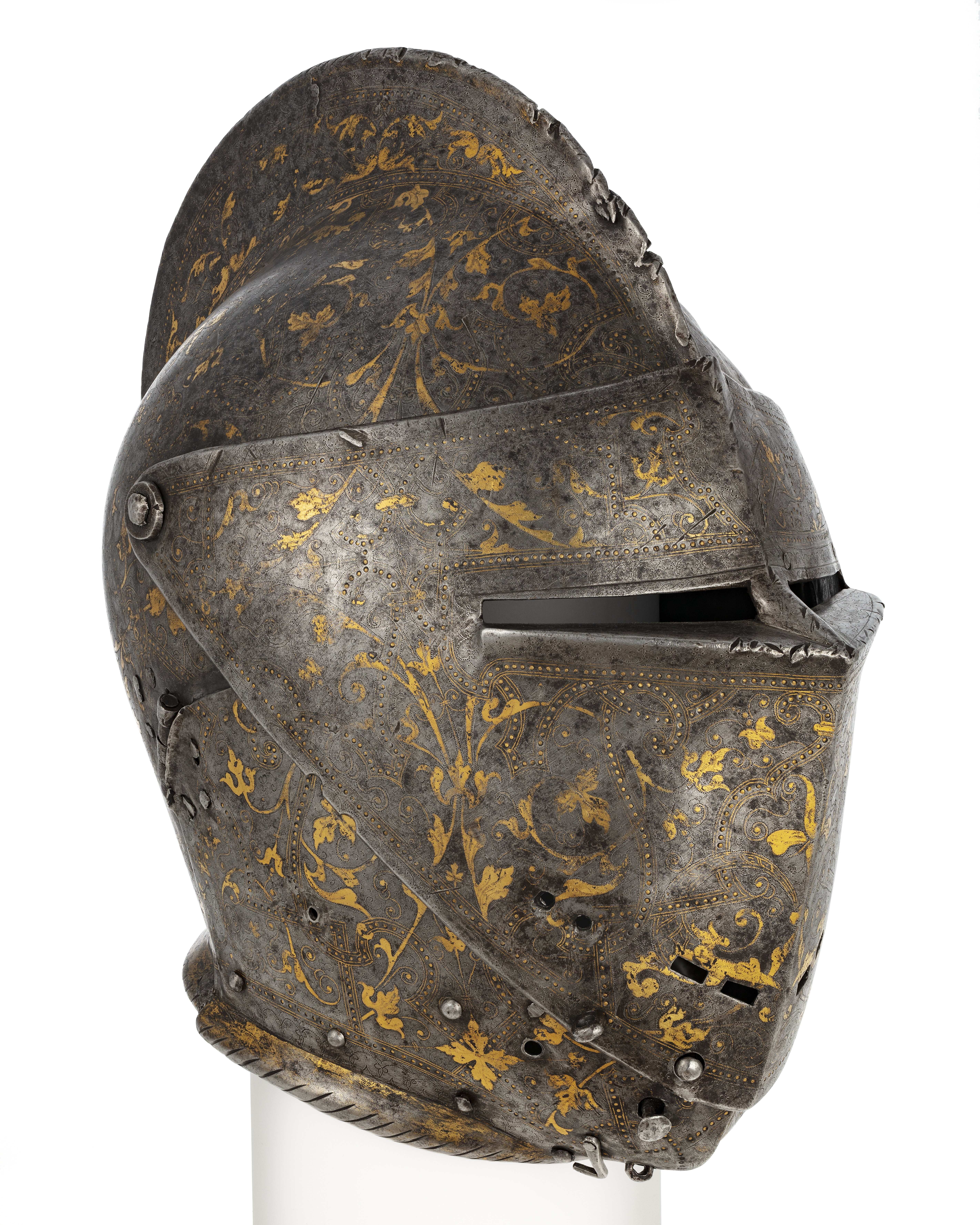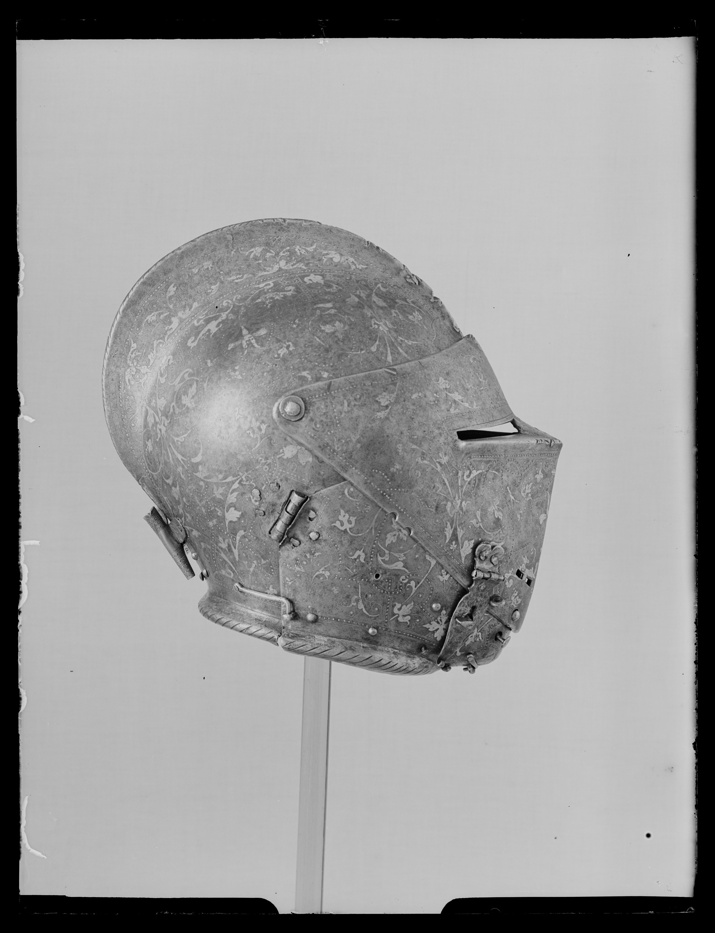 Driven stålplåt med på utsidan förgylld dekor mot mörk bakgrund. Insidan brunaktig. Sammanlagt fyra delar. Klockan rundad med flackare sidor och något uppåt utdraget bakparti, upptill mjukt utdriven kam. Kammen högst över mittpariet, 55 mm, avsmalnande framåt och bakåt, över pannan övergående i mittås. Dekor av filade snedställda linjer. Klockans nedre kant formad som välvd skena, att löpa över halskragens kant. Dekor av filade linjer. Kanten över pannan slät. Baktill över kammens nedre del en plymhållare, h 57 mm, av rörformig mässingsplåt, nedåt avsmalnande med cirkulärt tvärsnitt. Övre kanten tandad, upptill och nertill skuren dekor av linjer och cirklar i rader. Åt sidorna vingar med rundade kanter. Under plymhållaren sex nitar i grupp. Visir i ett stycke. Vid pannan förhöjning för kammen. Synspringor, rektangulära och utåt avsmlnande, l 78 mm. Delade i mitten. Under springorna inåt vinklad kant lätt driven utåt bildandes skyddande klack, framtill hopgående i tämligen kort spets över näsan. Vertikalt ställd skarp mittås. Sidorna välvda och utdragna uppåt och bakåt. Nertill över munnen rektangulära hål, l 11 mm, två på var sida om mittåsen. På höger sida vid hakan ett hål, för hakstyckets tapp, ovanför detta en fast ögla och två hål. Hakstycke av två delar. Fästat i bakre kant med ett gångjärn på var sida och öppningsbart på mitten. Framtill hopgående över hakan i rundad spets, högra stycket över det vänstra. På vänstra stycket under hakan en tapp genomborrad från sidan, på högra styckets insida fjäderbelastad sprint och "trycknit". Kanten vid halsen formad som välvd skena. Alla nitar av stål med blanka kullriga skallar. Visir och hakstycke fästade med genomgående nit i sidan och uppfällbara. Dekor: Hela ytan blånerad. Mot fint skrafferad yta ett slingrande rankmönster av påslaget guldbleck och prickpunsade kantlinjer. Dessutom ett oregelbundet mönster av 5 mm breda band längs kanterna och genom rankorna. Banden består av i mitten försänkta punkter fyllda med guld, på var sida två tunna linjer av påslaget guld med en yttre linje av punsade prickar. Kragen nertill förgylld.