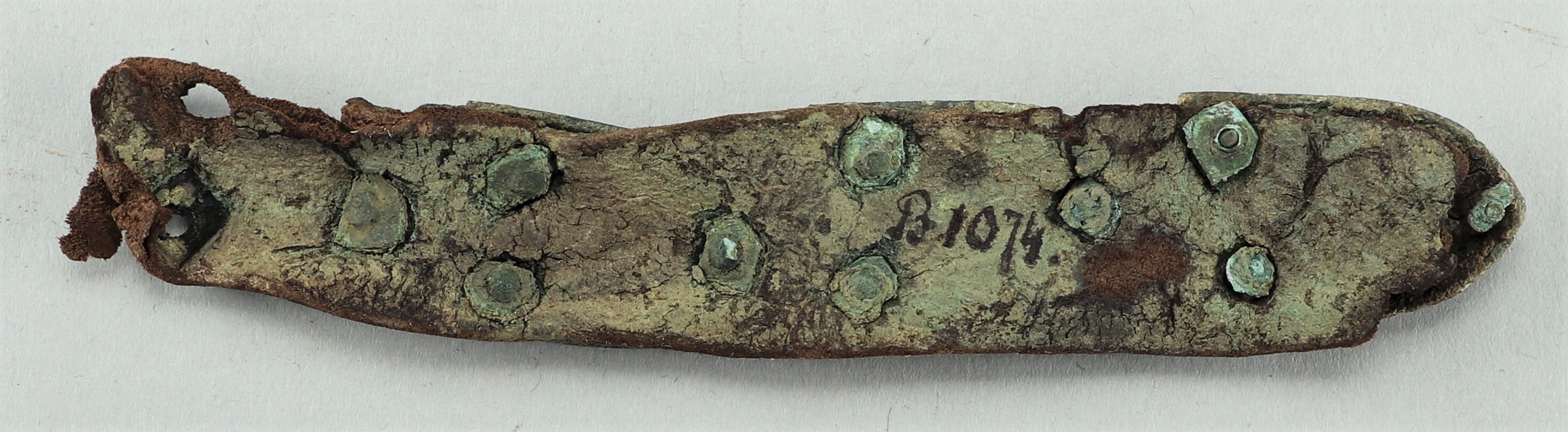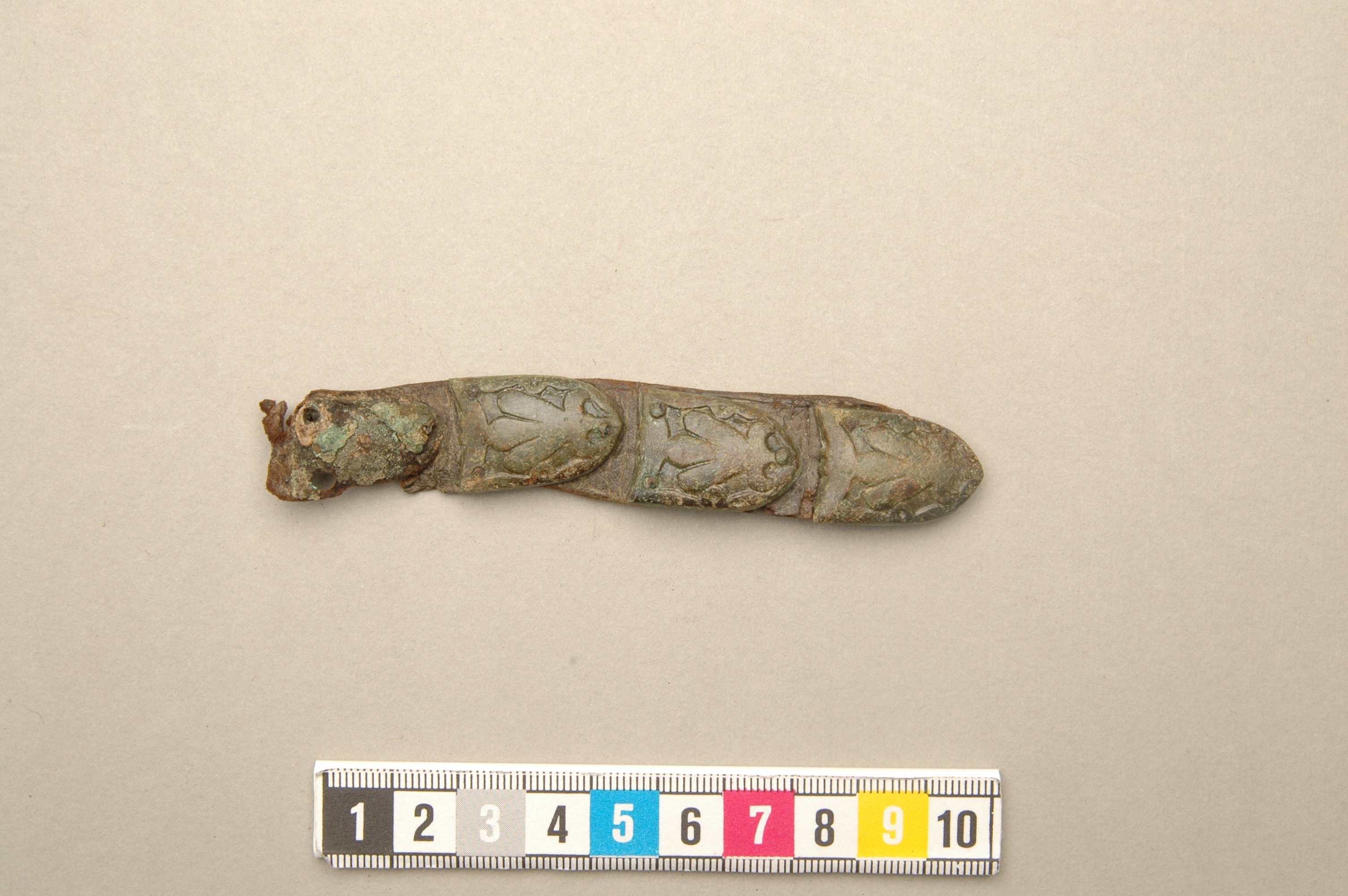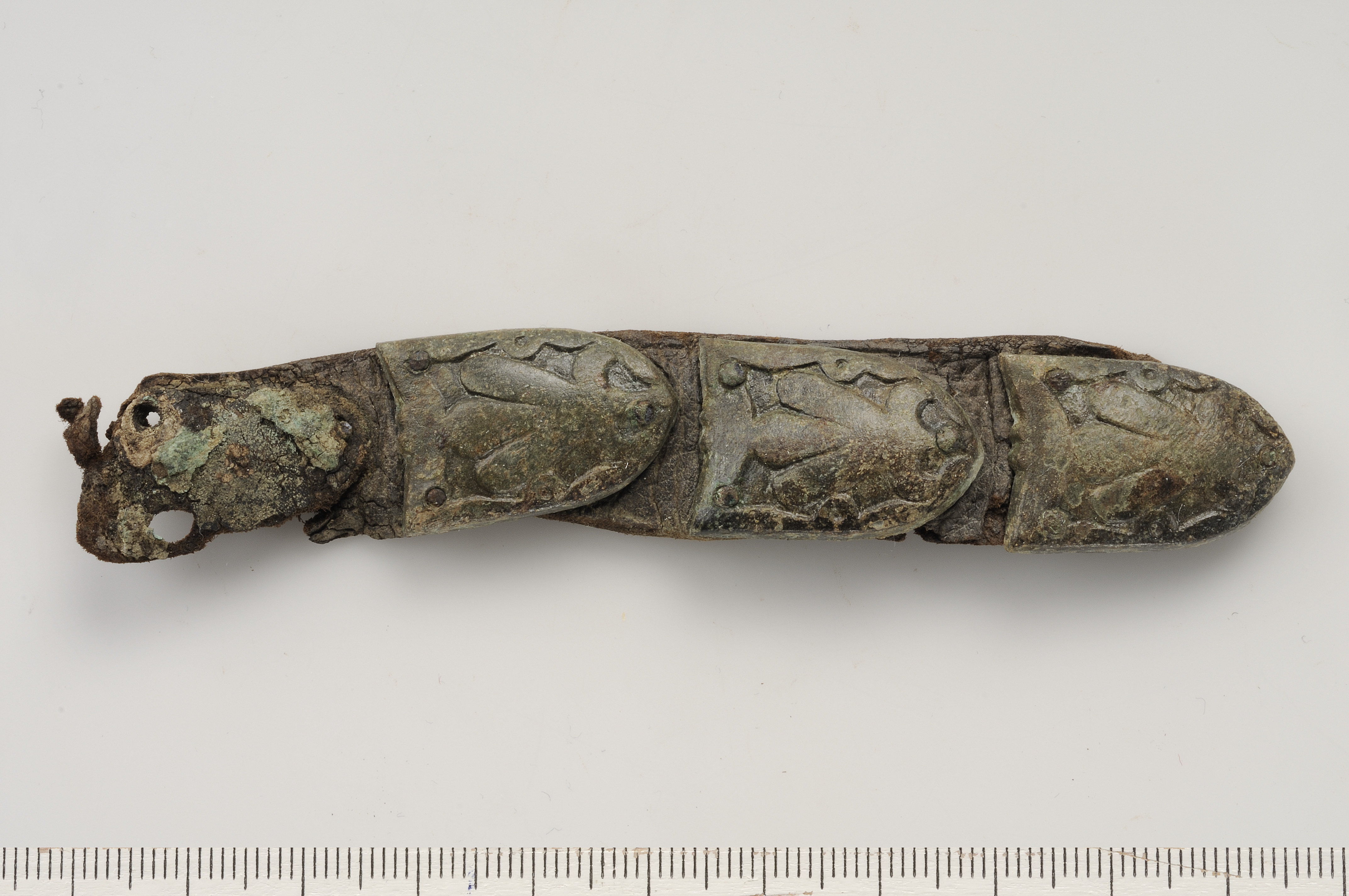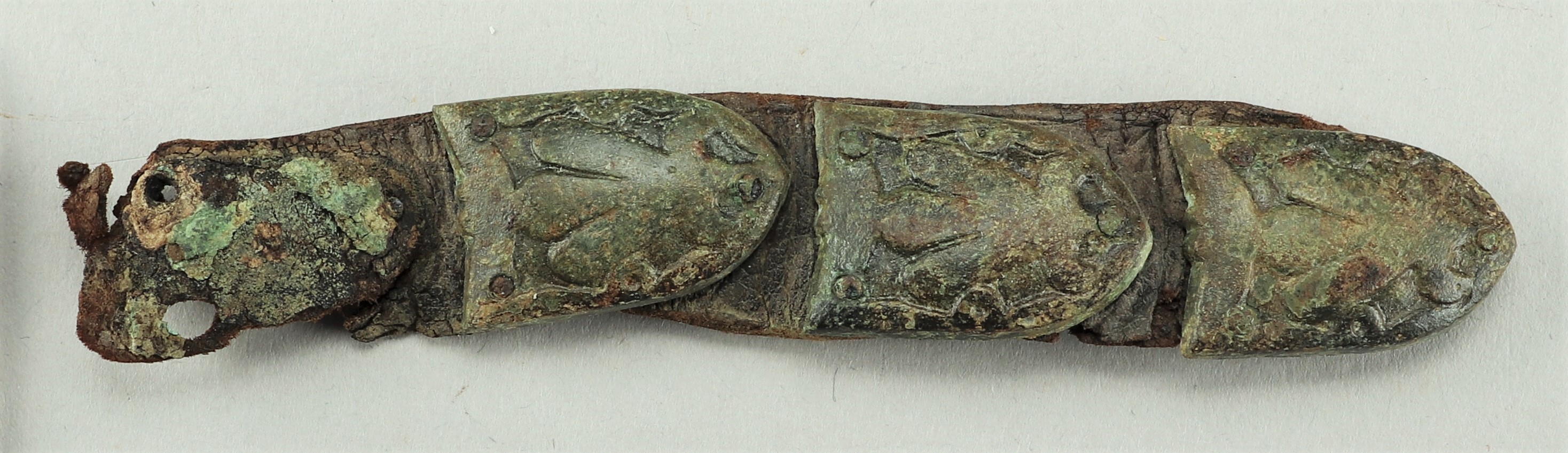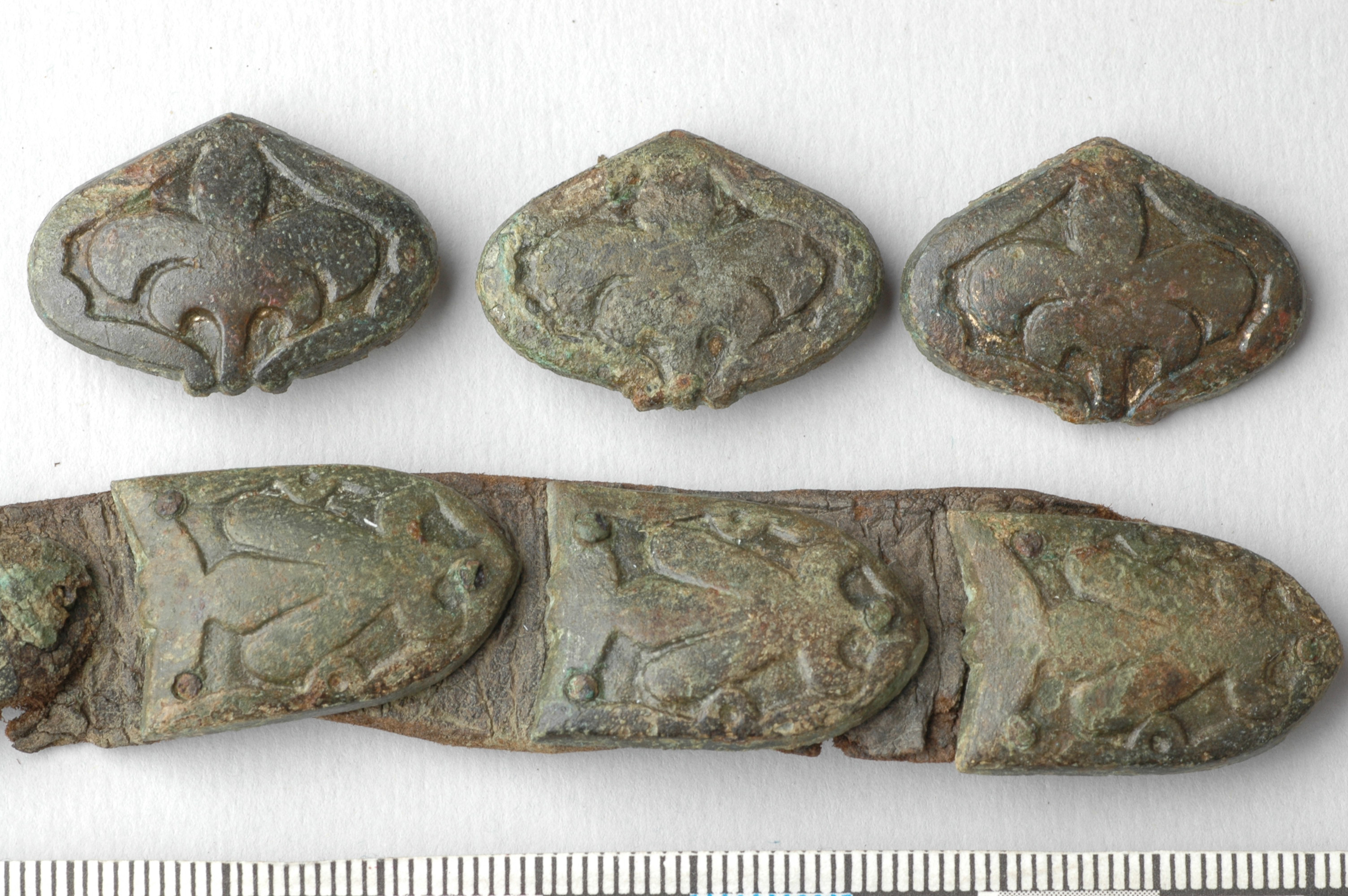 Fyra tungformiga bältebeslag av brons på bältesrem