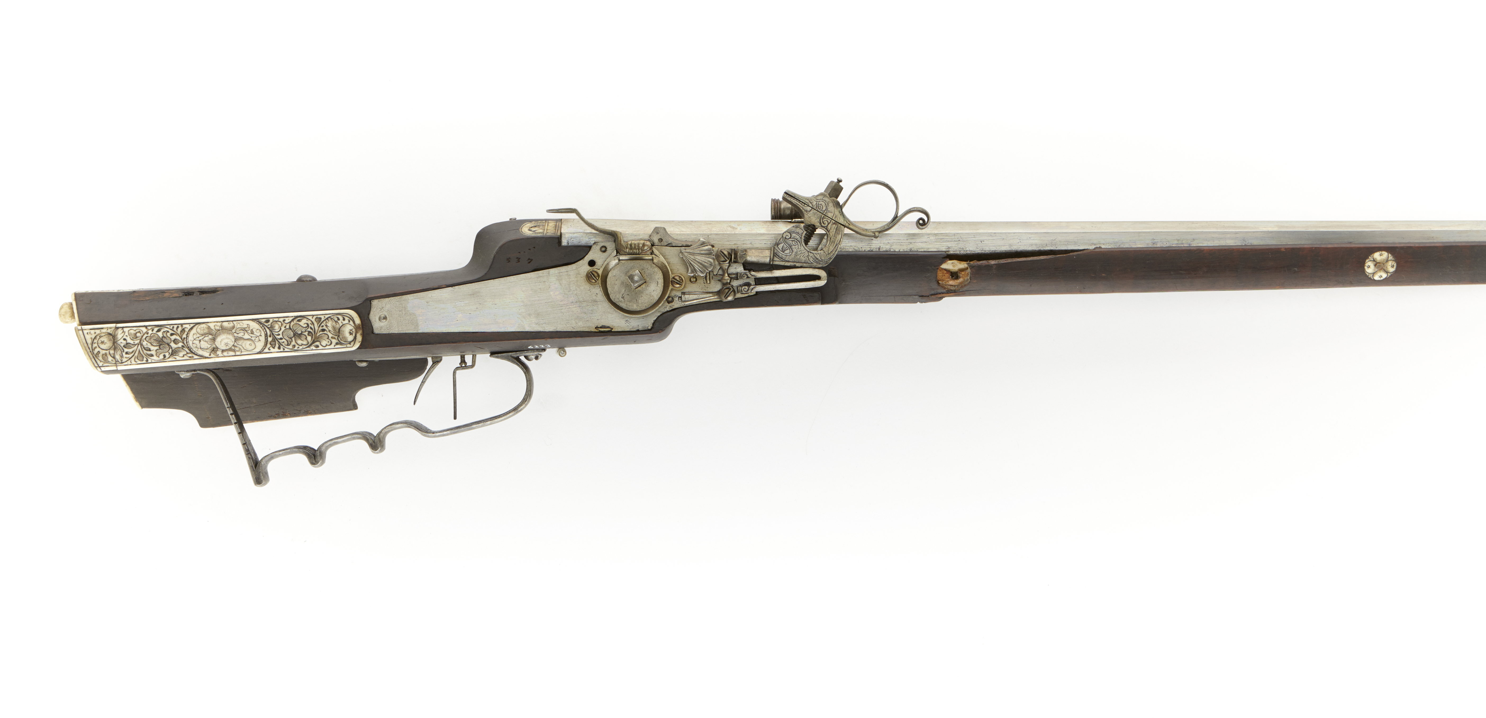 Åttkantig pipa av stål, åtta räfflor. Balusterformigt rörsikte av stål och stolpkorn av mässing. Hjullås. Låsbleck av stål - bakåt avsmalnande genom ett fall. Hjulet är fastskruvat med en ring kl. 9 och kl. 3. Bakåtböjd, upptill vinklad krutskärm. Hane med lös överkäke. Fingergreppet är kluvet och den bakre delen är omböjd till ring. Musselformig tryckknapp. Hel stock av svärtat trä, tysk kolvtyp. Bakplåt och stödkula av ben. Stocken är något inlagd med graverade benplattor. Kolvlådelocket är helt av ben med graverade fruktknippen och bladrankor. På anslaget finns en örn utskuren i ben. På kolvryggen finns en förgylld knapp. Två låsskruvar, den bakre på kolvhalsen, båda med runda benbrickor. Tre pipstift med benbrickor. Näsband och rörka av ben. Varbygel med tre fingerlägen. Avtryckare med snälltryck. Snällaren är vinkelböjd två gånger. Tillbehör: Laddstock av ljust trä. Märkt: 537 ovanför låsblecket, stanstyp 5376. Enligt 1710 års inventarium p. 16, rum II: "88-537-1 Reflebyssa med litet lod, Swart ståck, något beensatt och 1 Örn på beslage...-6-".