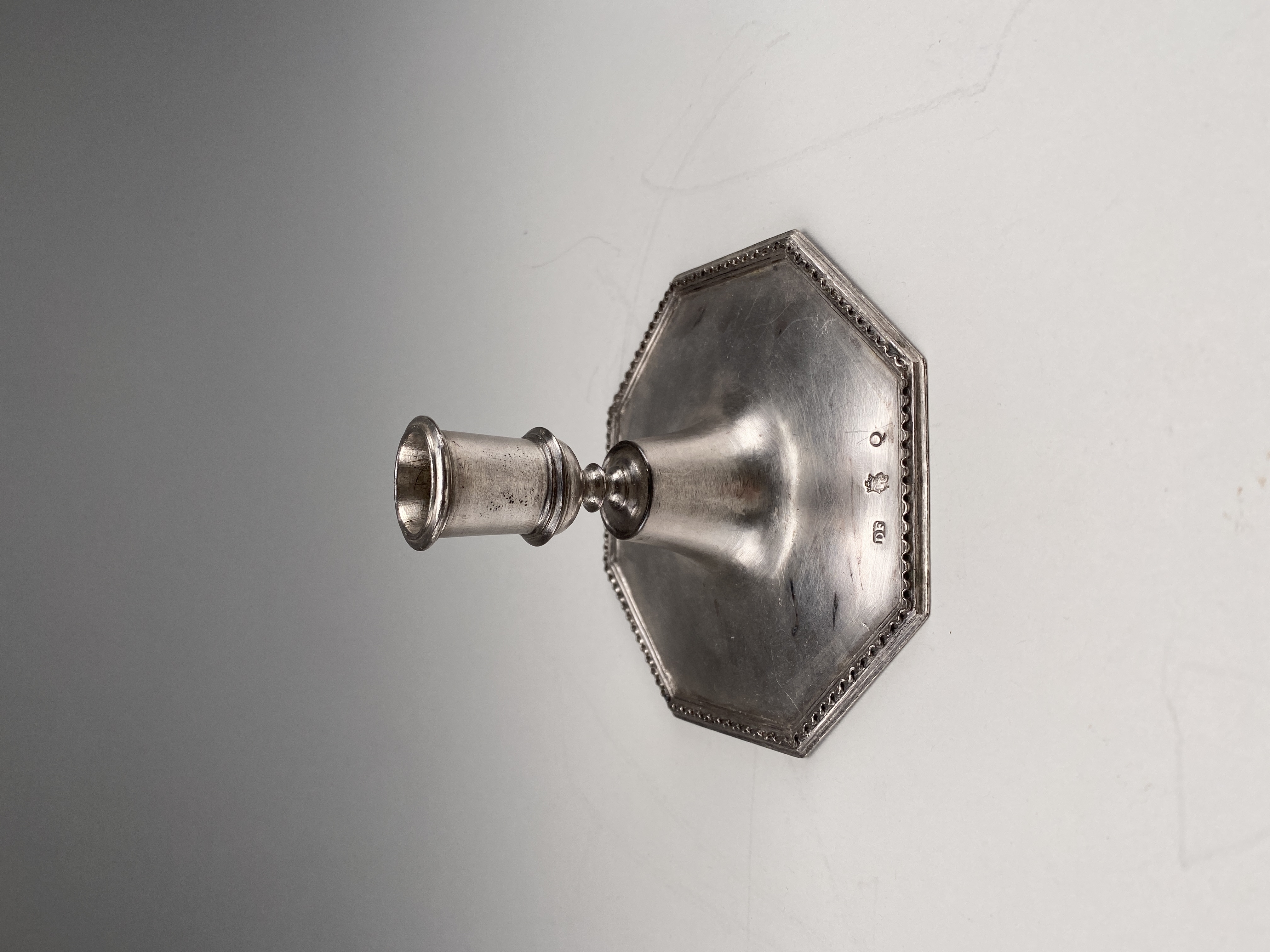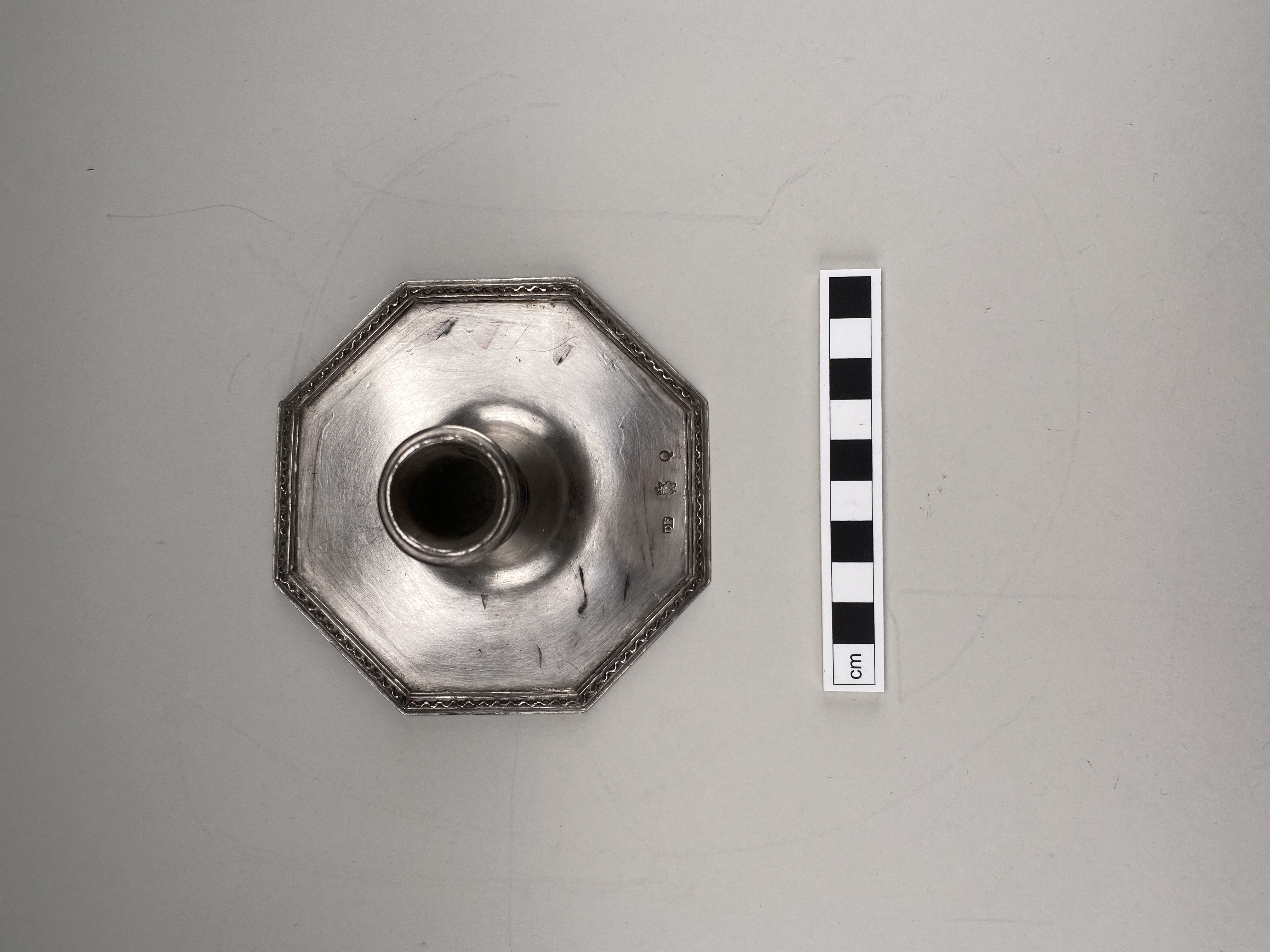Ljusstake med slät kupa och åttkantig fot med en smal våglist. I par med unr 20.