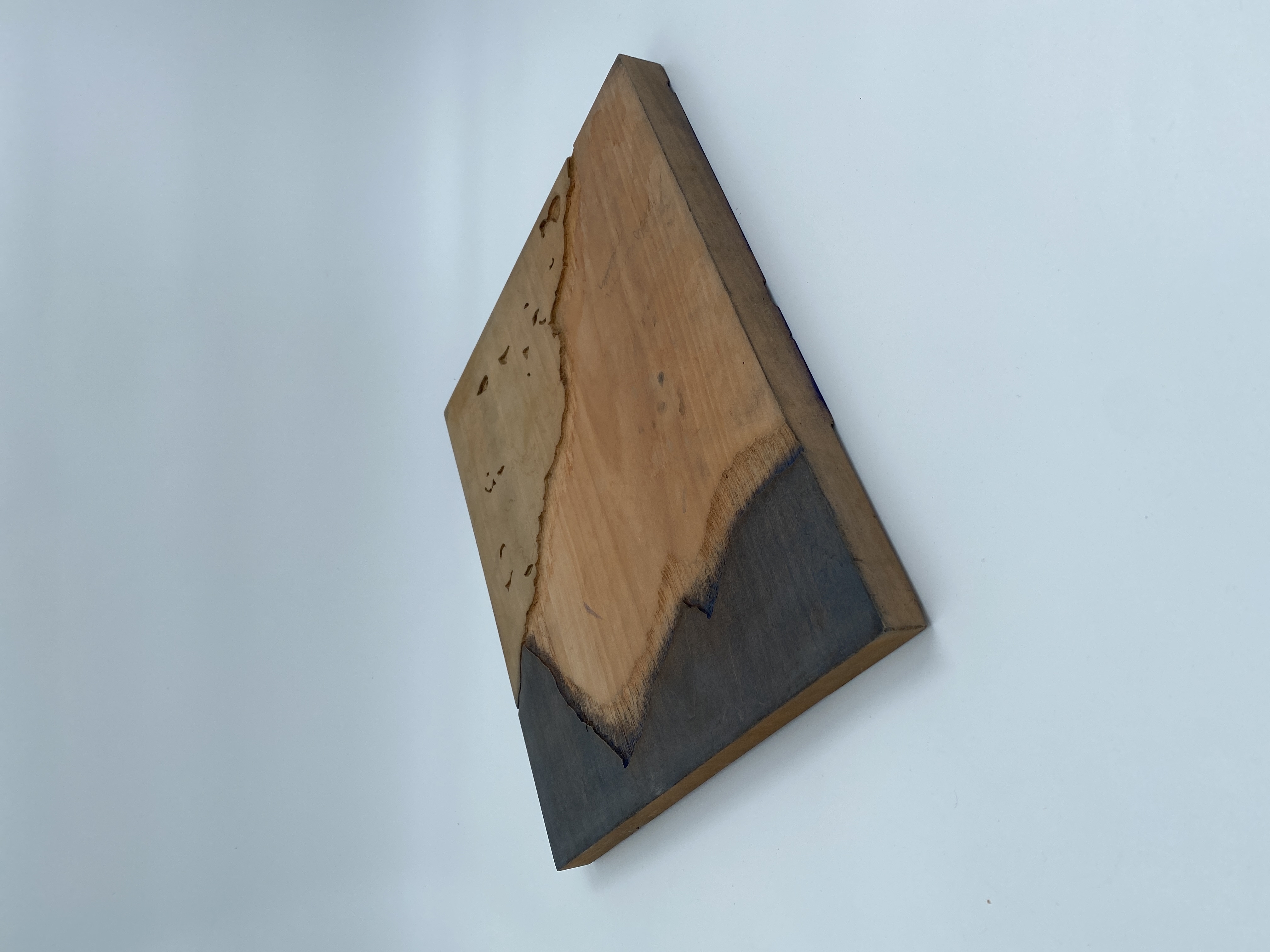 Tryckstock i trä, handskuren av Auguste Sommer. Träblocket bär spår av färg och har sugit åt sig en del av pigmenten.
