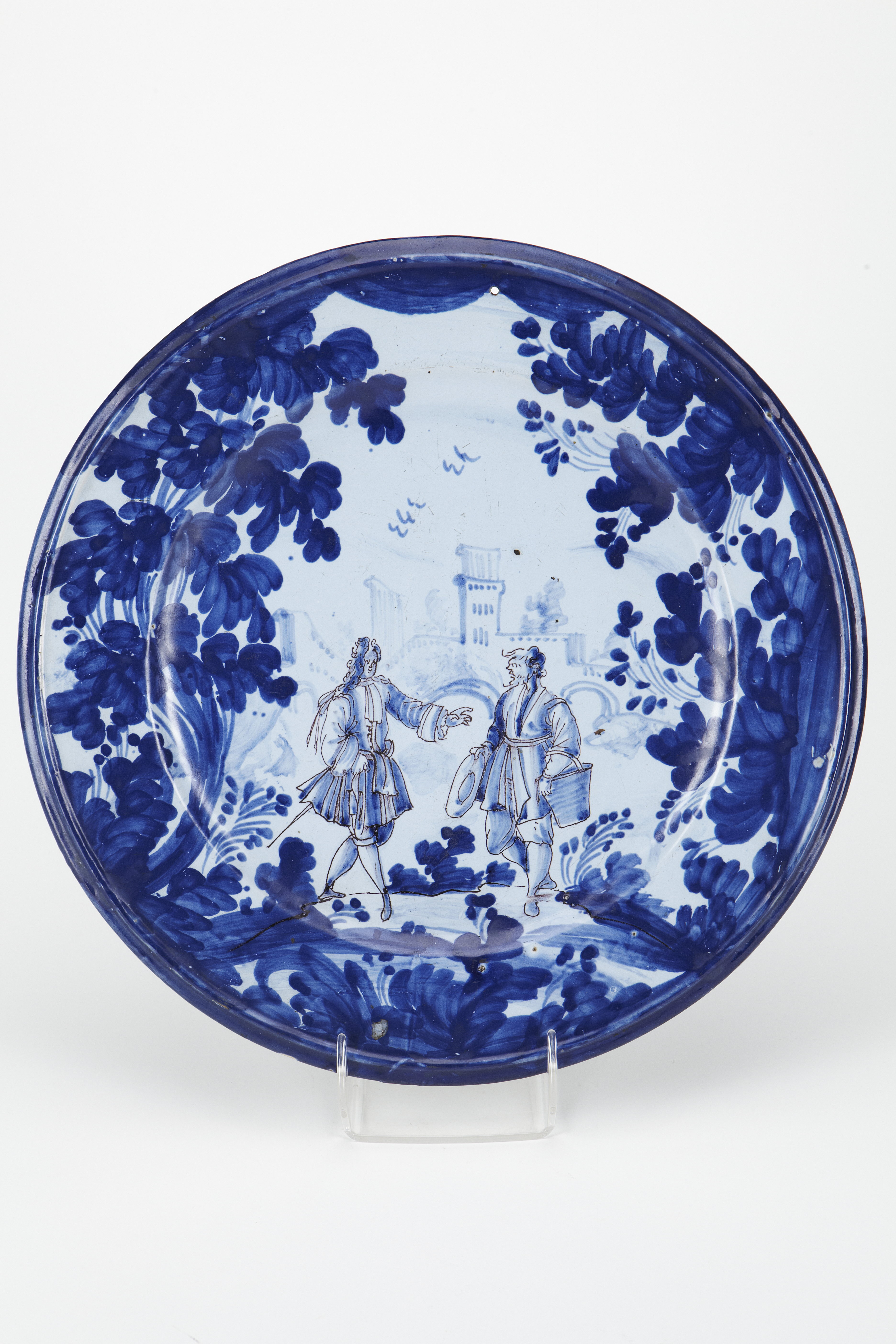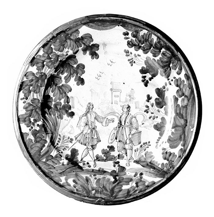 TILLÄGG: Koboltblå monokrom tallrik, men med inslag av en livlig azurblå färgton. Azurblått kom att känneteckna keramiska produkter från Savona. I tallrikens komposition har två mansfigurer placerats i ett landskap. Torn och en brobyggnad syns i bakgrunden. Hela scenen är omgiven av tät vegetation i koboltblått. Tallrikens undersida har försetts med bladlika ornament i 6 stycken grupperingar. Tallrikens motiv påminner om den dekorativa typologi som var framgångsrik i Savona, särskilt i Chiodo verkstaden under mitten av 1700-talet. Flera av dekorationsmålarna verksamma i Chiodo manufakturen kom från Guidobono familjen, men även Agostino Ratti var verksam i Savona på den tiden. Ratti var känd för sitt raffinerade koboltblå monokroma dekorationsmåleri. Liknande tallrikar har attribuerats till Chiodo verkstaden.