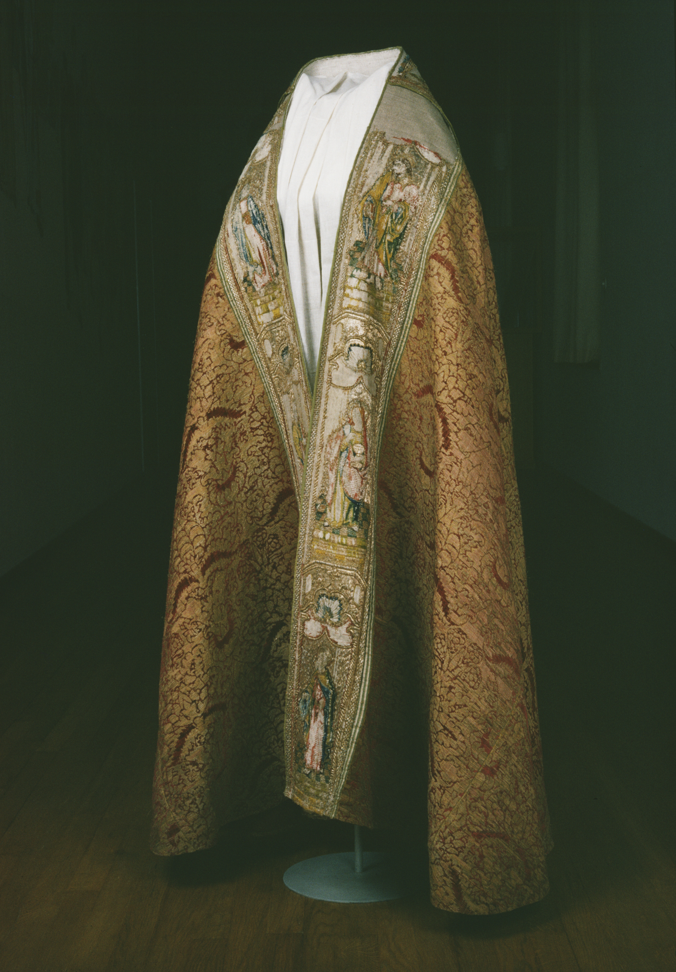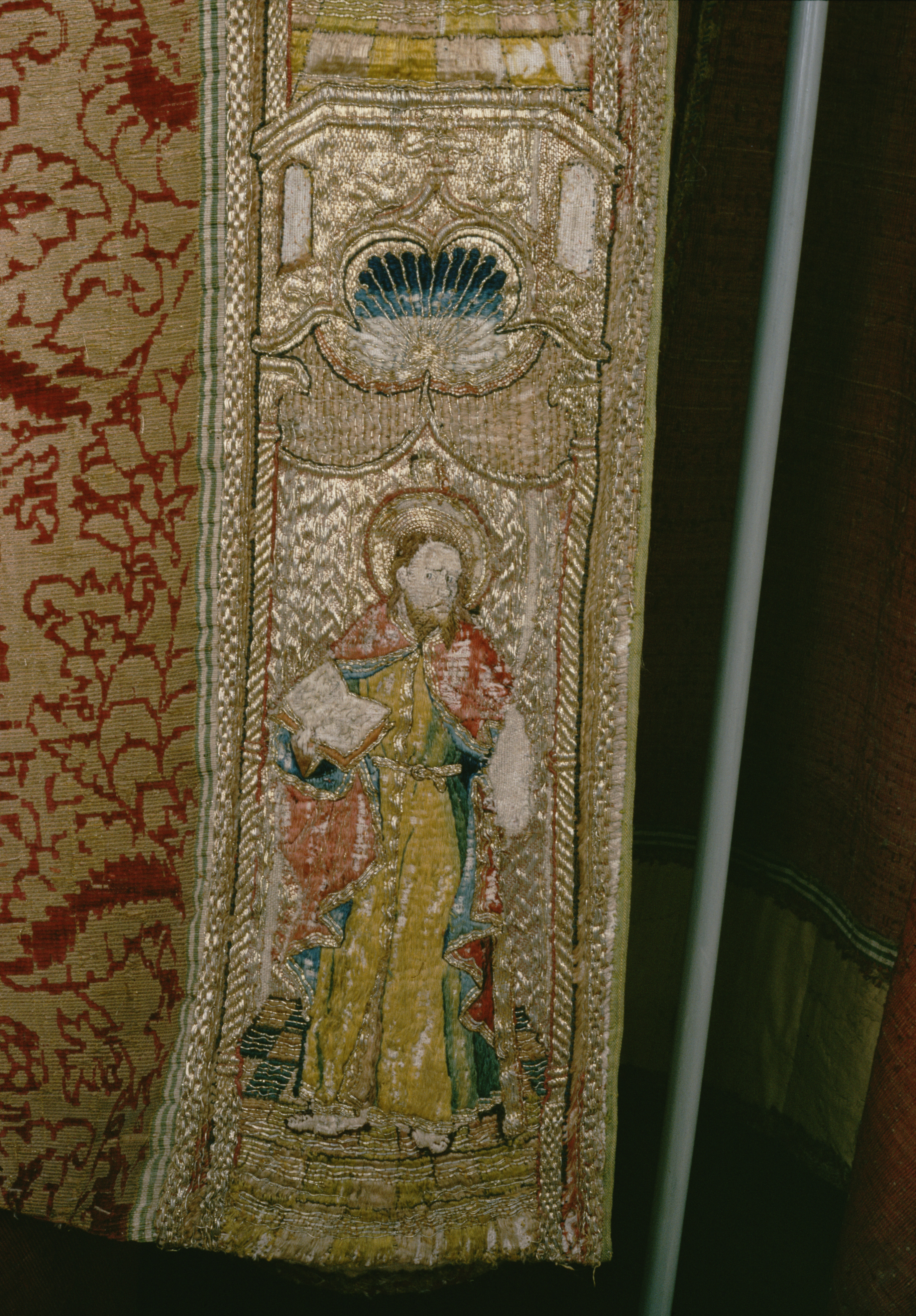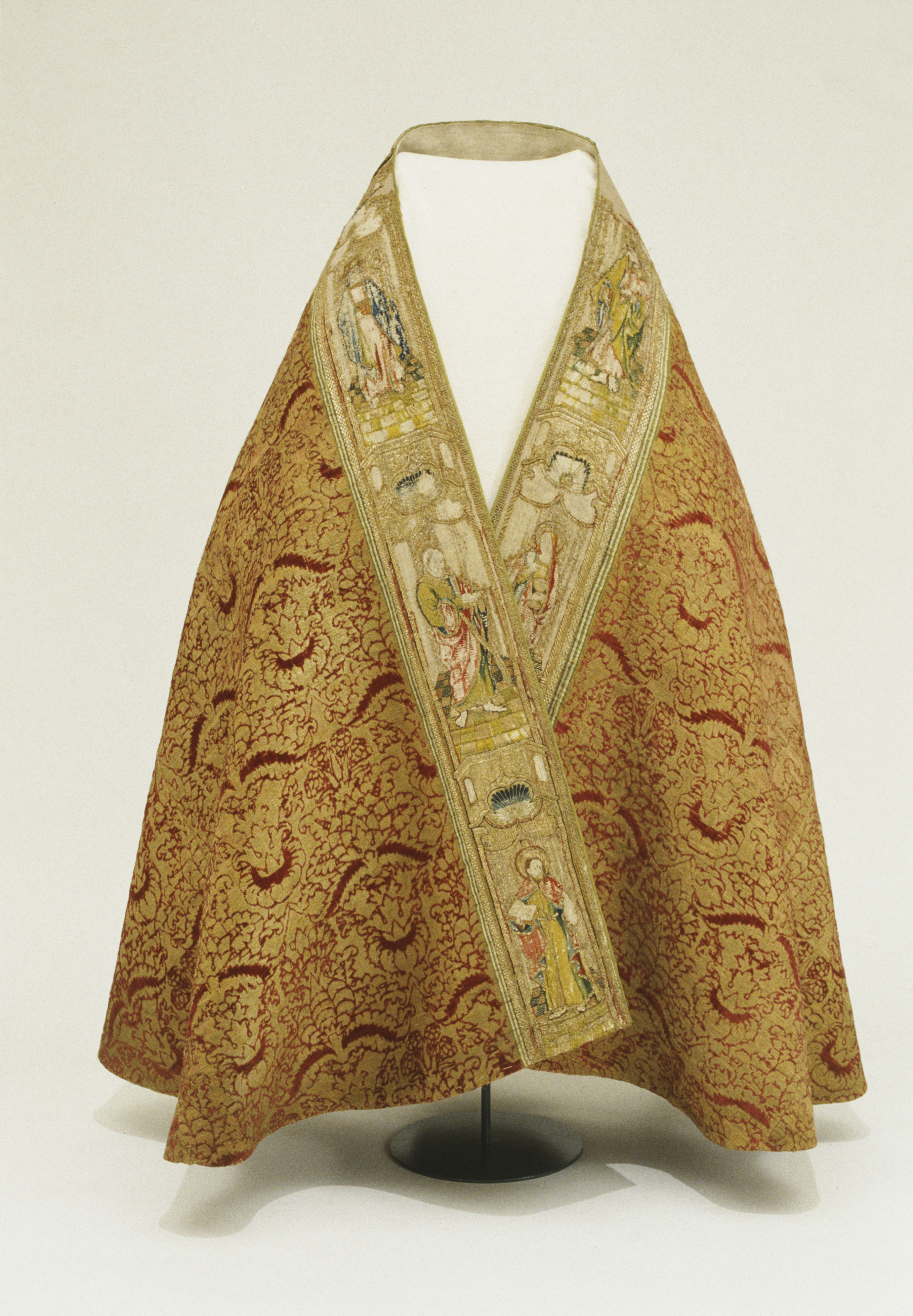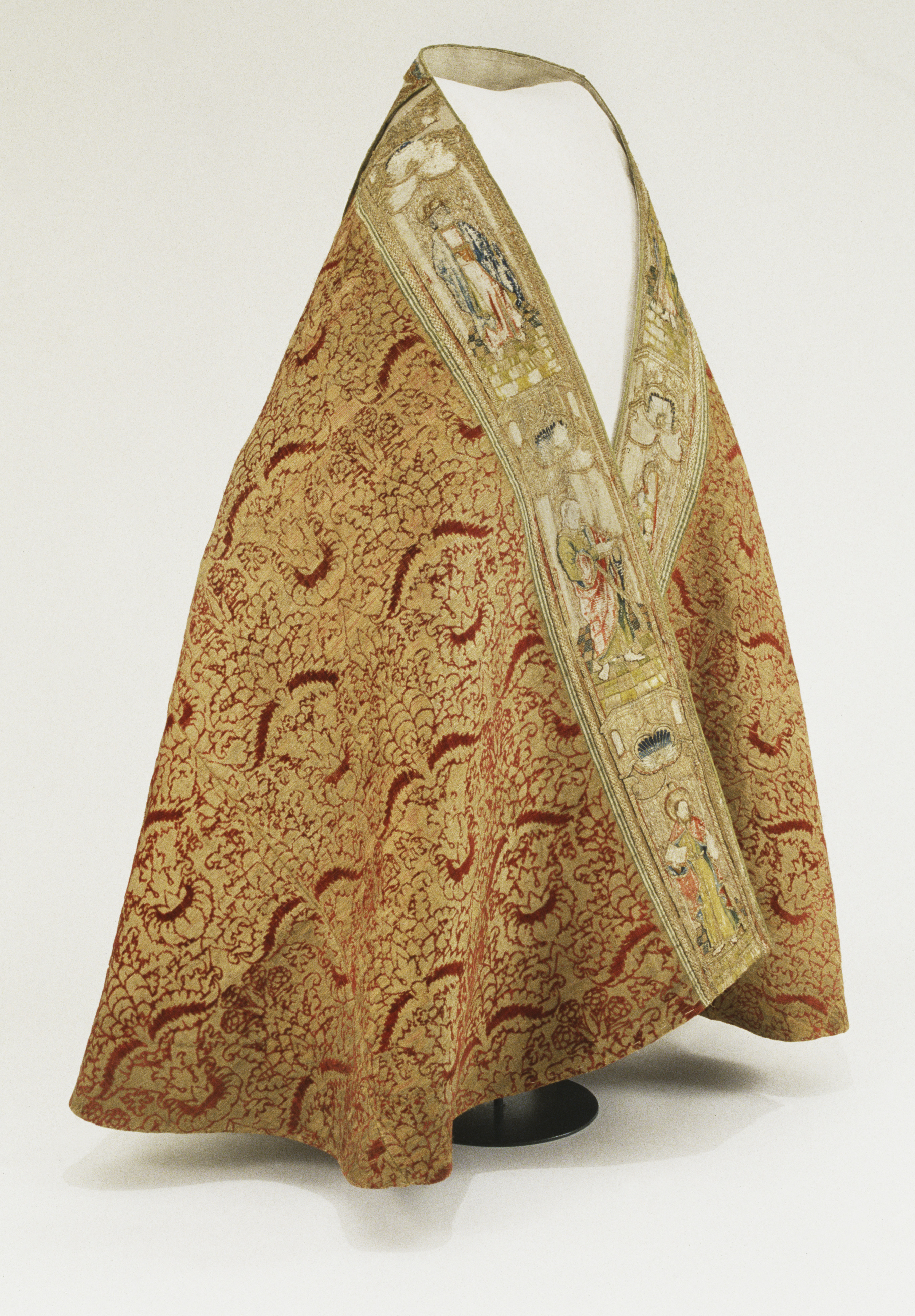Röd sammetsbrokad med tistelmönster, Italien. Figurbroderat bräm och ryggsköld i guld och silke på lärft. Sköld: Bebådelsen. Bräm: S. Tomas, S. Johannes?, S. Simon, S. Jakob dy, S. Jakob dä. Flandern. Ursprungligen rött lärftfoder. Inköpt 1851.