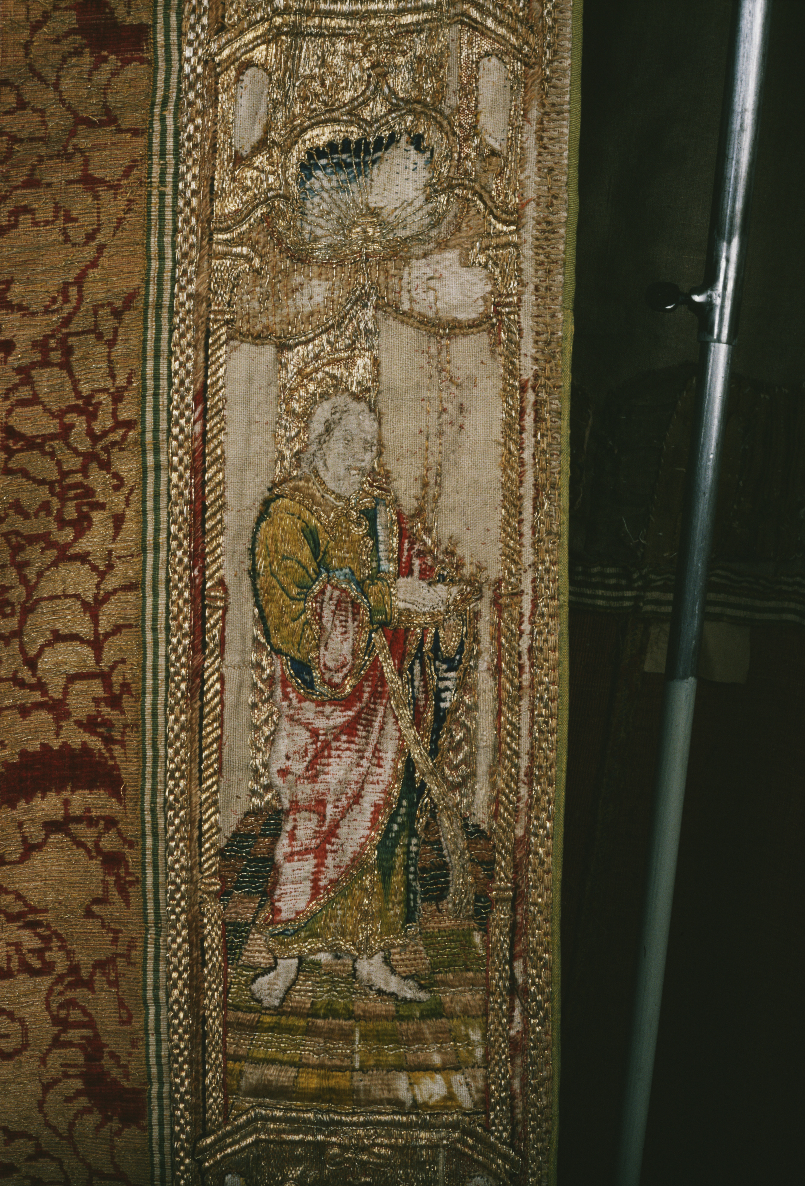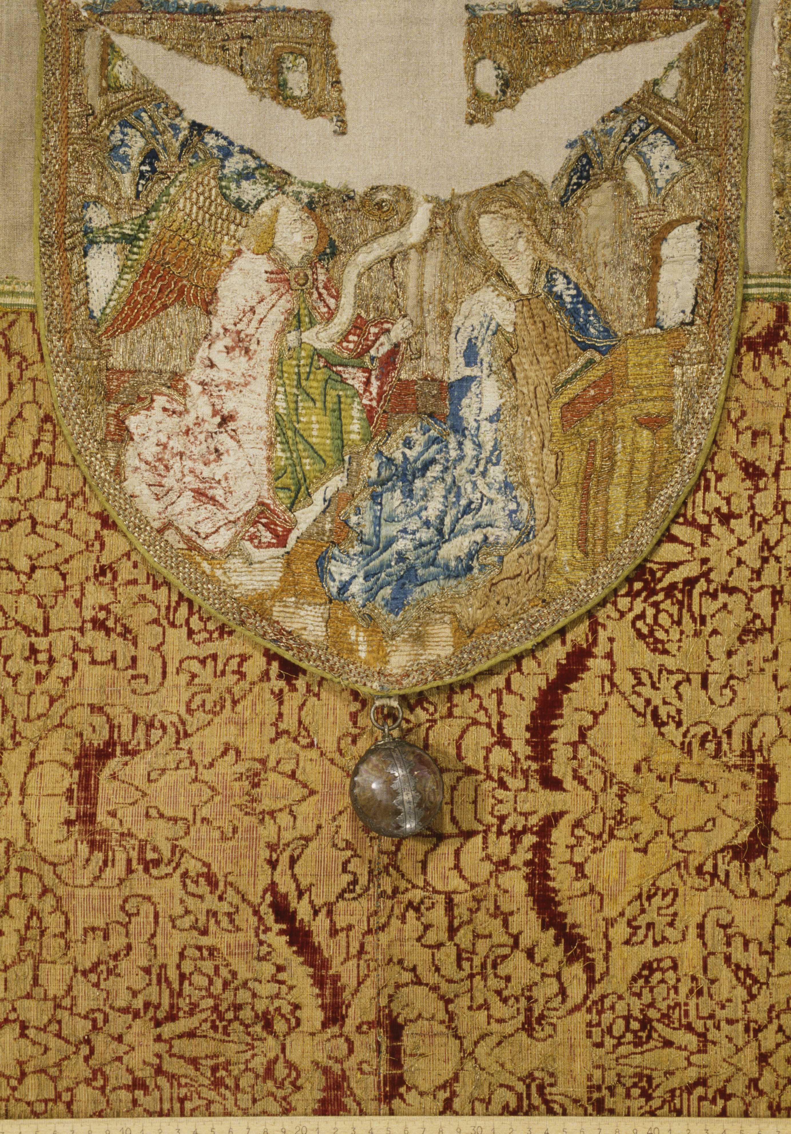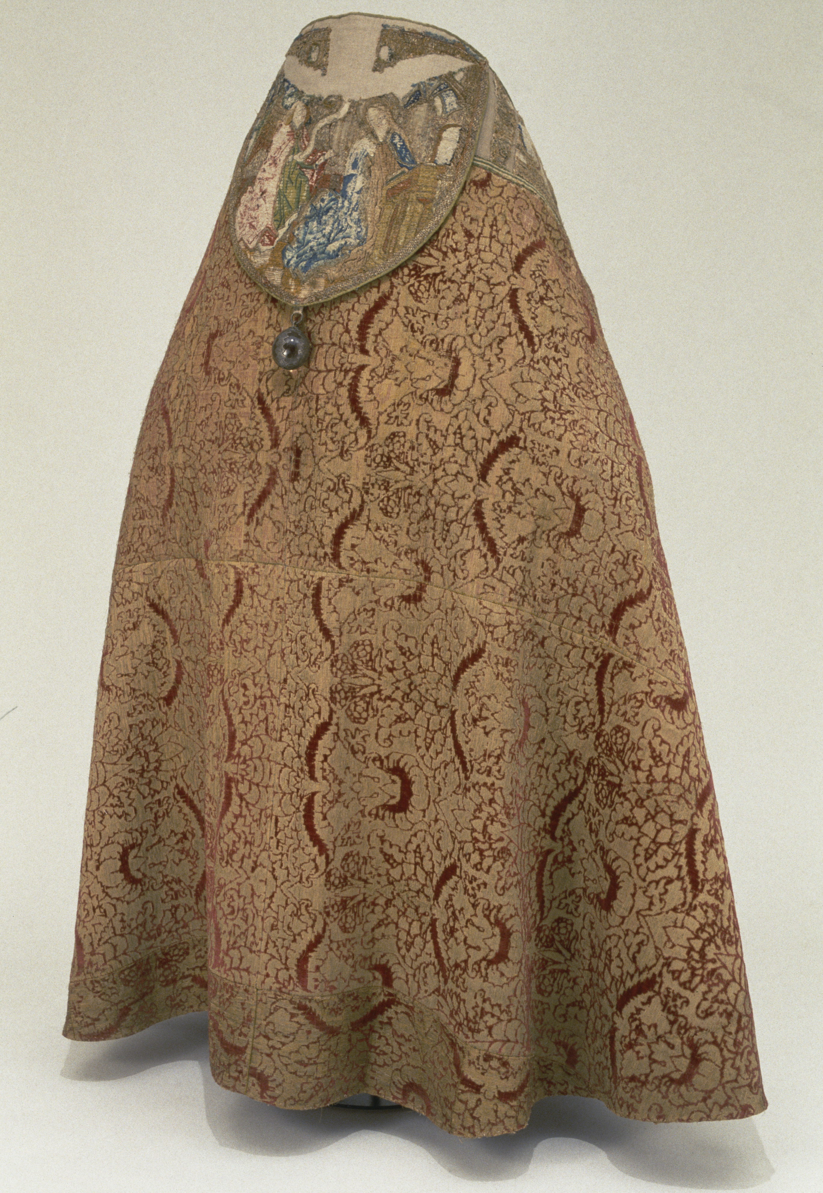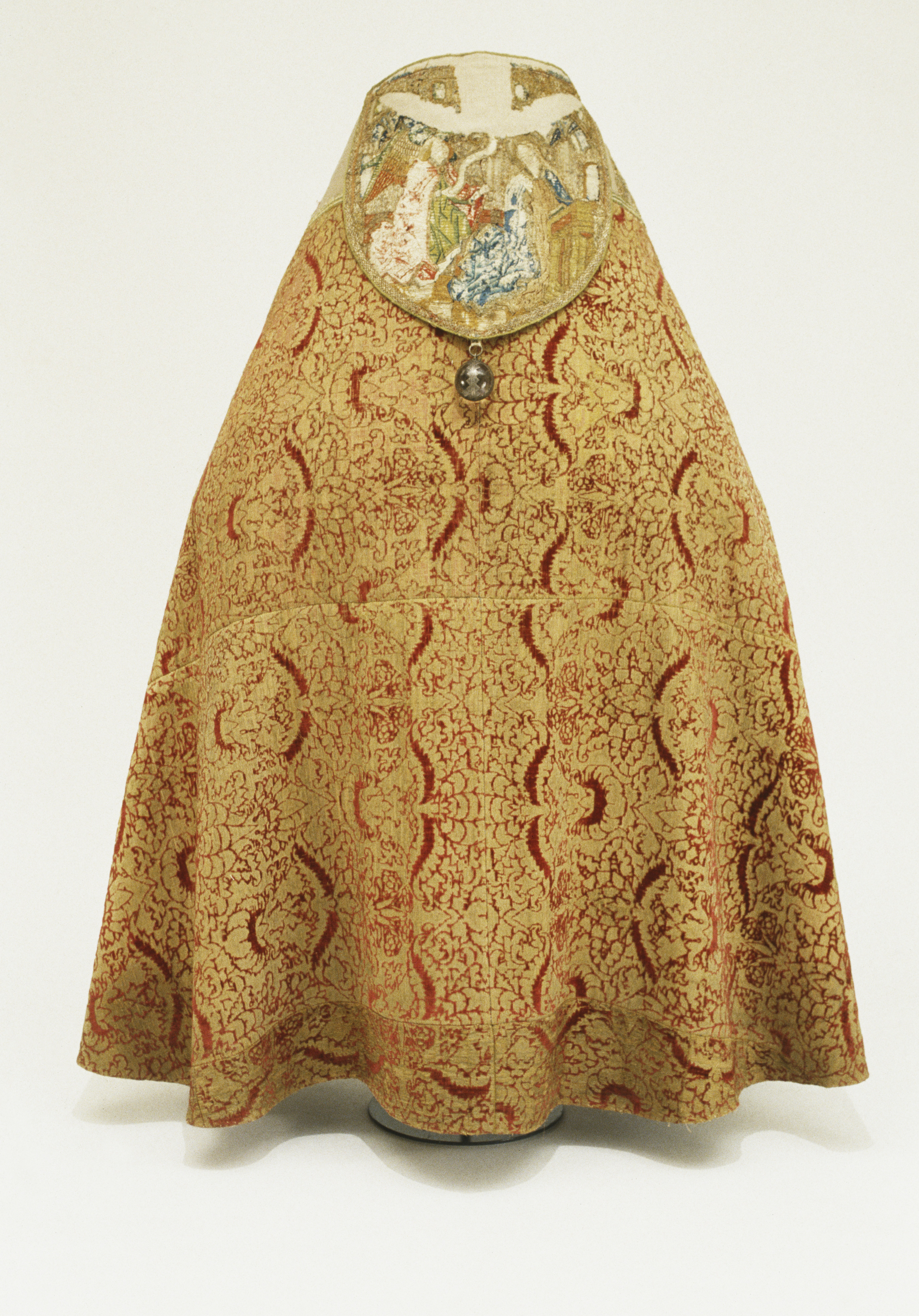 Röd sammetsbrokad med tistelmönster, Italien. Figurbroderat bräm och ryggsköld i guld och silke på lärft. Sköld: Bebådelsen. Bräm: S. Tomas, S. Johannes?, S. Simon, S. Jakob dy, S. Jakob dä. Flandern. Ursprungligen rött lärftfoder. Inköpt 1851.