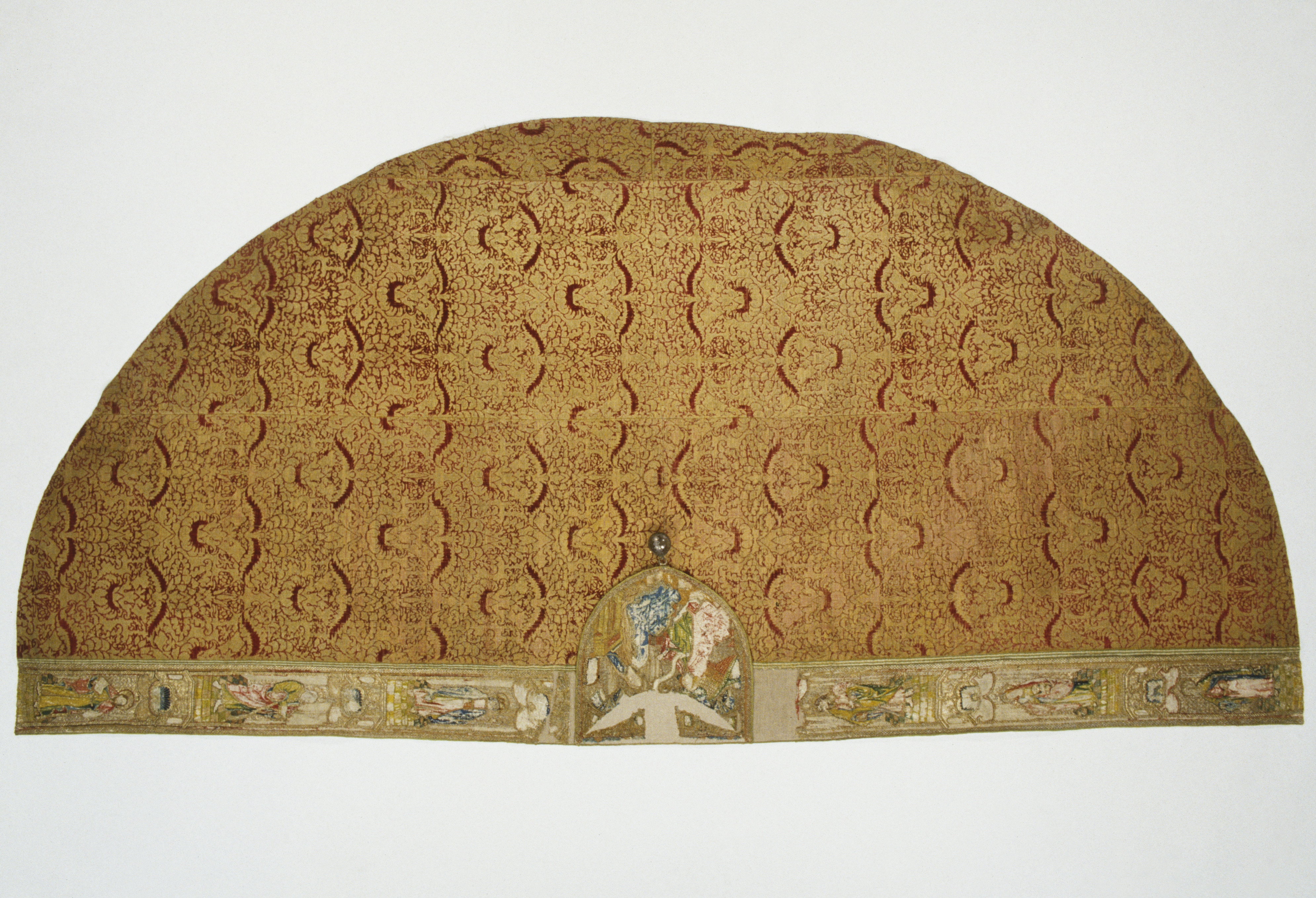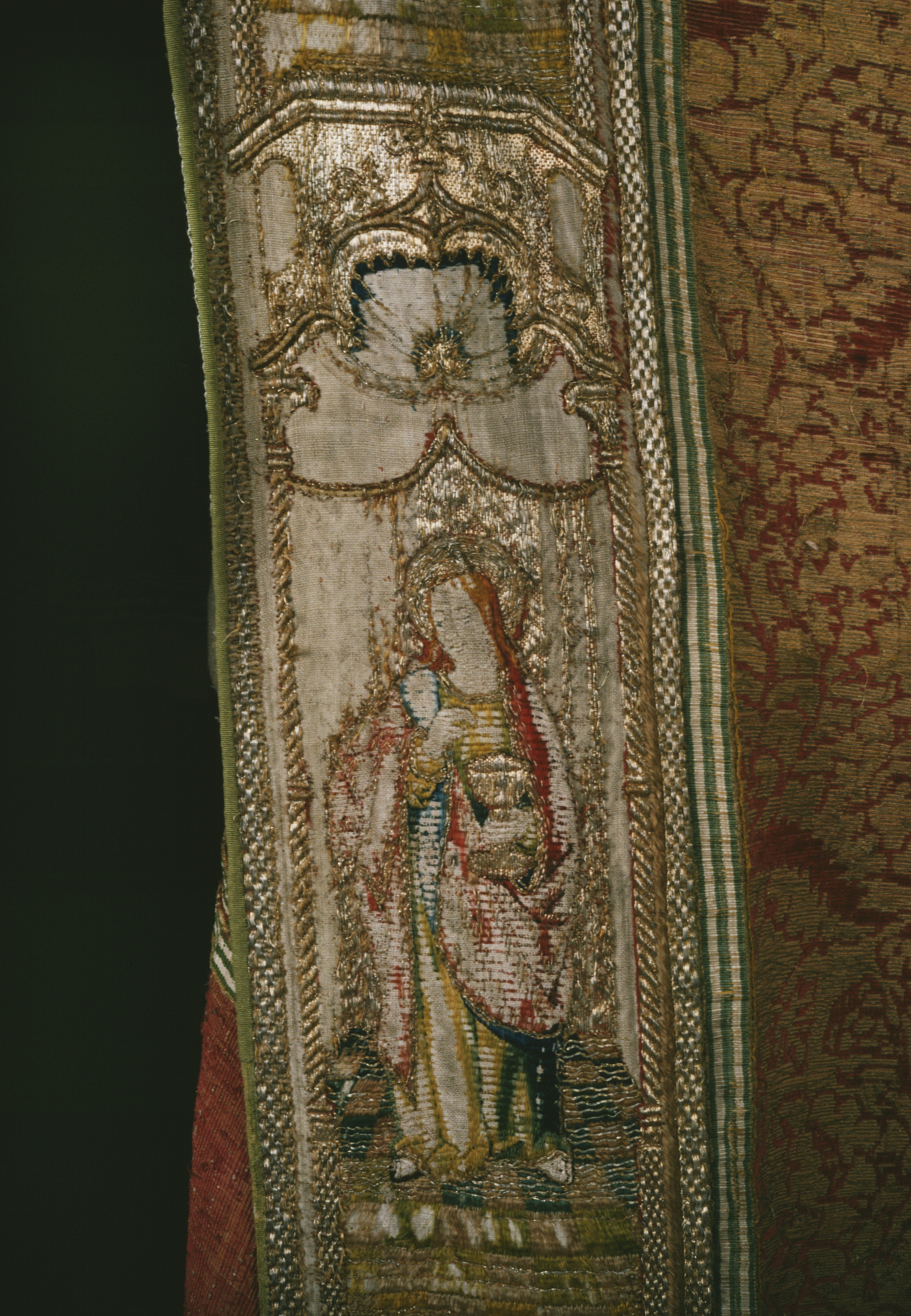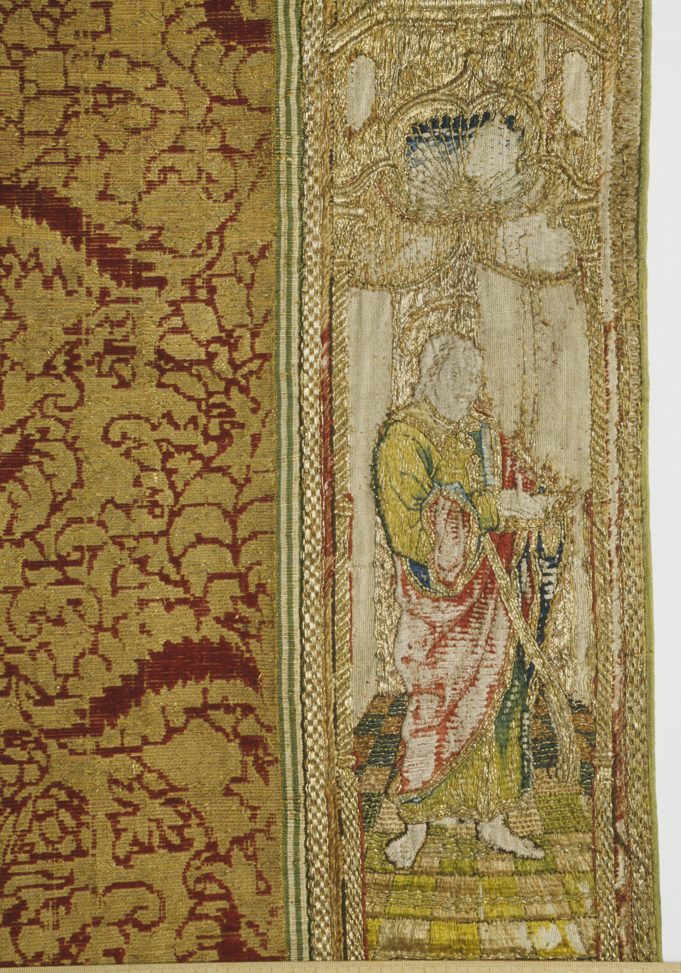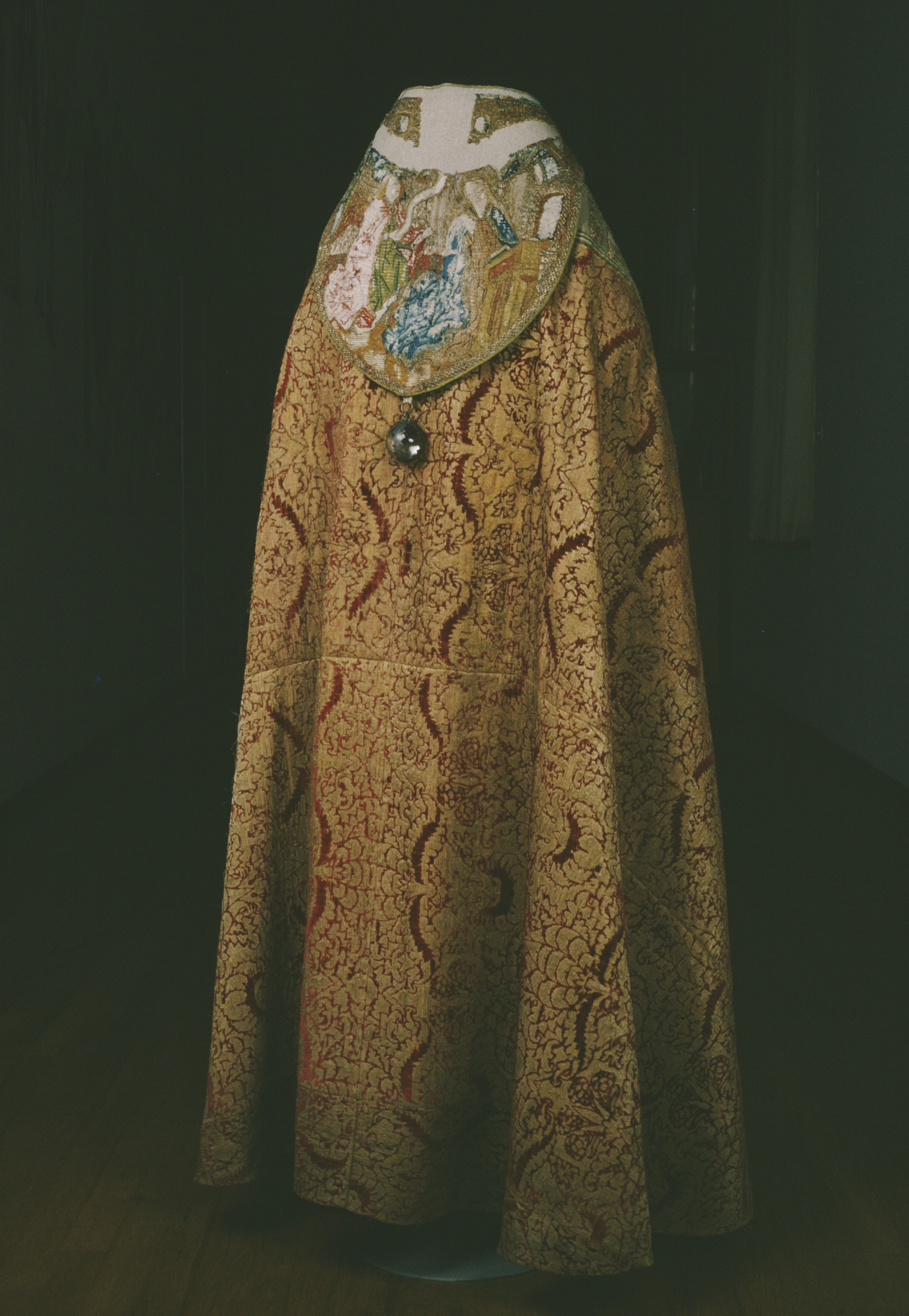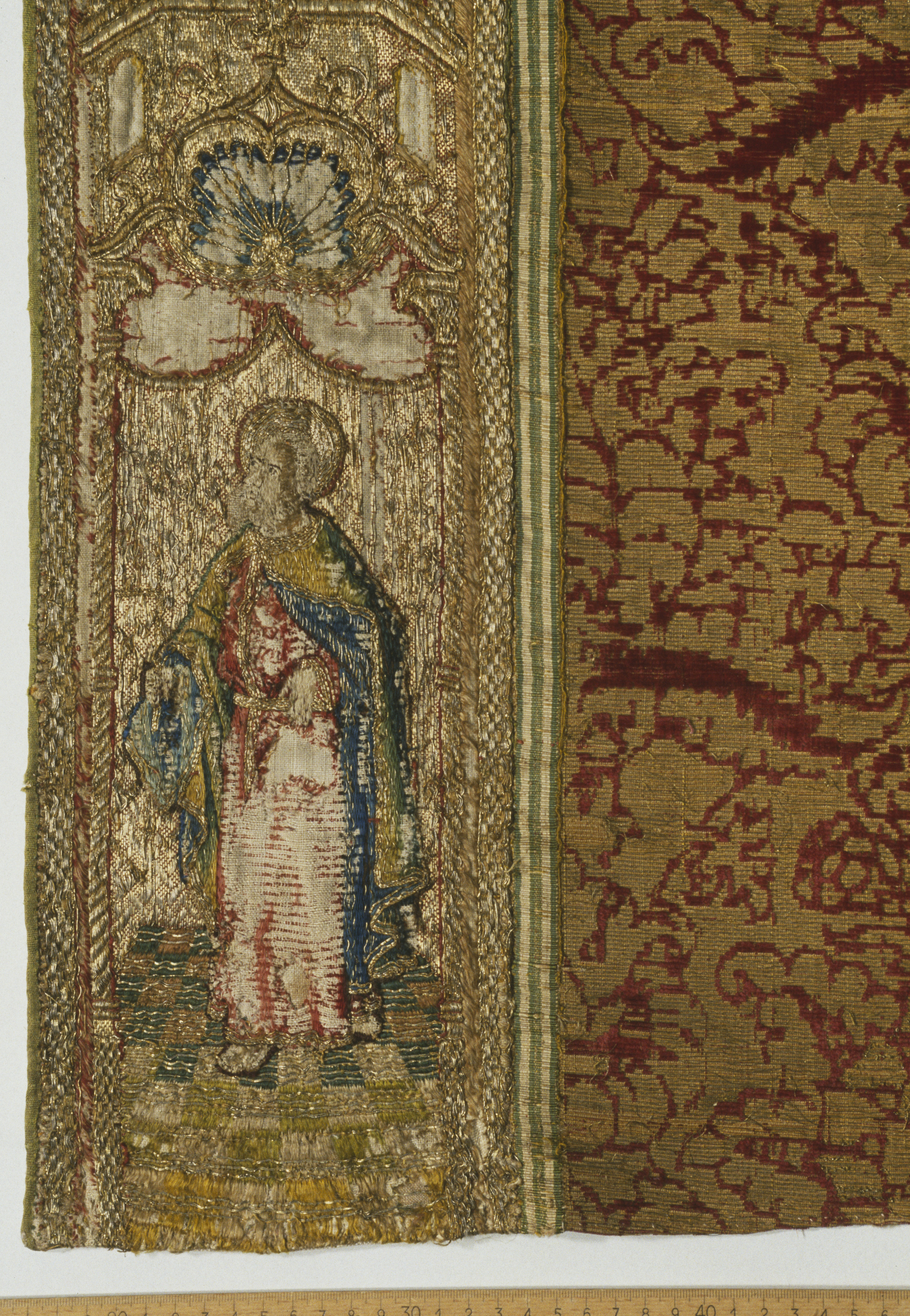 Röd sammetsbrokad med tistelmönster, Italien. Figurbroderat bräm och ryggsköld i guld och silke på lärft. Sköld: Bebådelsen. Bräm: S. Tomas, S. Johannes?, S. Simon, S. Jakob dy, S. Jakob dä. Flandern. Ursprungligen rött lärftfoder. Inköpt 1851.