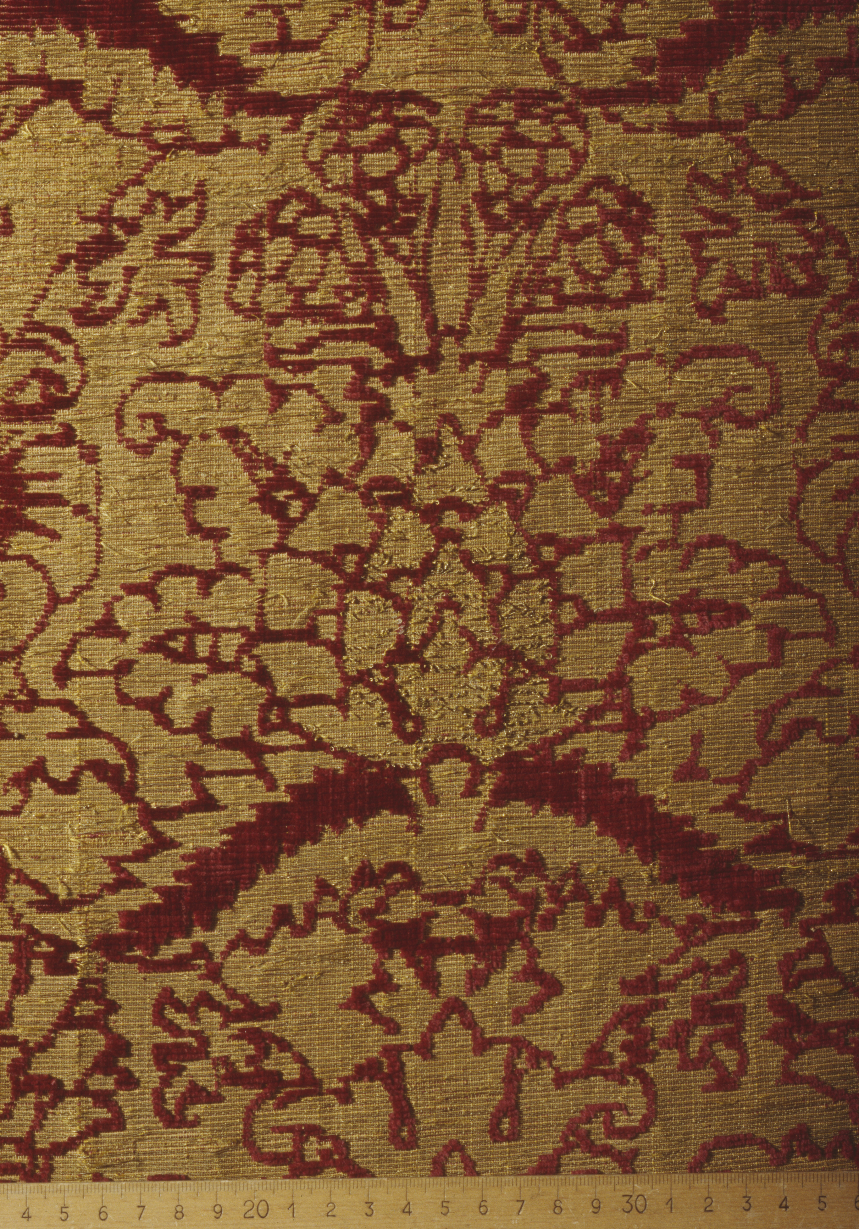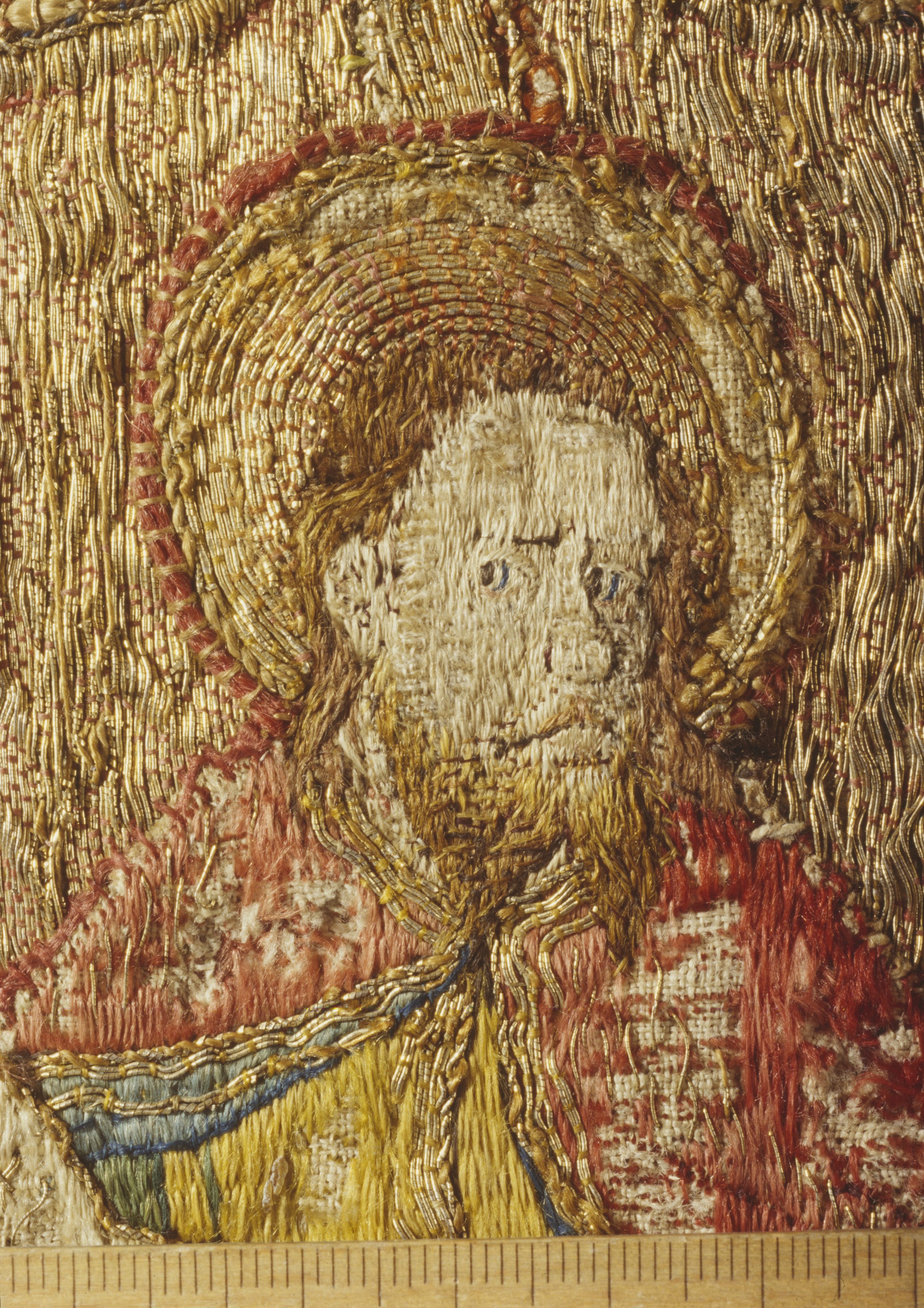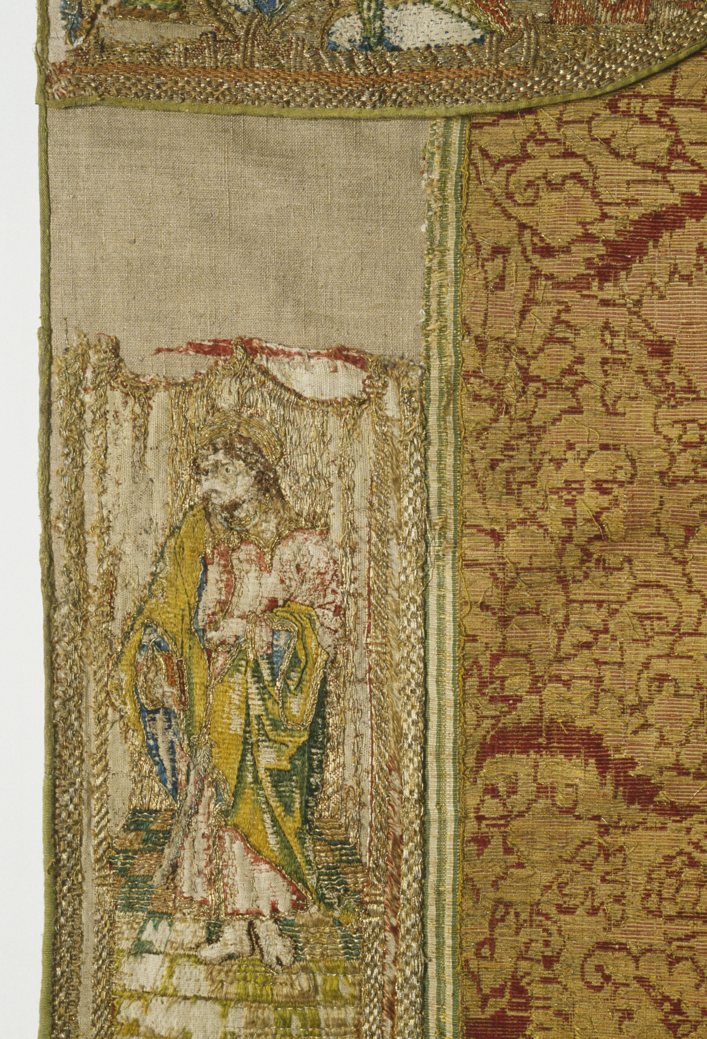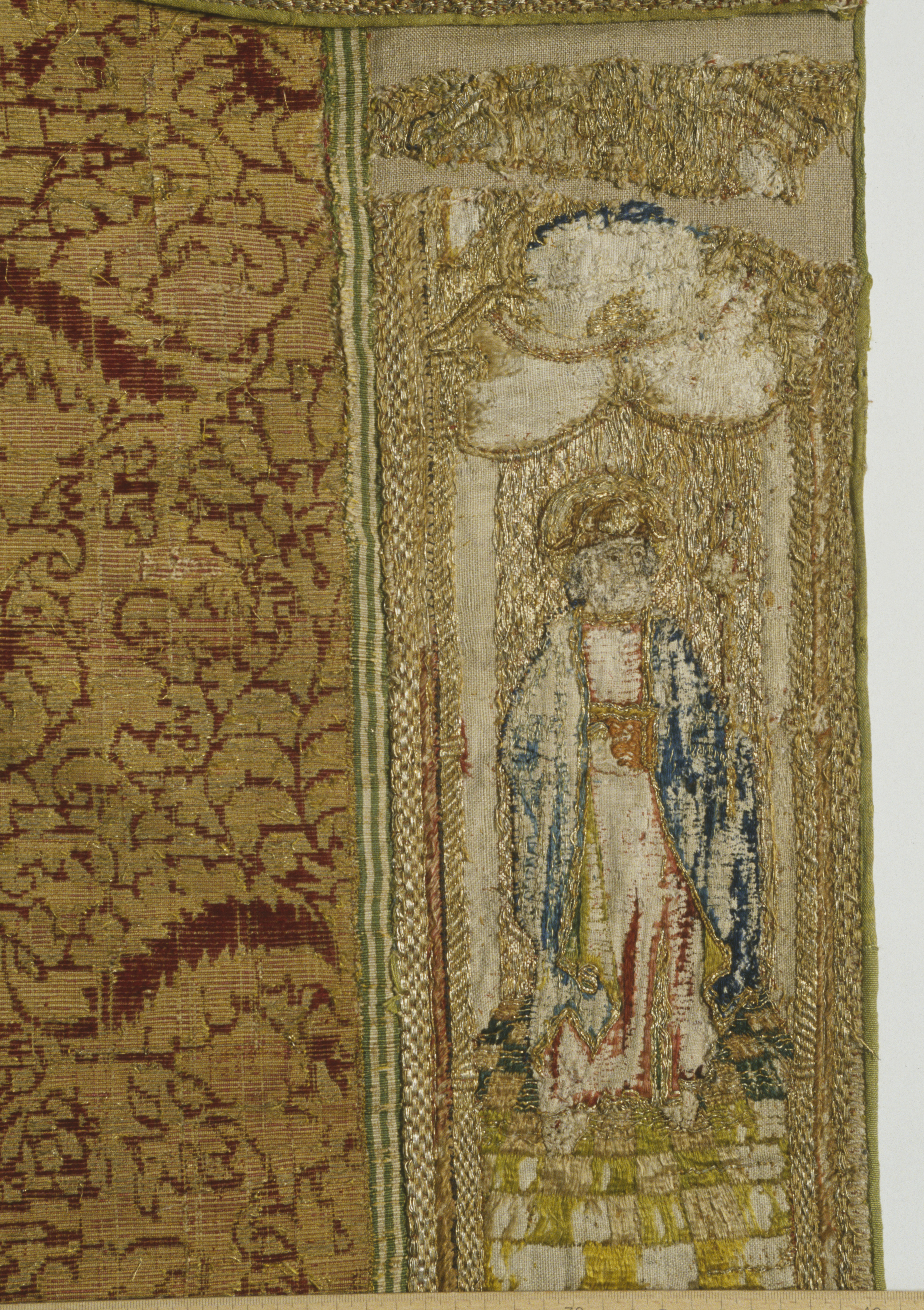 Röd sammetsbrokad med tistelmönster, Italien. Figurbroderat bräm och ryggsköld i guld och silke på lärft. Sköld: Bebådelsen. Bräm: S. Tomas, S. Johannes?, S. Simon, S. Jakob dy, S. Jakob dä. Flandern. Ursprungligen rött lärftfoder. Inköpt 1851.