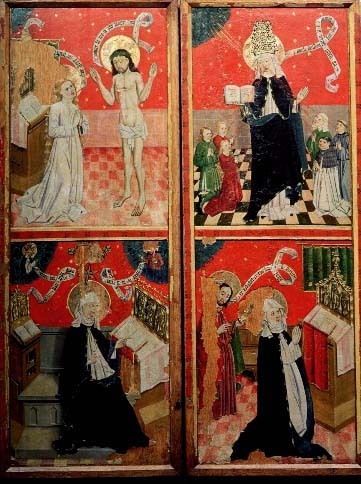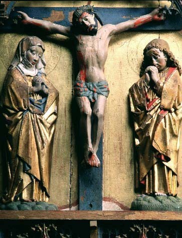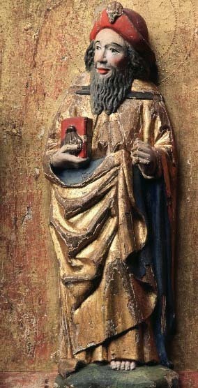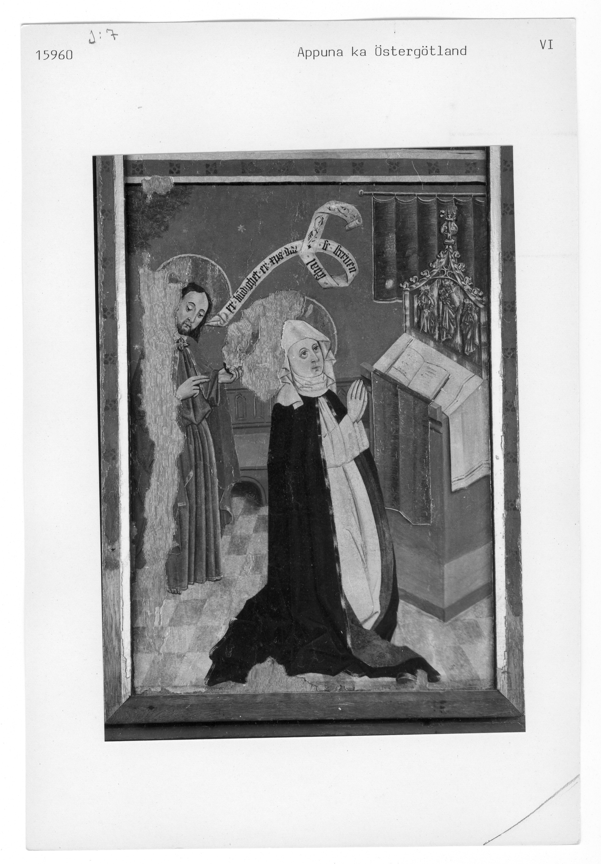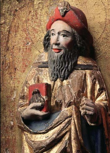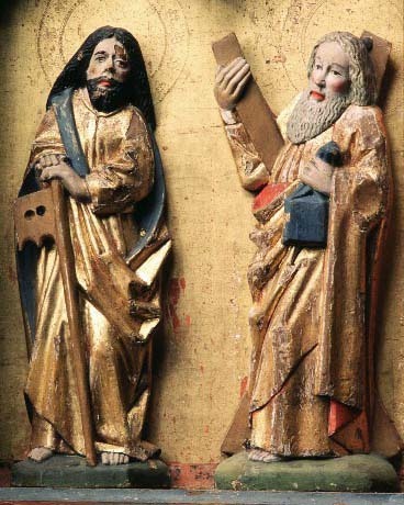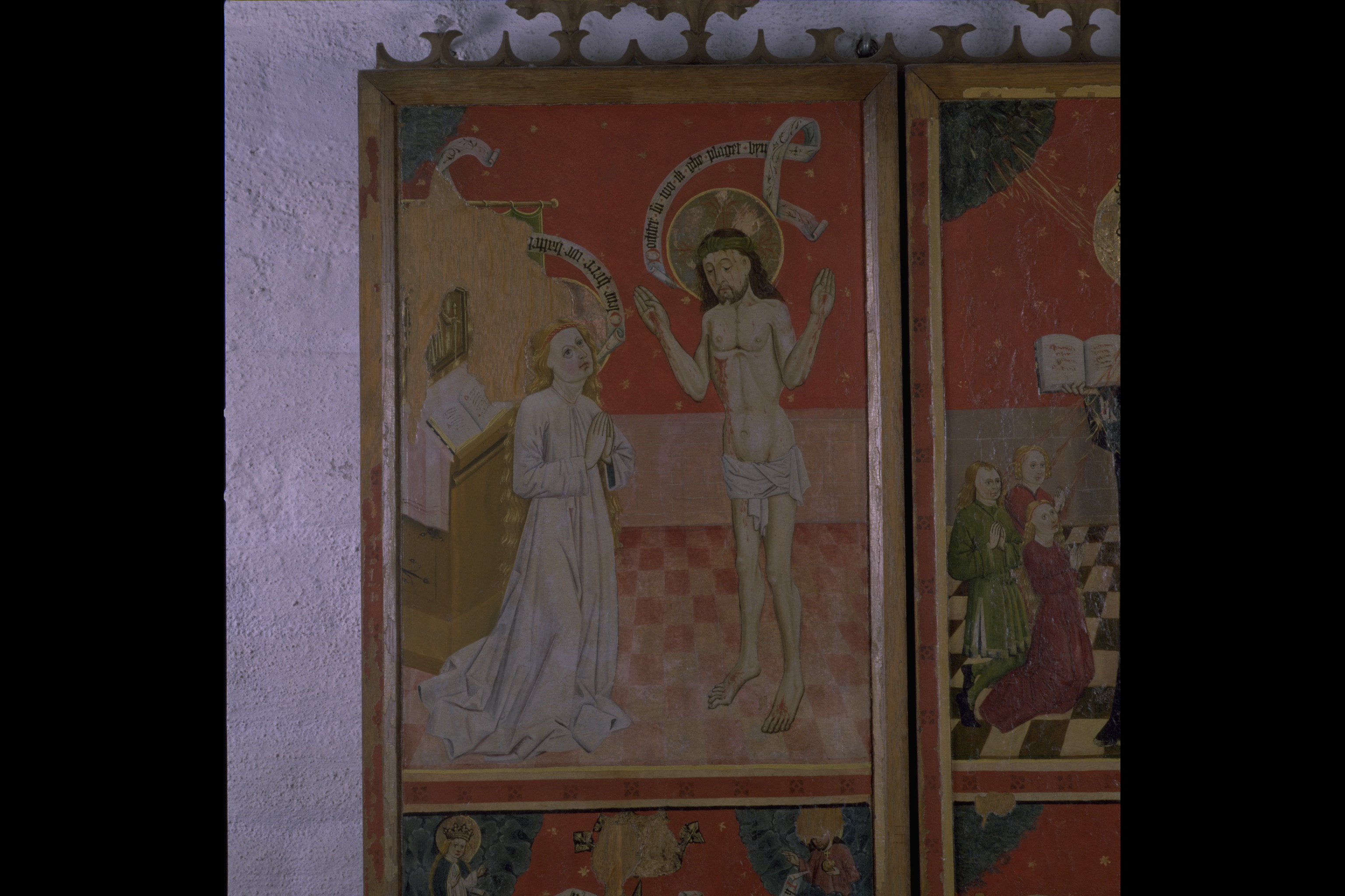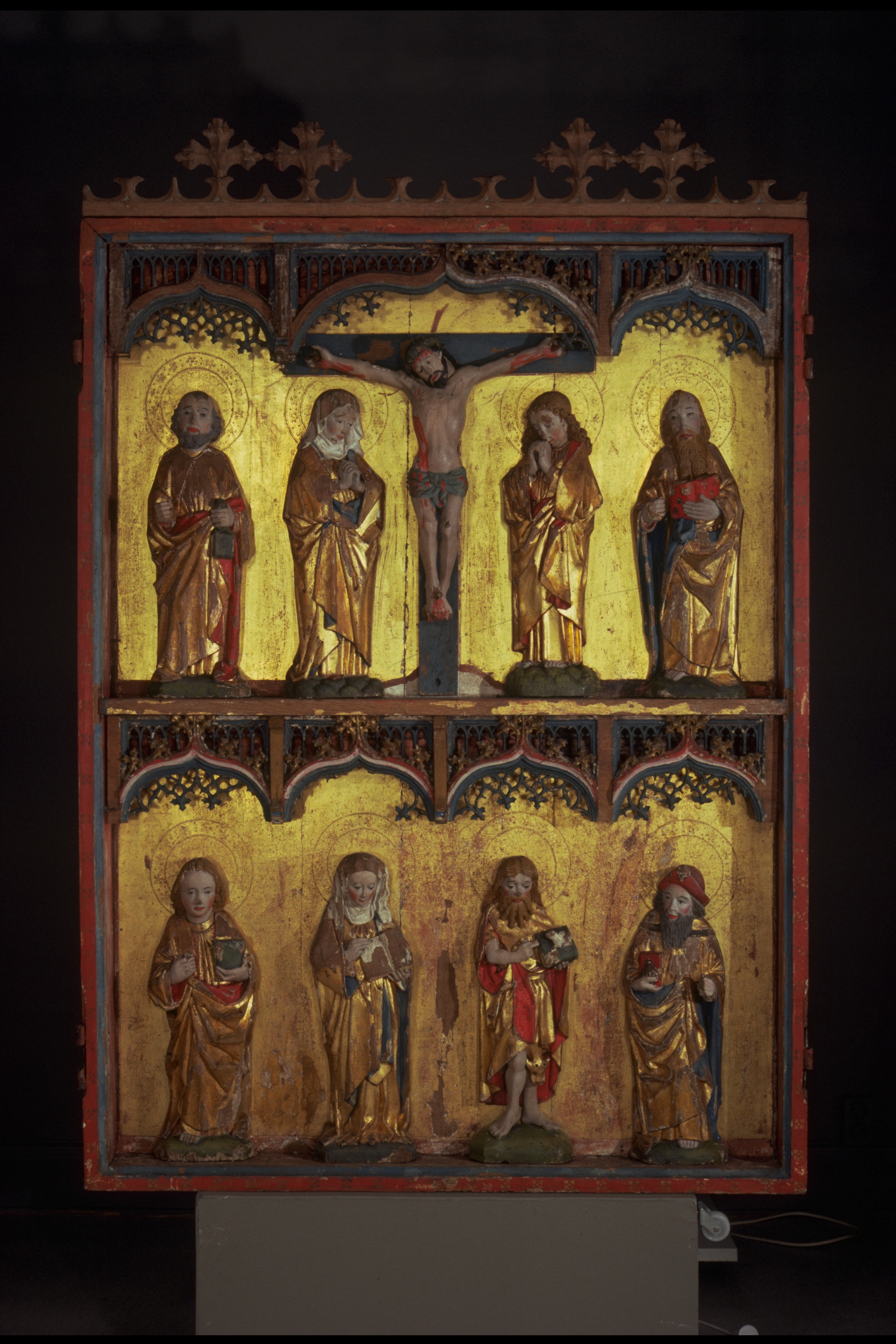 Kondition: några attribut och andra detaljer förlorade. Färg: både skulptur och målningar i huvudsak välbevarade.