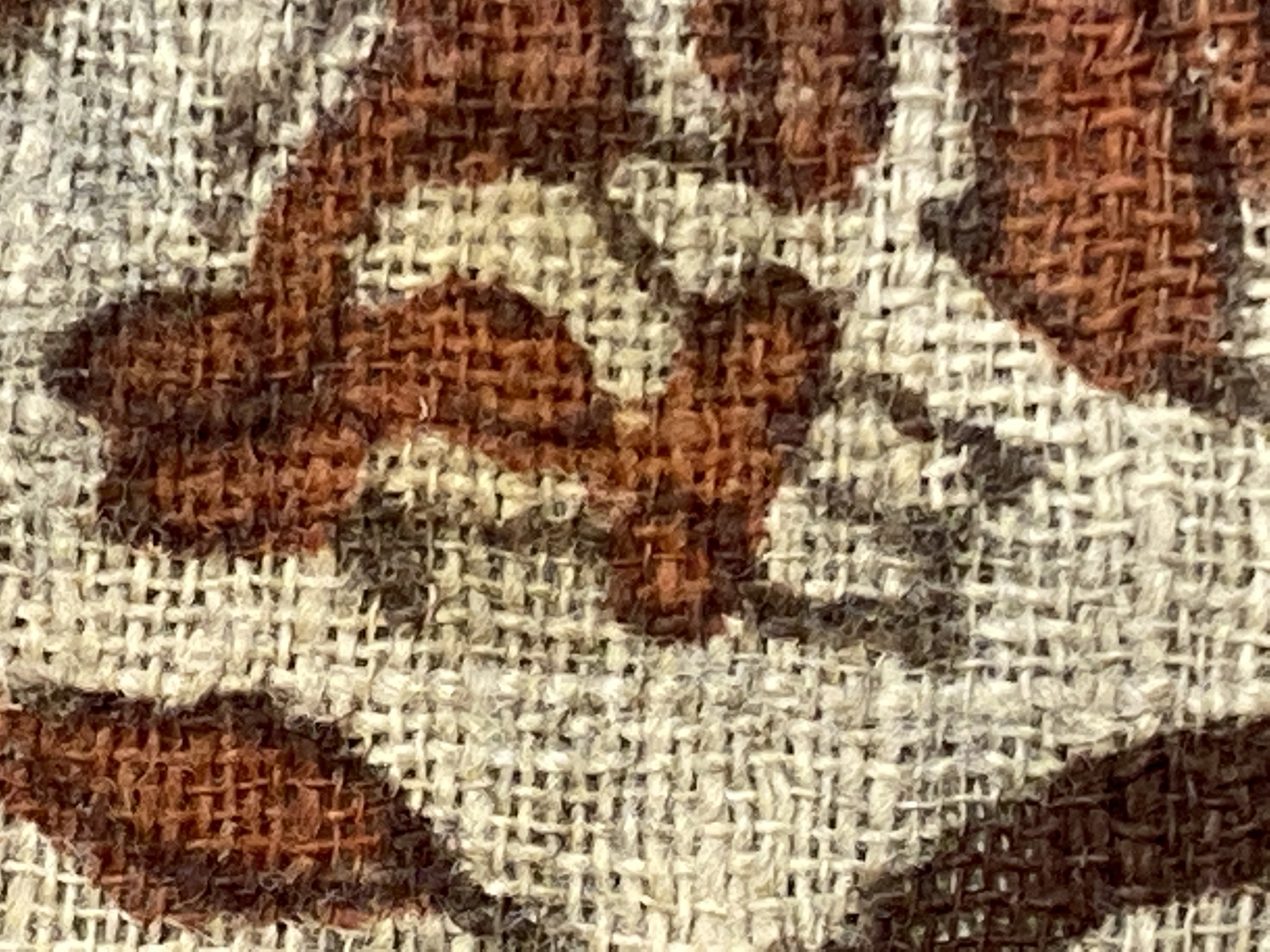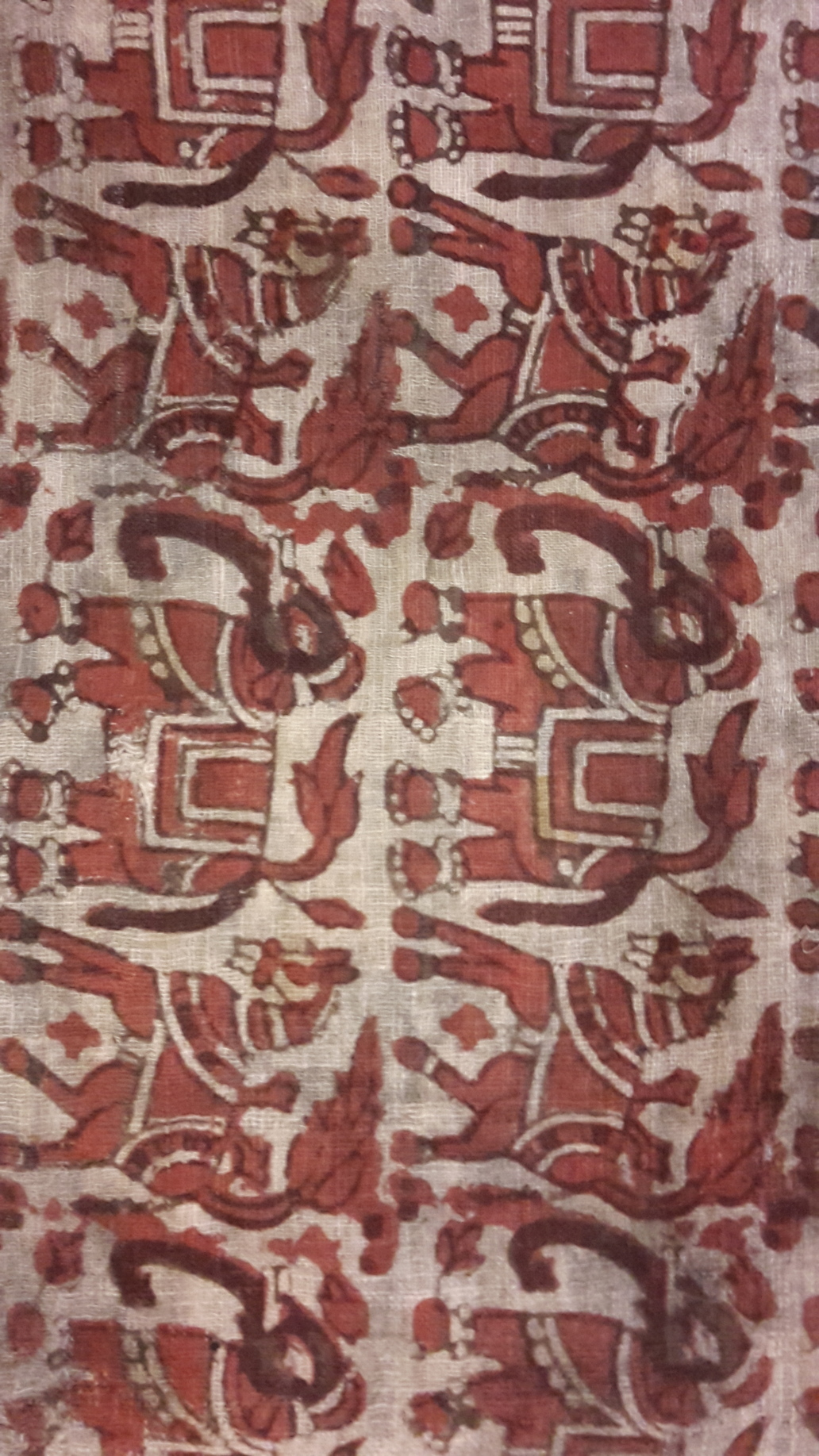Gråvitt tuskaftat bomullstyg med tryckt mönster i två nyanser rött. Motiv av hästar och elefanter på rad. Tryckta bårder i ena kortändan. Indiskt arbete. Understödd med grått bomullstyg vid konservering. Inköpt 10 oktober 1879 av Arthur Hazelius hos artisten H. Verner i Lidköping.