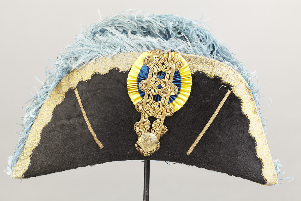 Enligt uppgift av givaren använd av Magnus Fredrik Ferdinand Björnstjerna (1779 - 1847) som minister i London 1828 för vagnsbetjäning samt av sonen Carl Magnus Ludvig B. (1817-1888) vid hans diplomatiska uppdrag i S:t Petersburg 1872 och 1881. Livréhatt bicorne av svart silkesfelb, bestående av en rund kulle samt ett främre och ett bakre större brätte vikta uppåt. Hatten avsedd att bäras tvärs över huvudet. Kantad med 30 mm bred guldgalon och ljusblå kant av strutsfjädrar. Framtill en gul och blå kokard 98 mm i diameter, framför denna sutascher, fyra stycken av lindade lan samt två längsgående bredare. Nederst en förgylld mässingsknapp 30 mm i diameter med ätten Björnstjernas vapen i relief. Foder av violett siden. I kullen tryckt guldtext: "C.J. LORENZ STOCKHOLM Norrbro No 7". Nedtill kant av svart läder (svettrem).