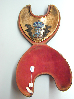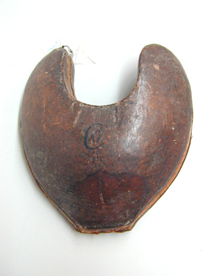 Formsnidat fodral, överklätt med mörkbrunt skinn. På ovansidans mittpålagt monogram: C XV. På undersidan inpressad otydlig stämpel. Fodralet invändigt klätt med sämskat rödfärgat skinn. Upptill två små öglor av mässing.