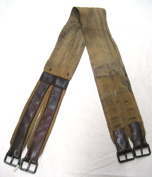Gjord av grovt ofärgat textilband, ihopsydd längs mitten med grön tråd. Delar sig i ändarna och löper ut i två parallella band med bruna läderremmar på ovansidan och spänne i änden. Där banden delar sig finns en fastsydd, tvärställd läderrem, bredd: 34 mm, längd: 88 mm. Fyra fyrkantiga spännen i ändarna, liggande rektanglar, av järn med en nål.