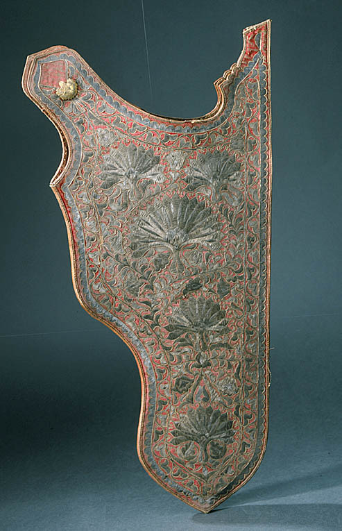 Koger av läder. Utsidan klädd med röd sammet med yttäckande ornering i form av broderi av silver och guldtråd i palmett och blomstermönster på applicerat läder utskuret i mönstrets form. I ena övre hörnet välvt palmettformigt beslag av förgyllt silver med graverad dekor. Kantat med brunt läder. Insidan brunt läder utan dekor.