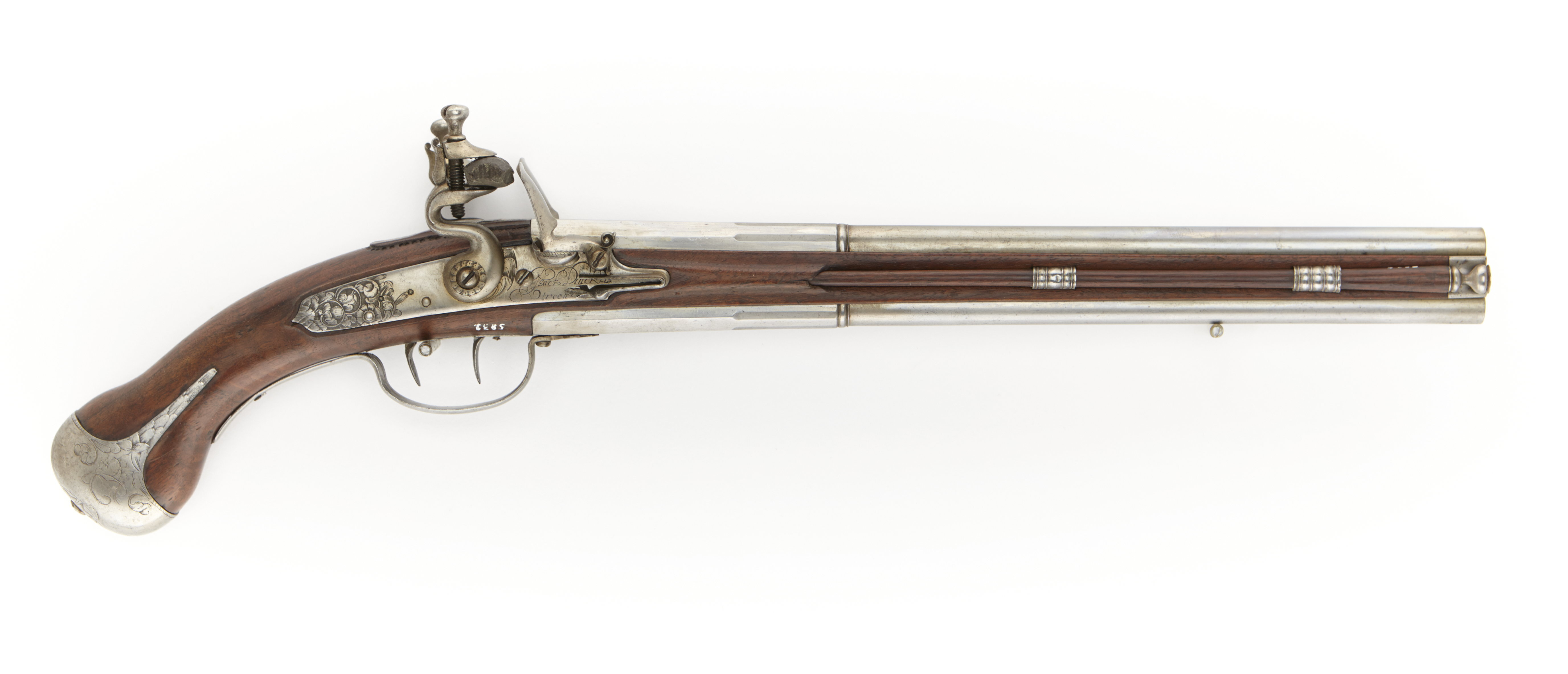 Pipor av bockkonstruktion. Runda, sextonkantiga, över kammarens bakre del åttkantiga. Slätborrade. Båda stämplade med Utrechtsvapen (Stöckel nr 1744). Flintlås. Ett på stockens vardera sida. Svagt kullriga låsbleck. Under fängpannan signerade "Isack Dinckels, Utrecht". Låsbleckets bakre del med dekor av graverade blommor. Rundad hane med lös överkäke. Utvändig eldstålsfjäder. Hel stock av valnöt. Platt, rundad kolv. Kolvkappa av stål med långa, smala flikar, något graverad. På framstockens högra sida två profilerade stålrörkor. Varbygel av fransk typ. Två avtryckare. Tillbehör: Laddstock med doppsko av stål. Märkt: 52 bakom låsblecket, stanstyp 5376.