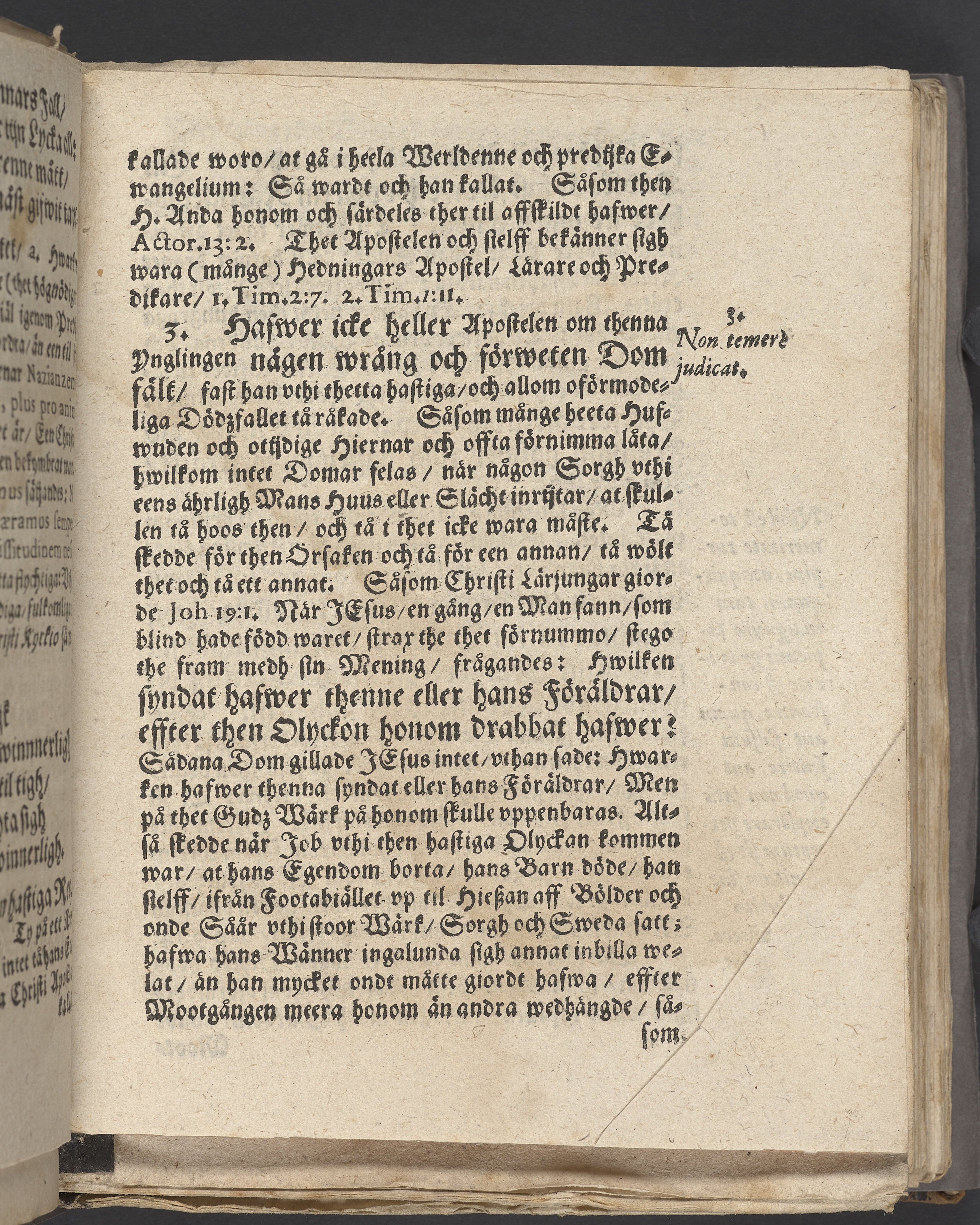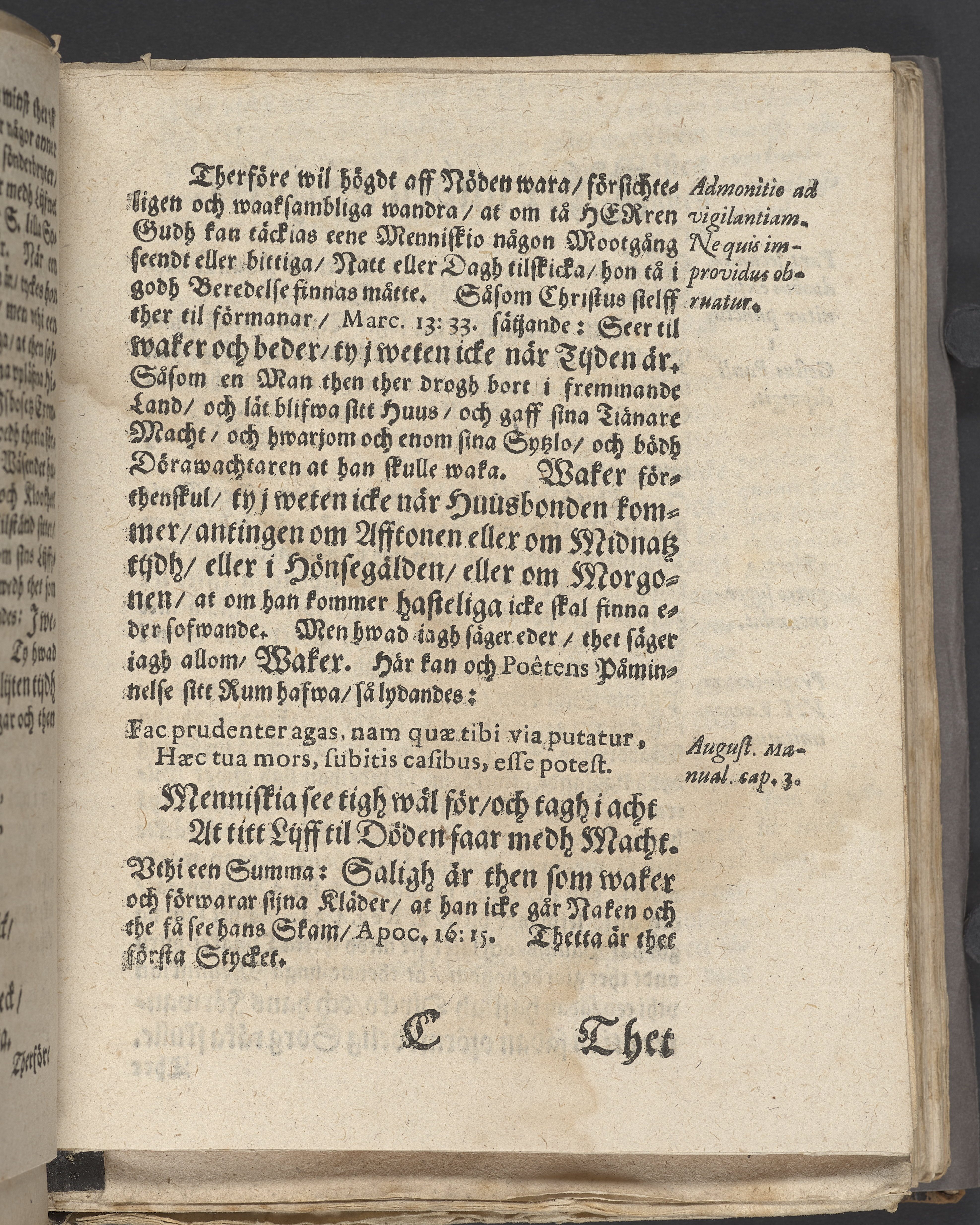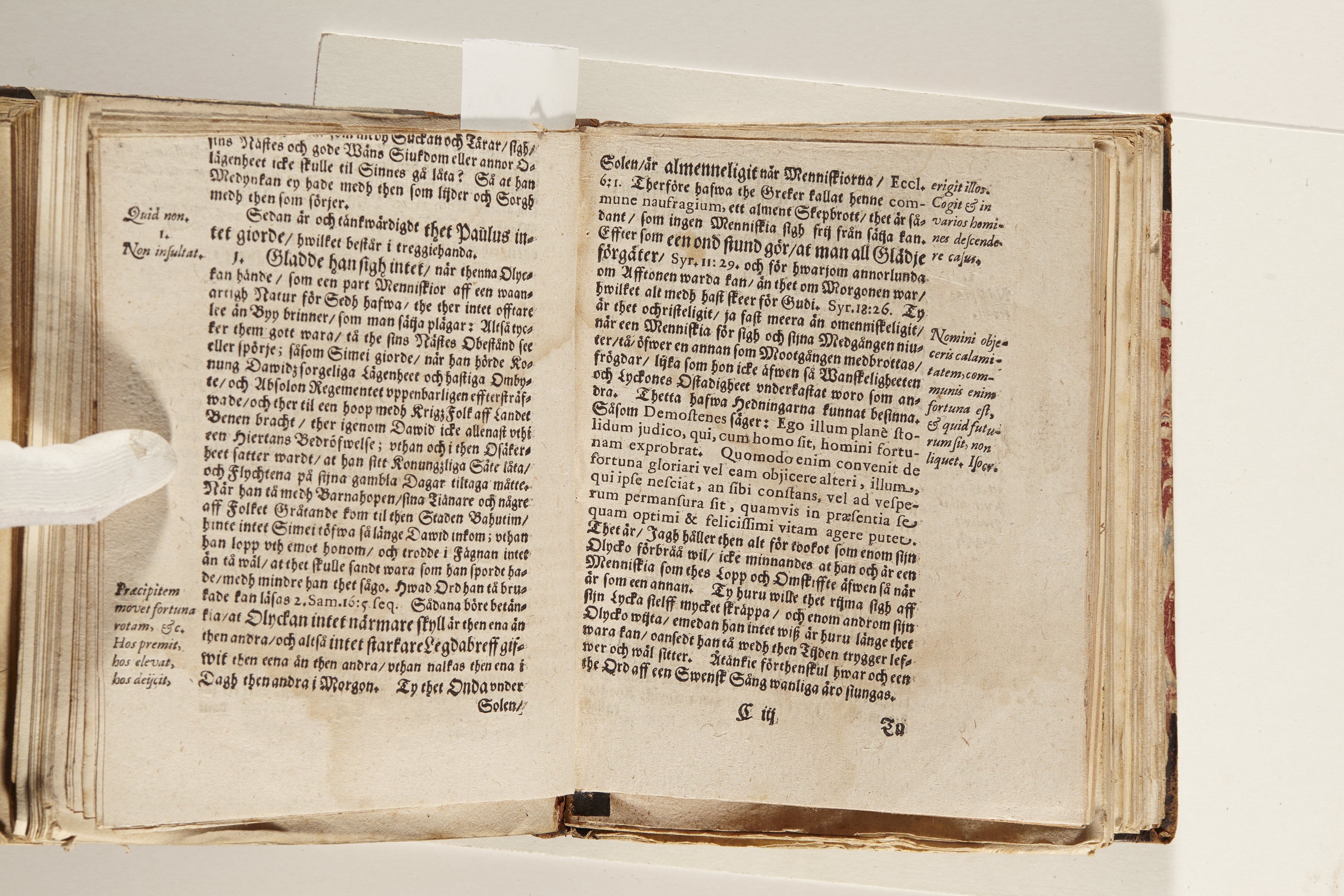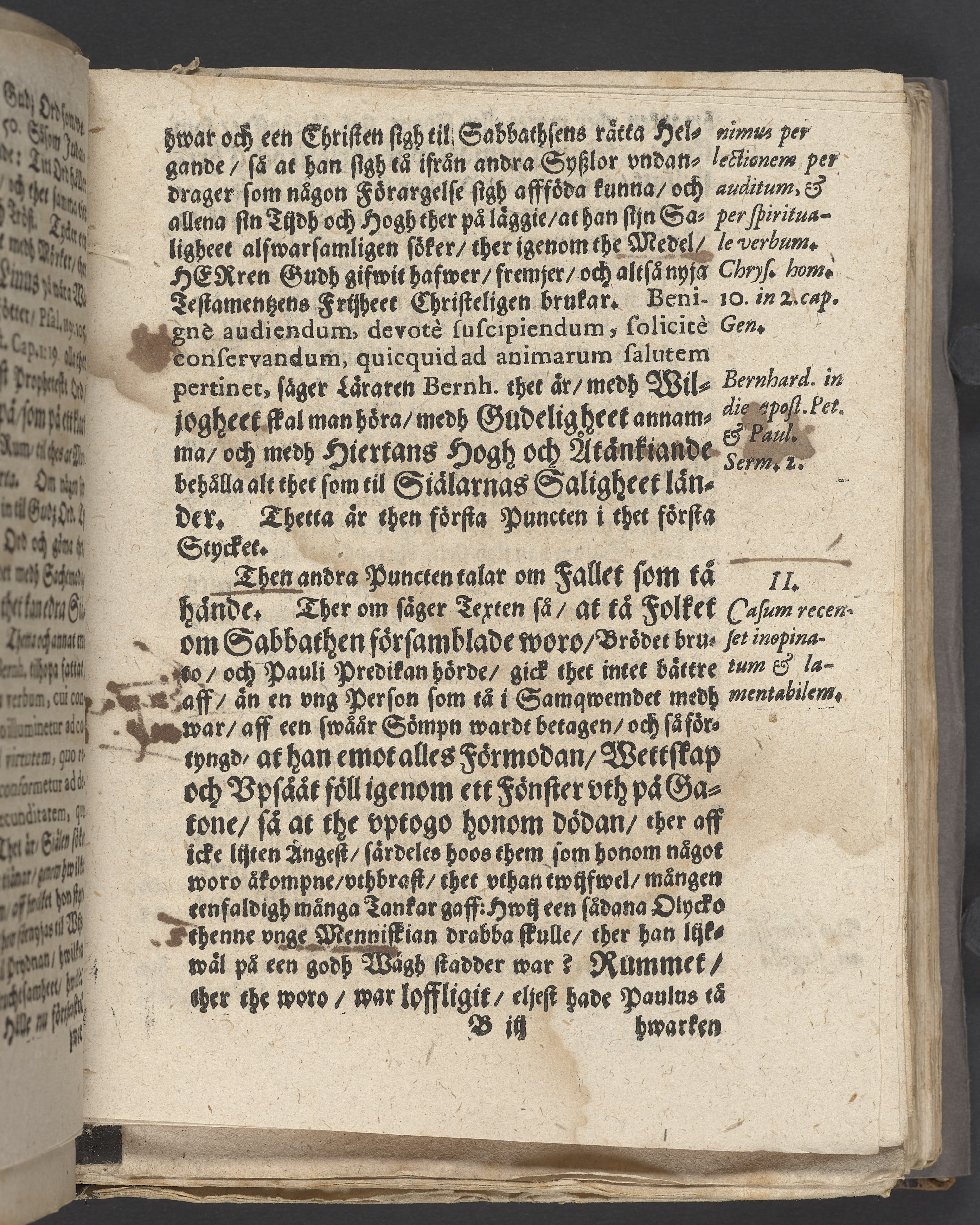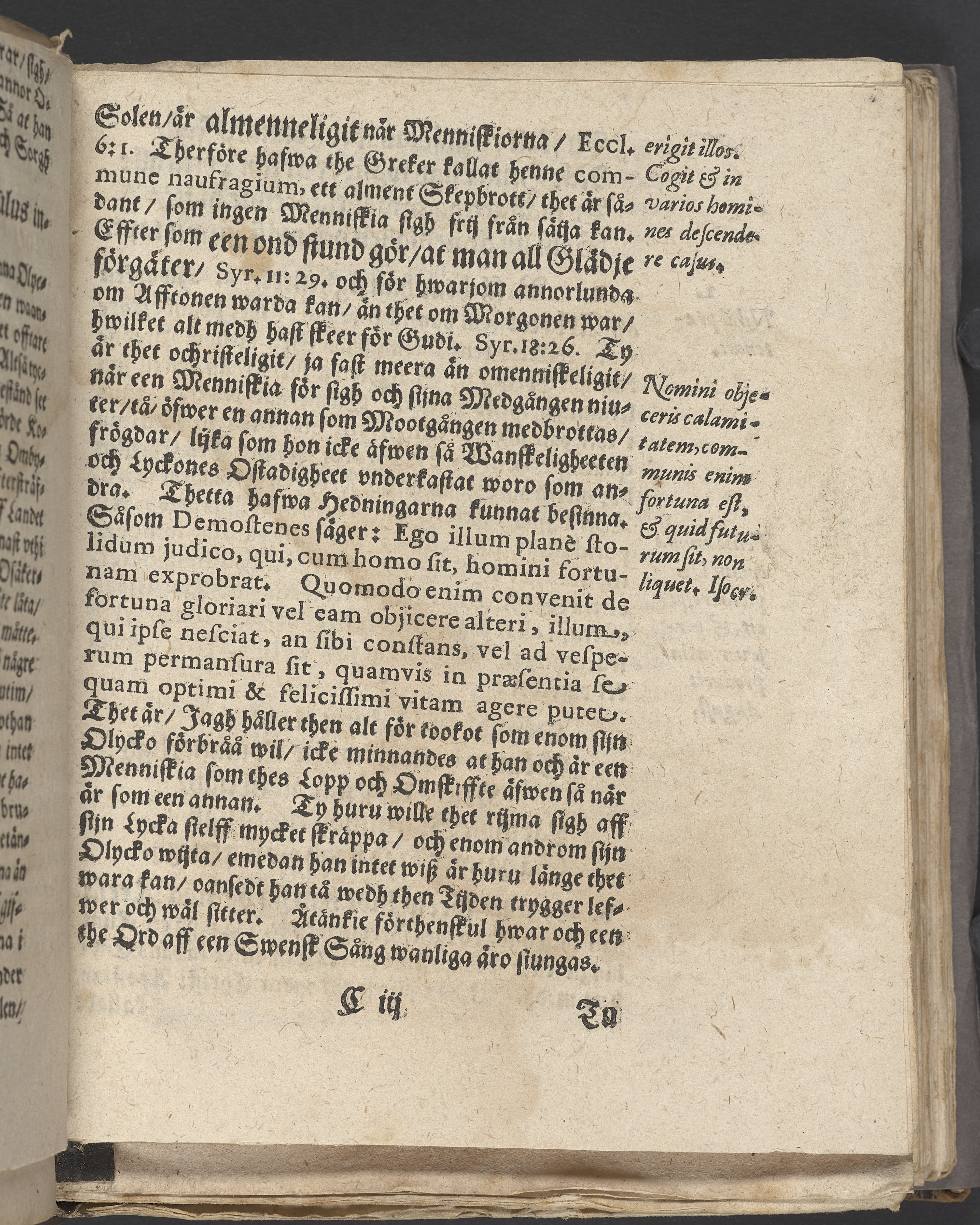 Anteckningar i brunt bläck på tre sidor. Snett skuret, så att övre raden på två sidor delvis saknas (C2 recto och verso). En av 23 skrifter häftade tillsammans i samma band.
