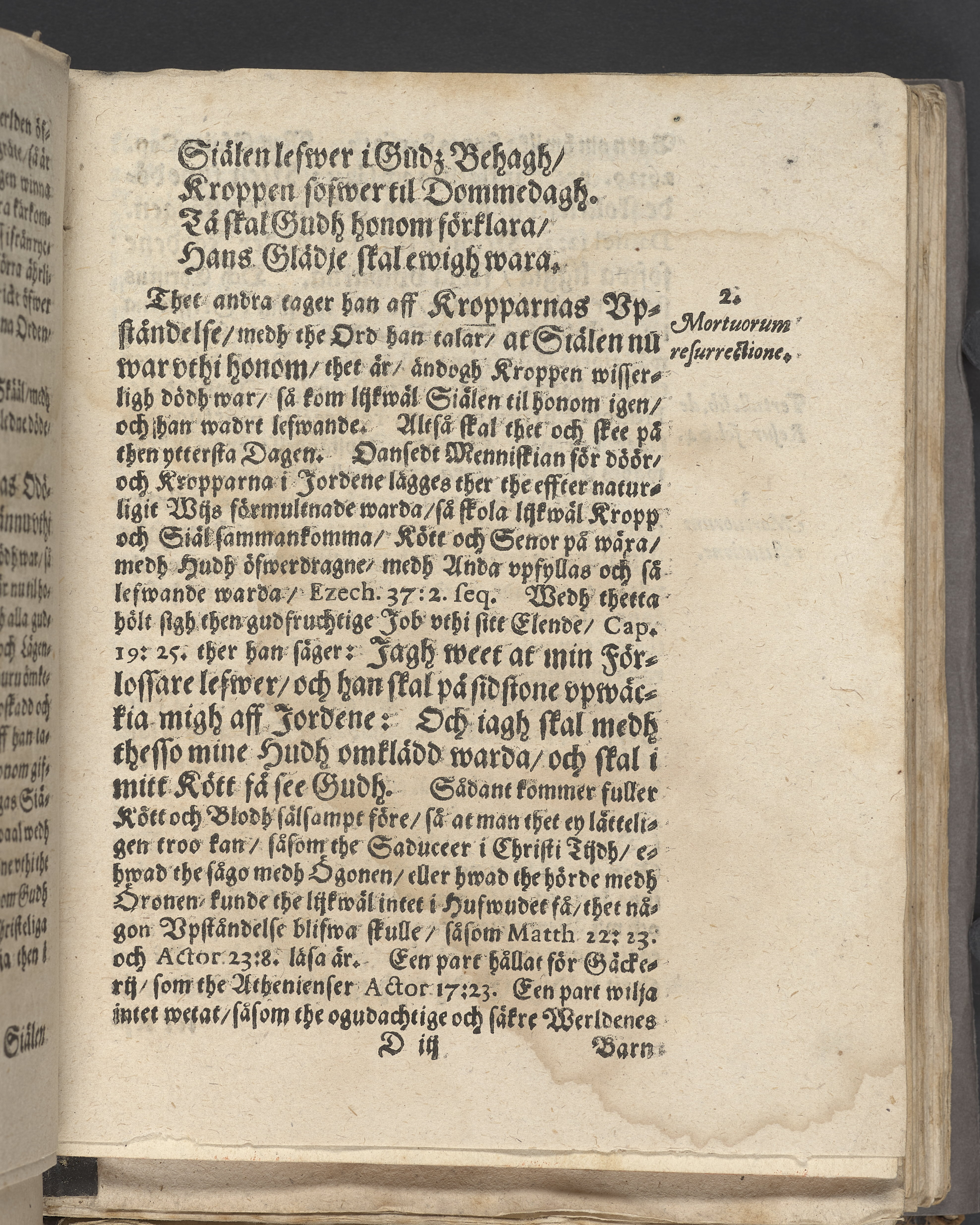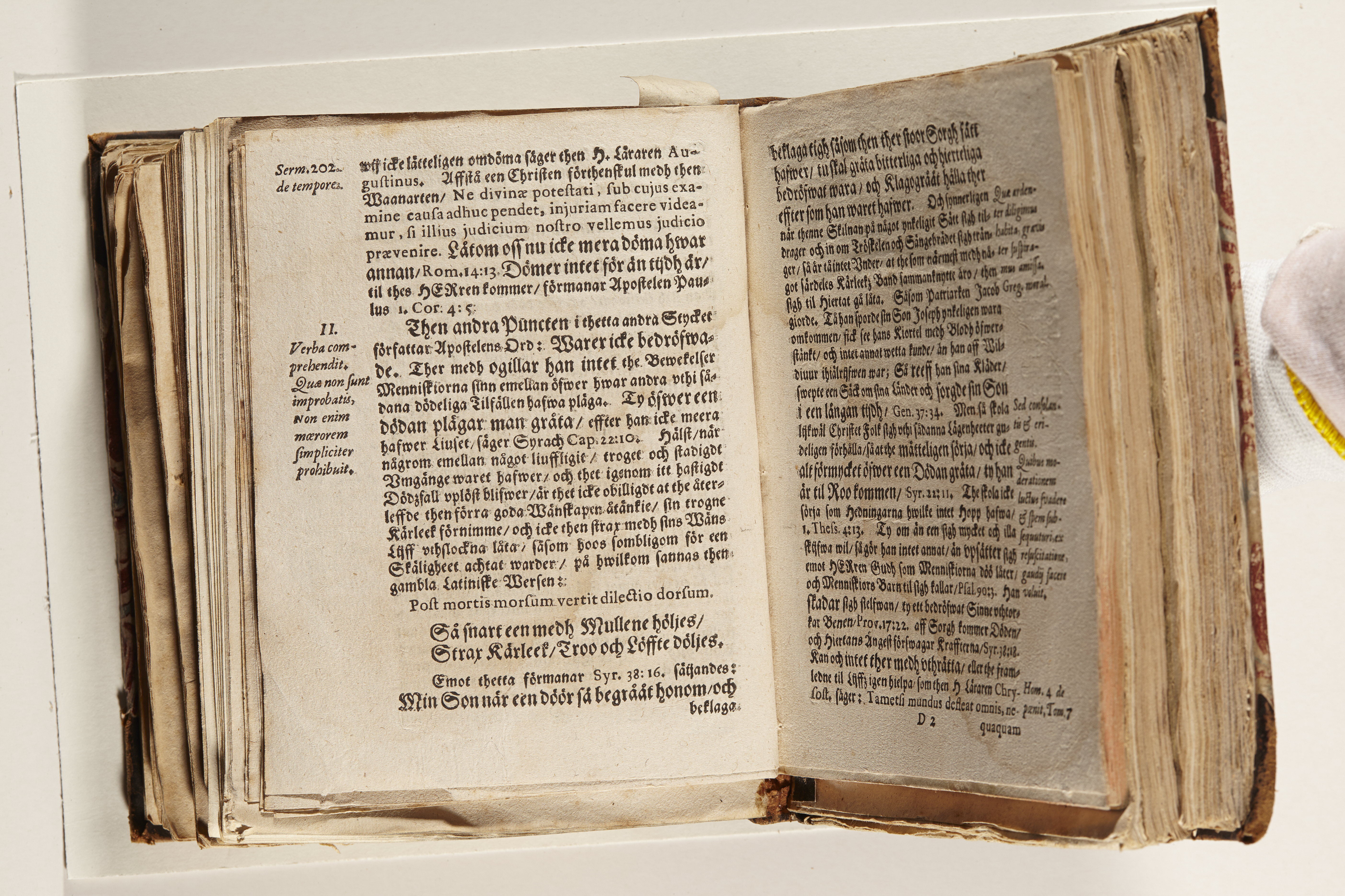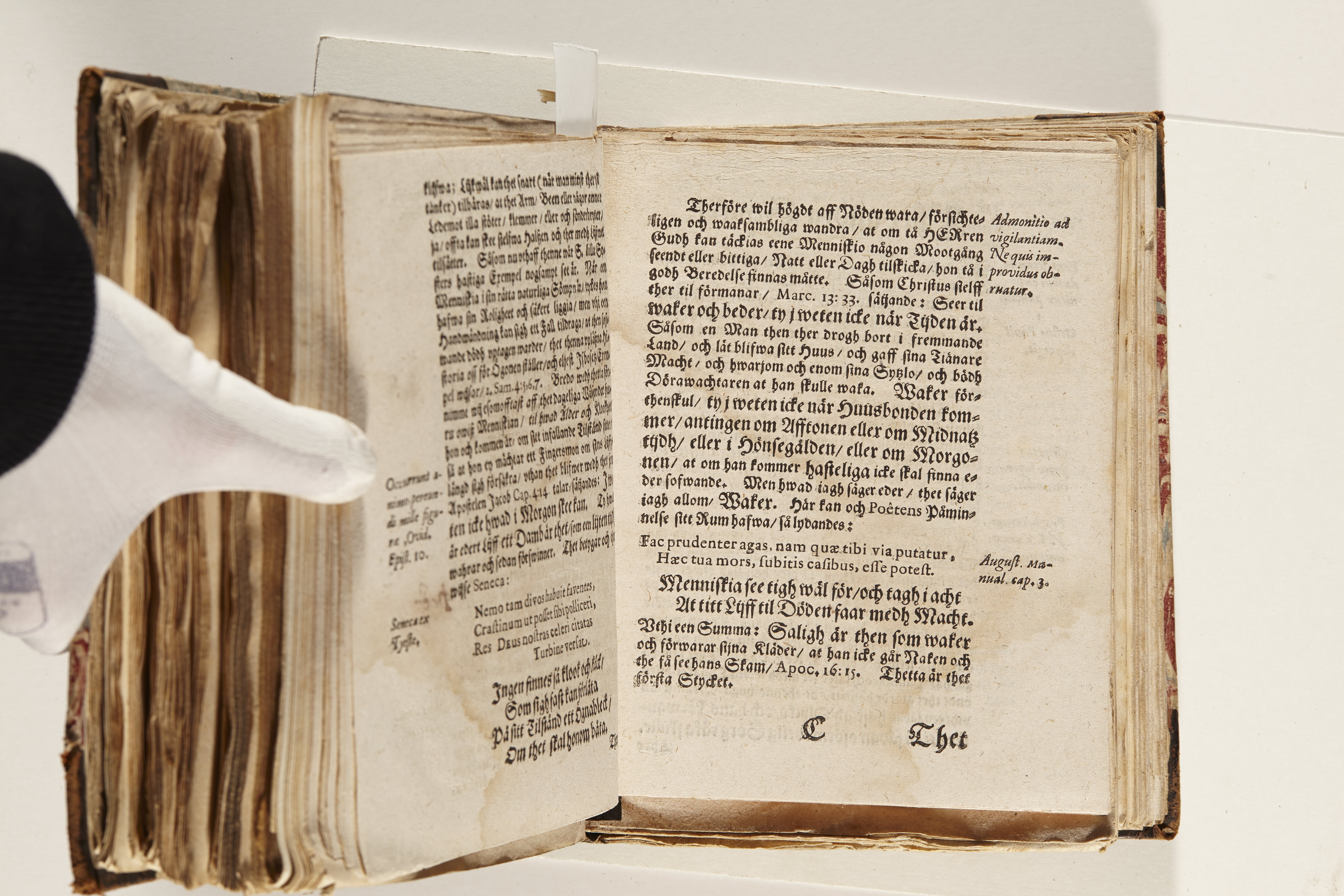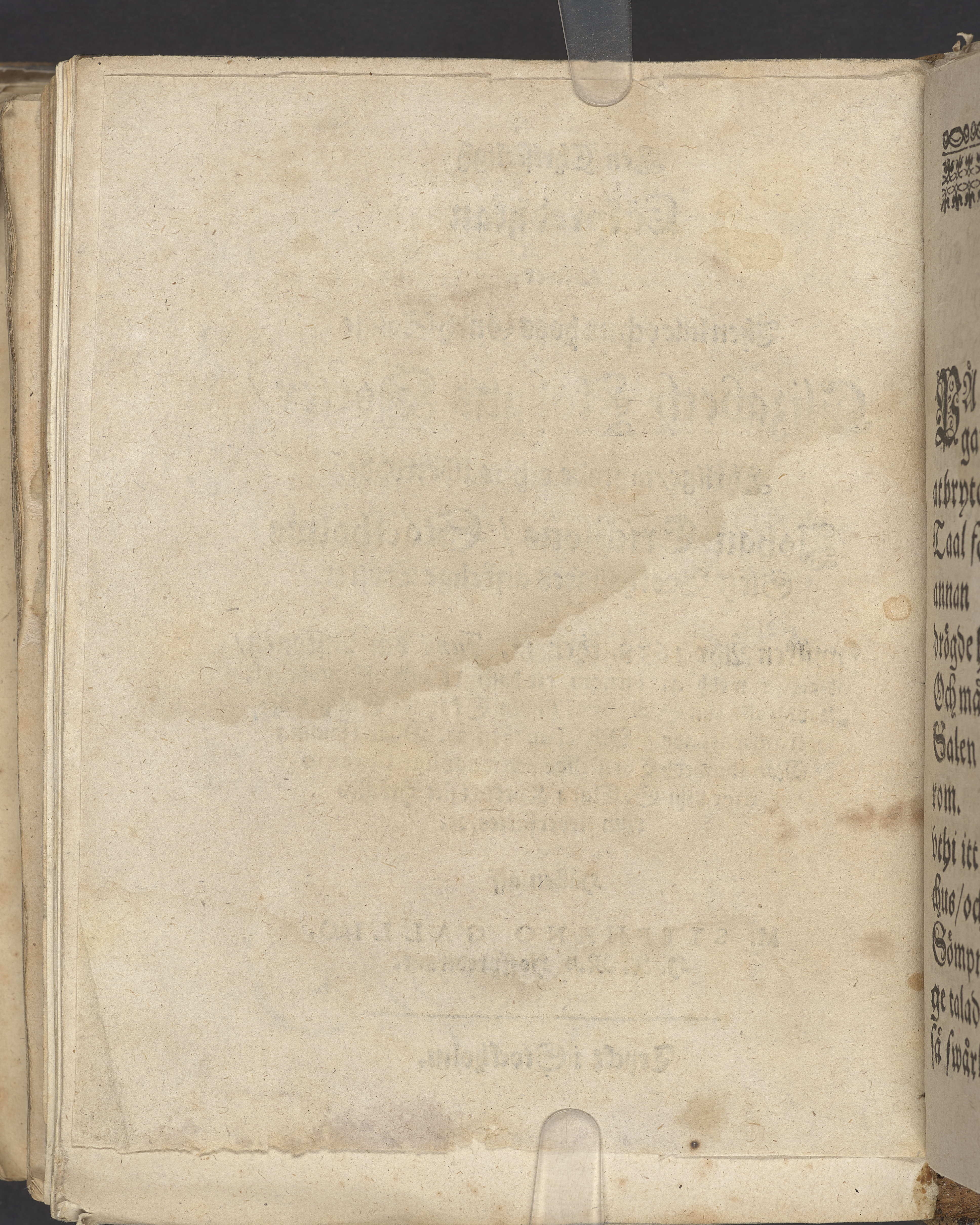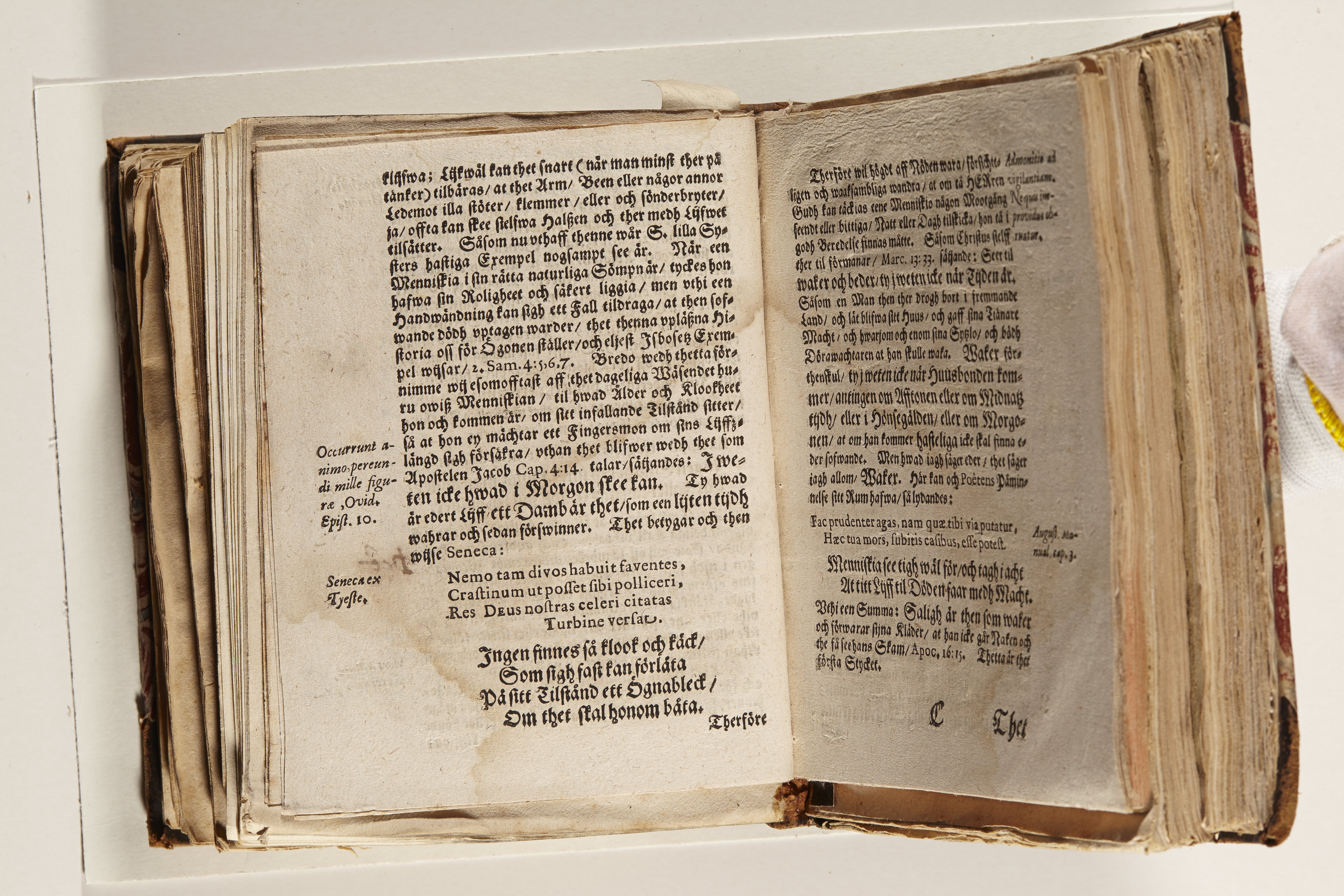 Anteckningar i brunt bläck på tre sidor. Snett skuret, så att övre raden på två sidor delvis saknas (C2 recto och verso). En av 23 skrifter häftade tillsammans i samma band.