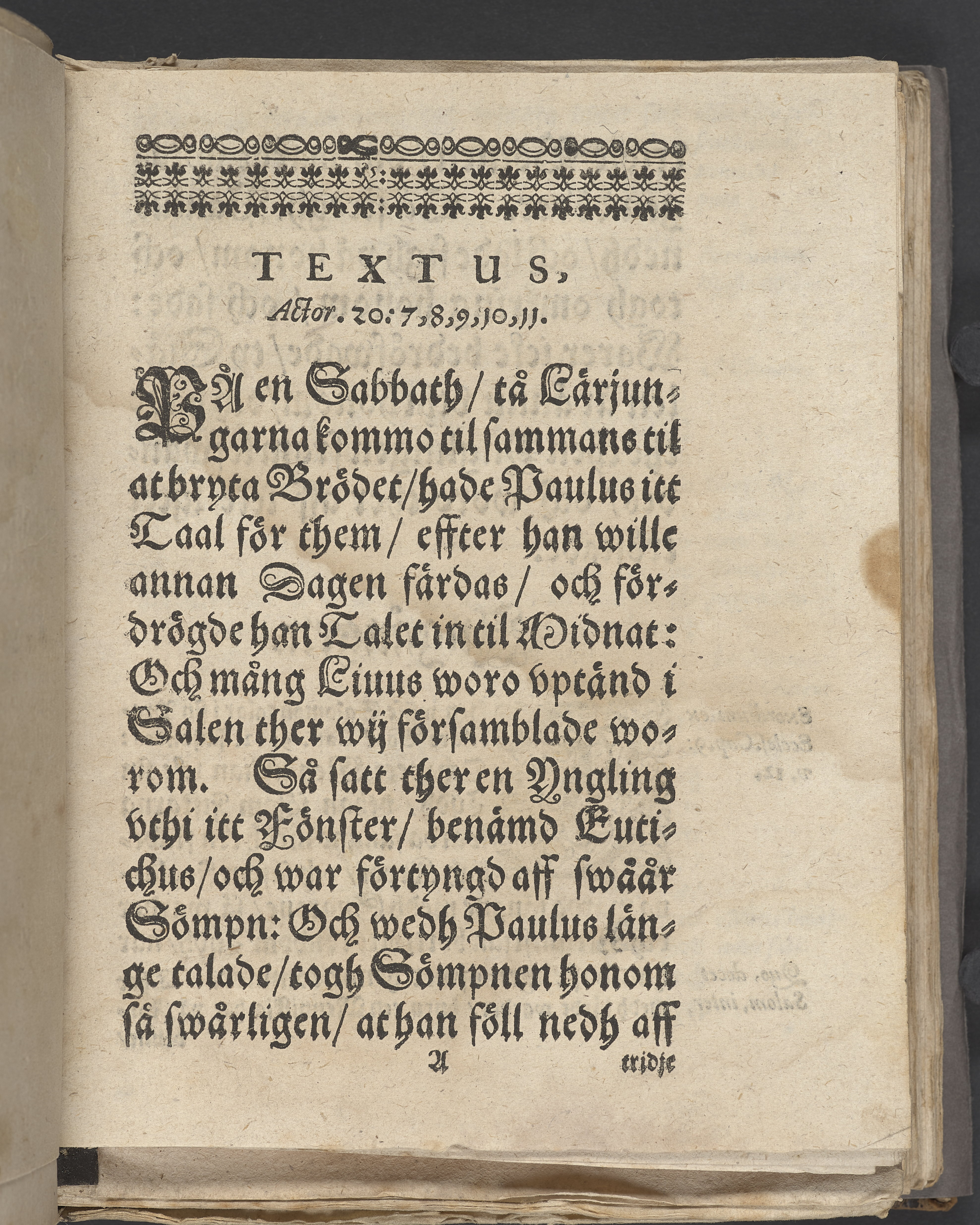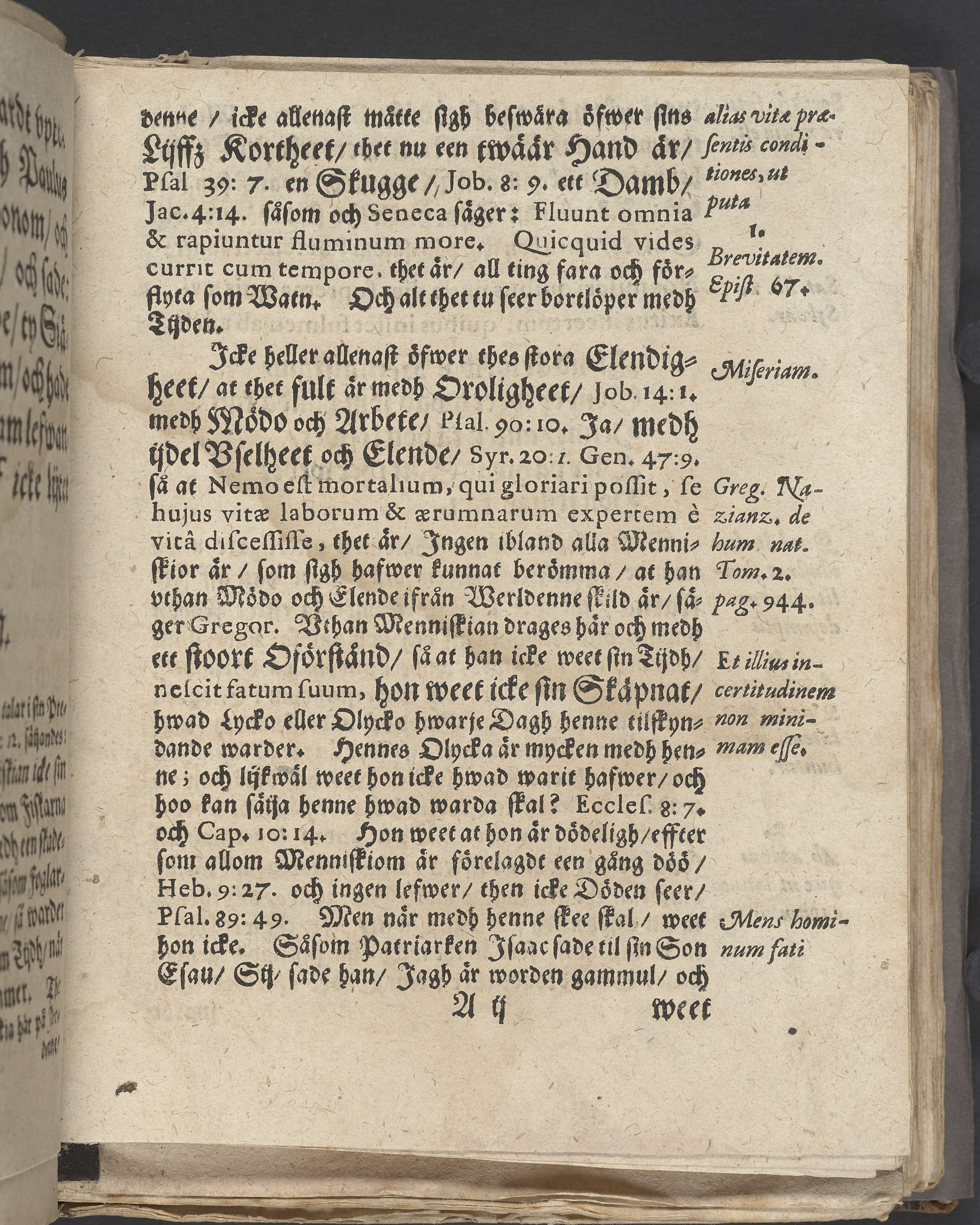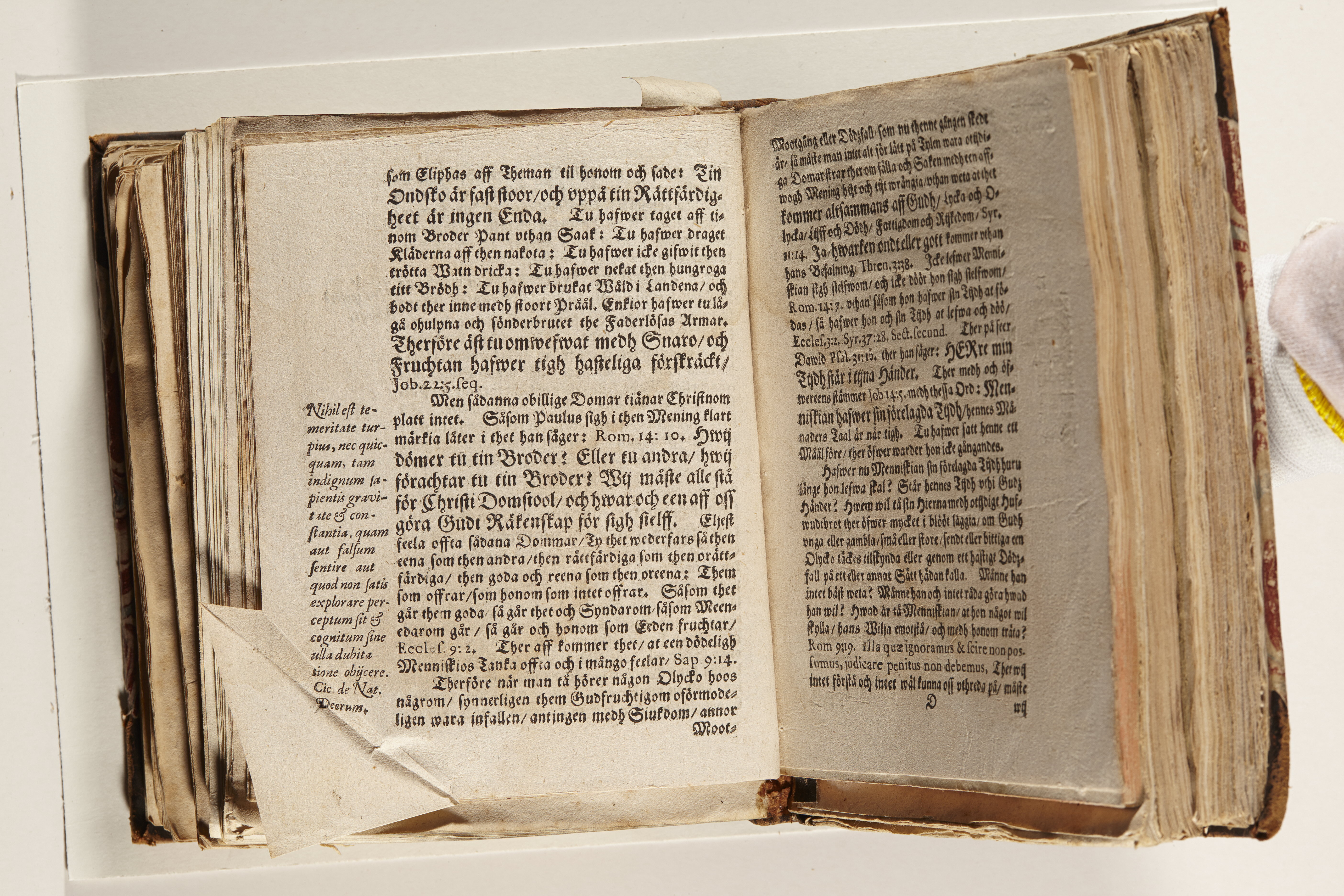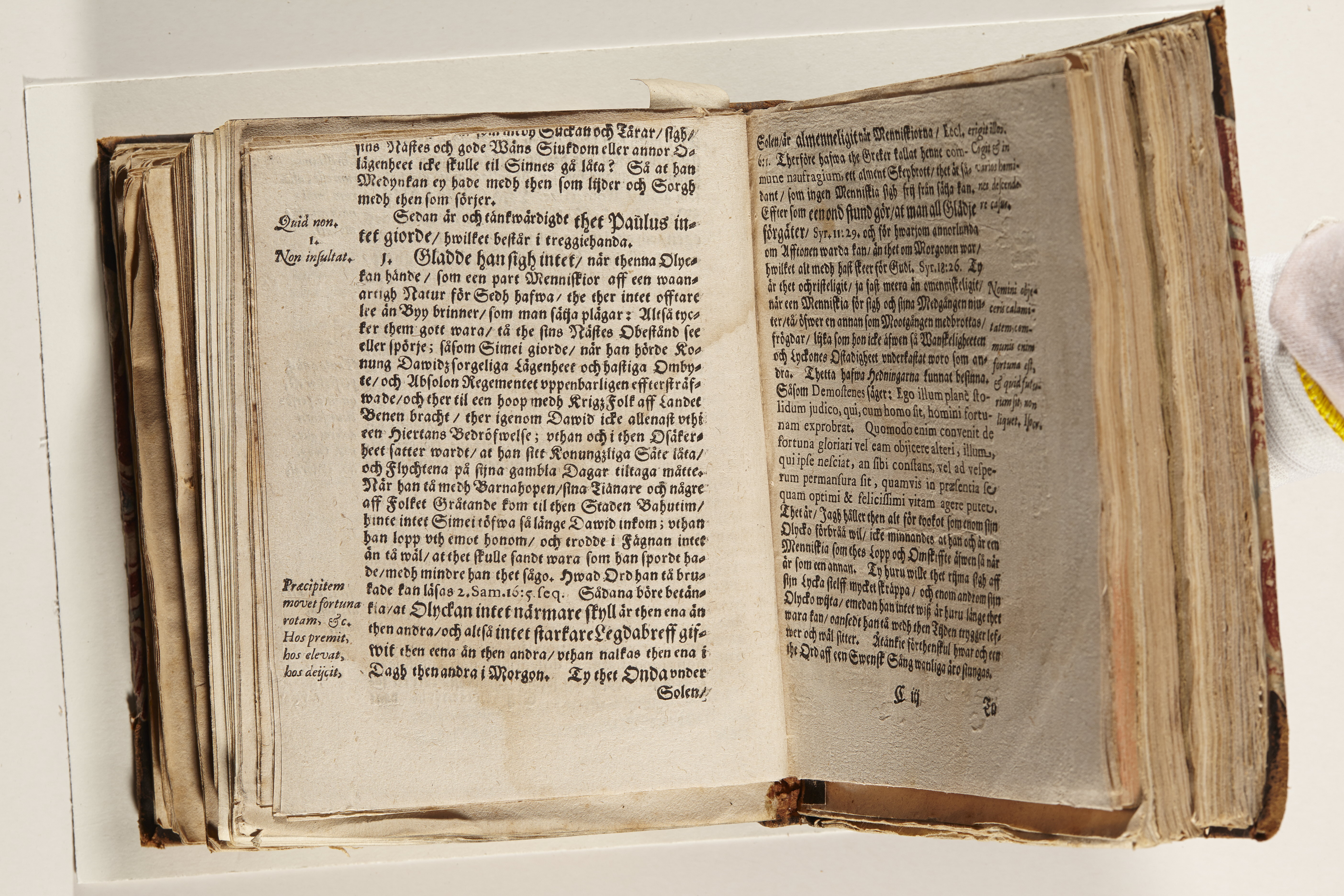 Anteckningar i brunt bläck på tre sidor. Snett skuret, så att övre raden på två sidor delvis saknas (C2 recto och verso). En av 23 skrifter häftade tillsammans i samma band.