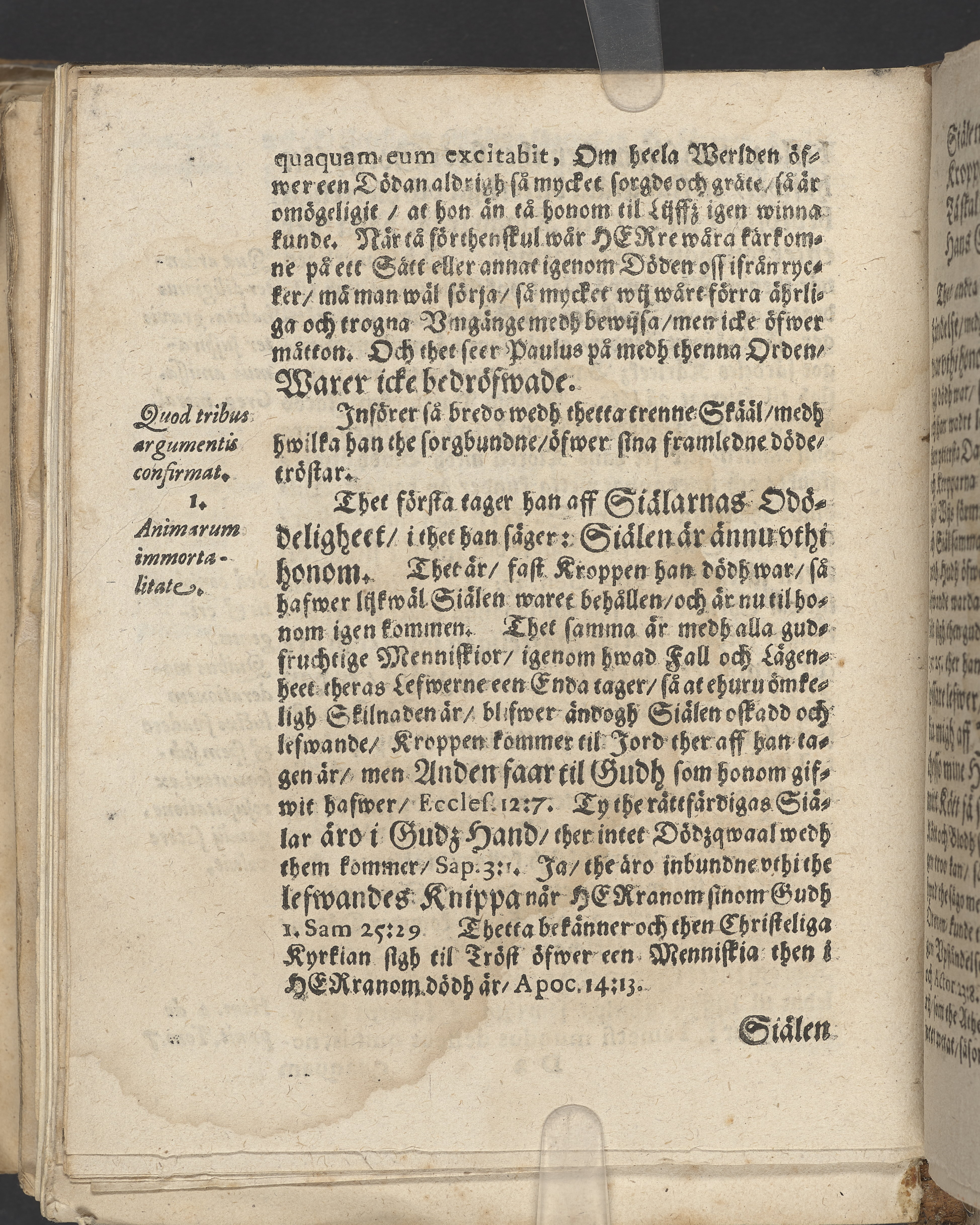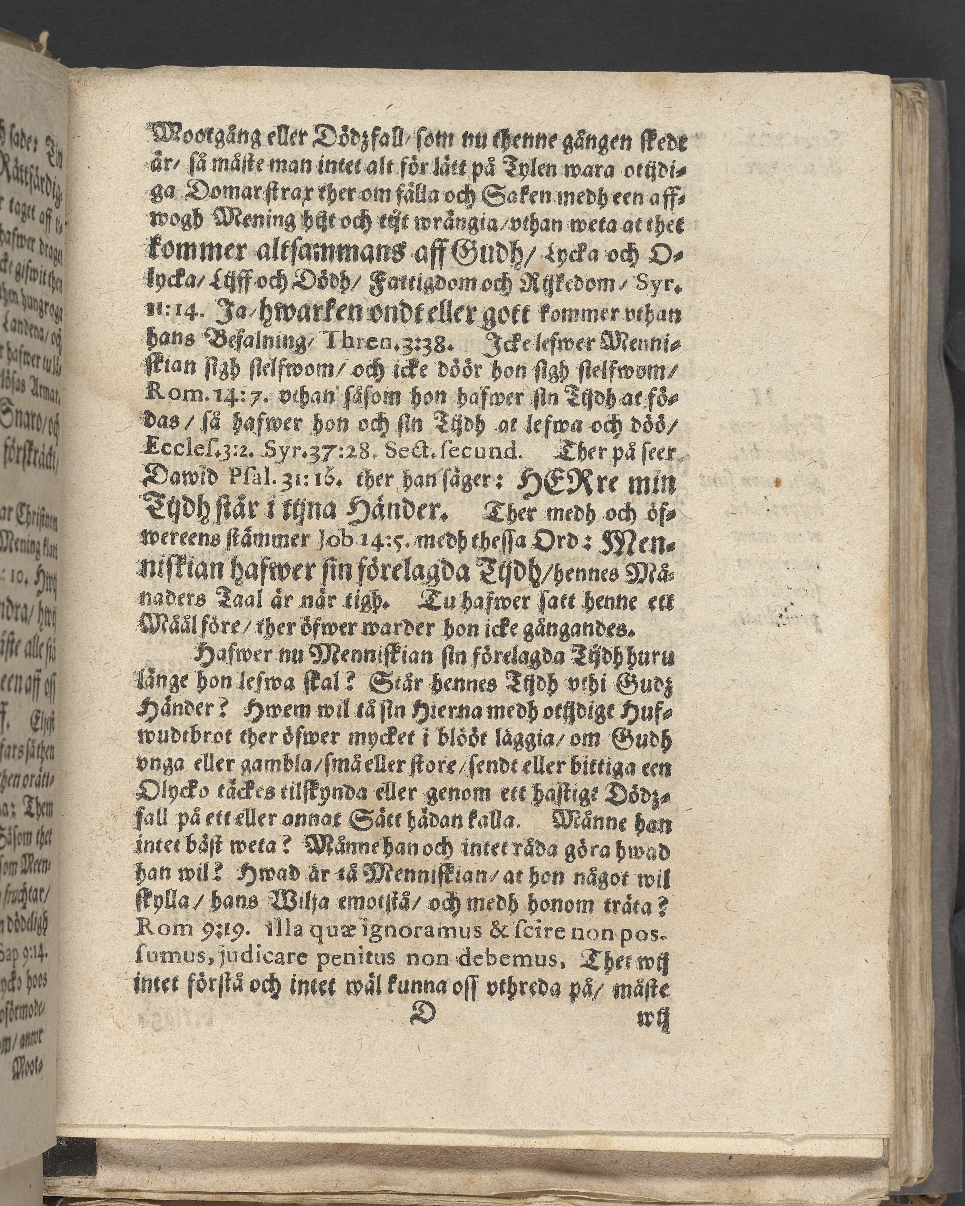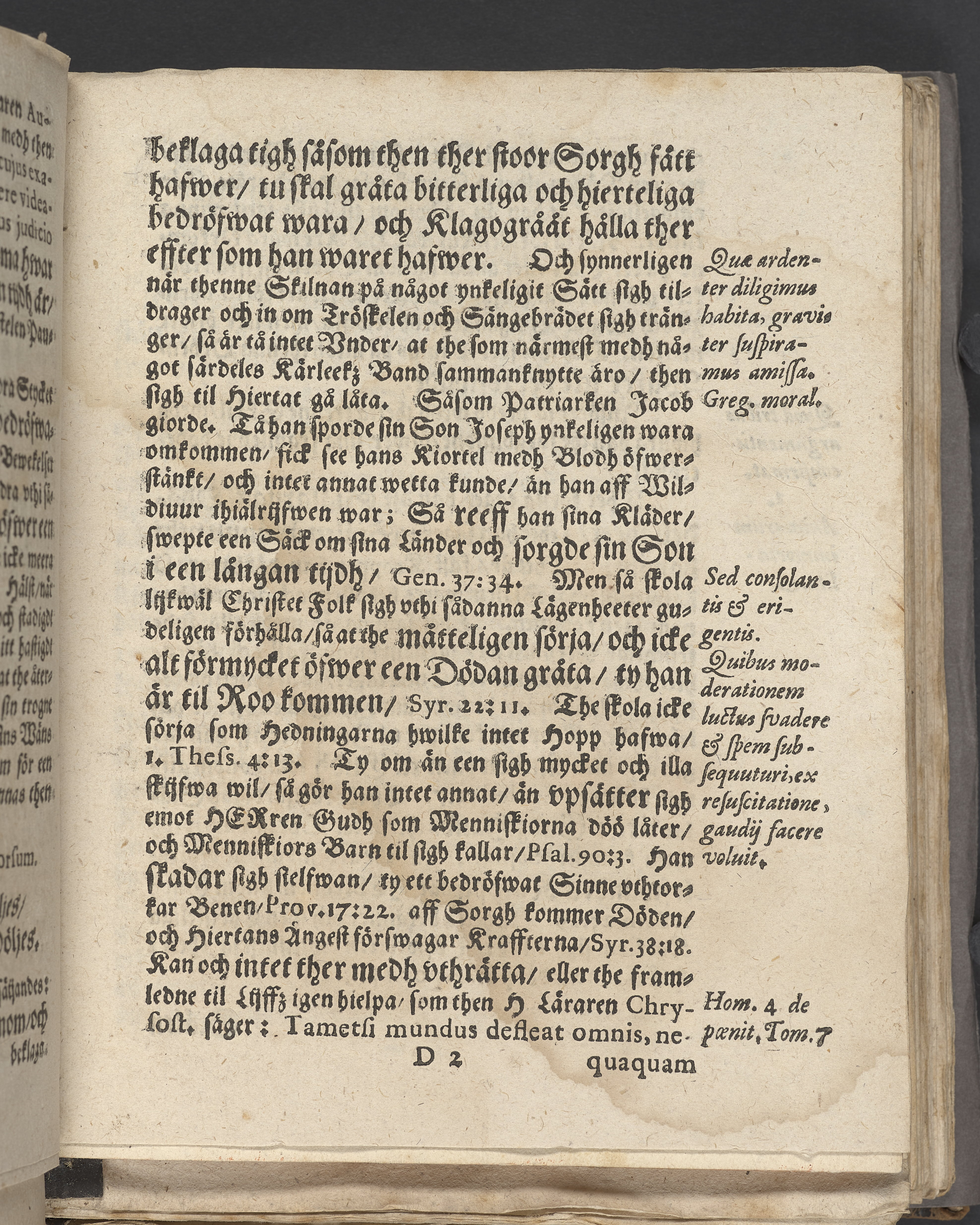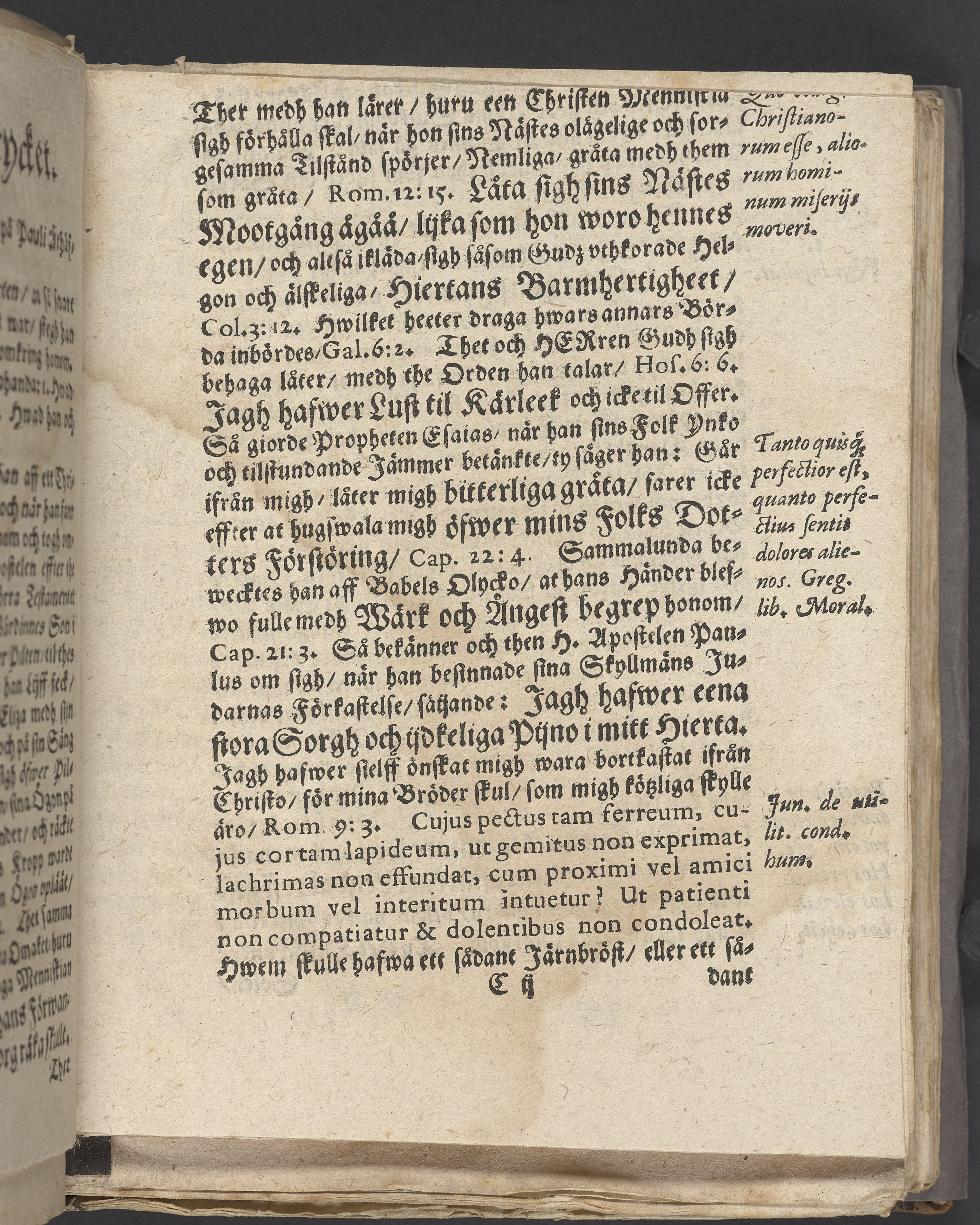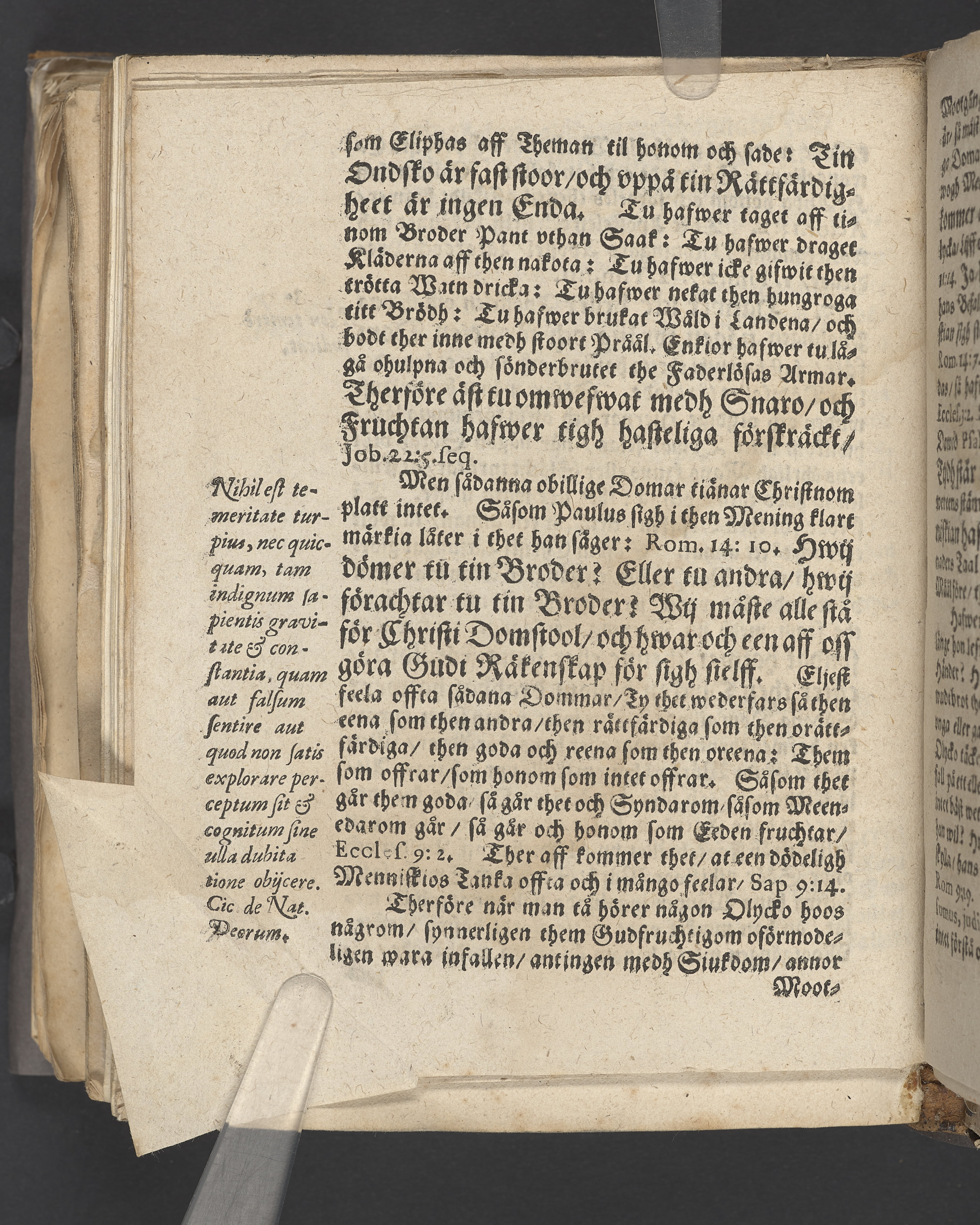 Anteckningar i brunt bläck på tre sidor. Snett skuret, så att övre raden på två sidor delvis saknas (C2 recto och verso). En av 23 skrifter häftade tillsammans i samma band.