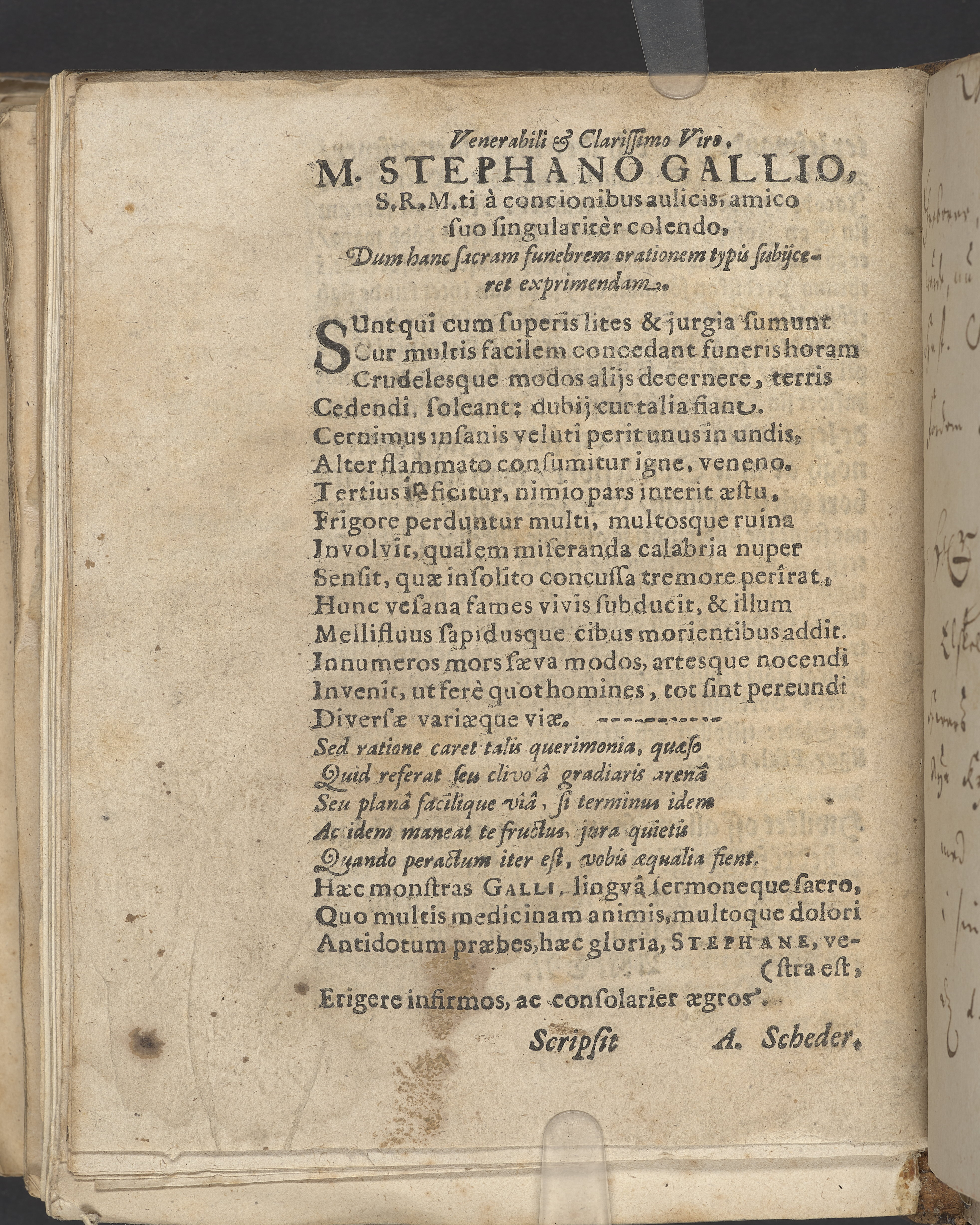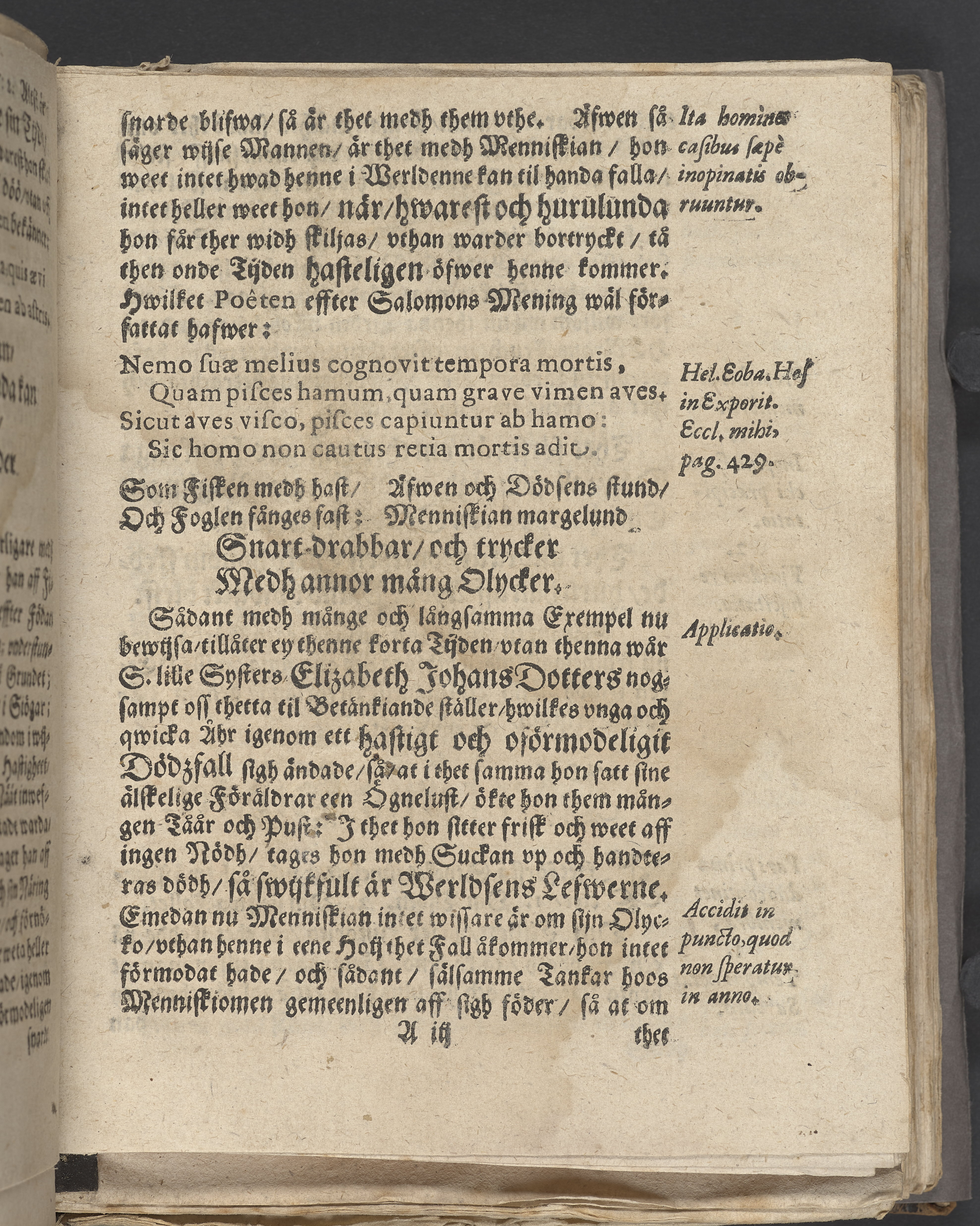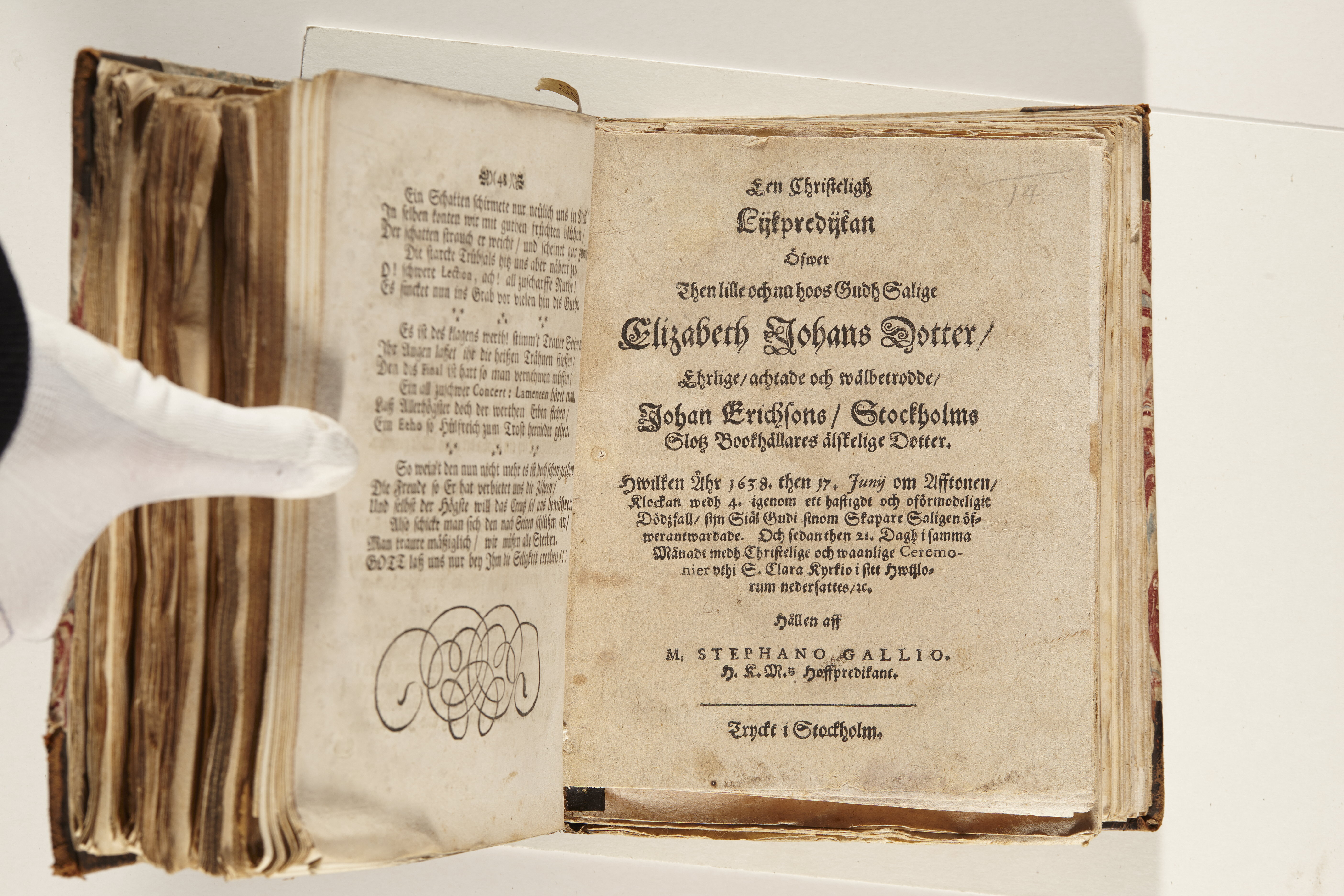 En christeligh lijkpredijkan öfwer then lille och nu hoos Gudh salige Elizabeth Johans dotter/ Ehrlige, achtade och wälbetrodde/ Johan Erichsons/ Stockholms slotz bookhållares älskelige dotter. Hwilken år 1638 then 17. Junij om aftonen/ klockan wedh 4. igenom ett hastigdt och oförmodeligit dödsfall/ sijn siäl Gudi sinom skapare saligen öfwerantwardade. Och sedan den 21. dagh i samma månadt medh christelige och waanlige ceremonier uthi S. Clara kyrckio i sitt hwilorum nedersattes/ etc.Hållen aff M. Stephano Gallio H.K.M.s hoffpredikant. Tryckt i Stockholm.