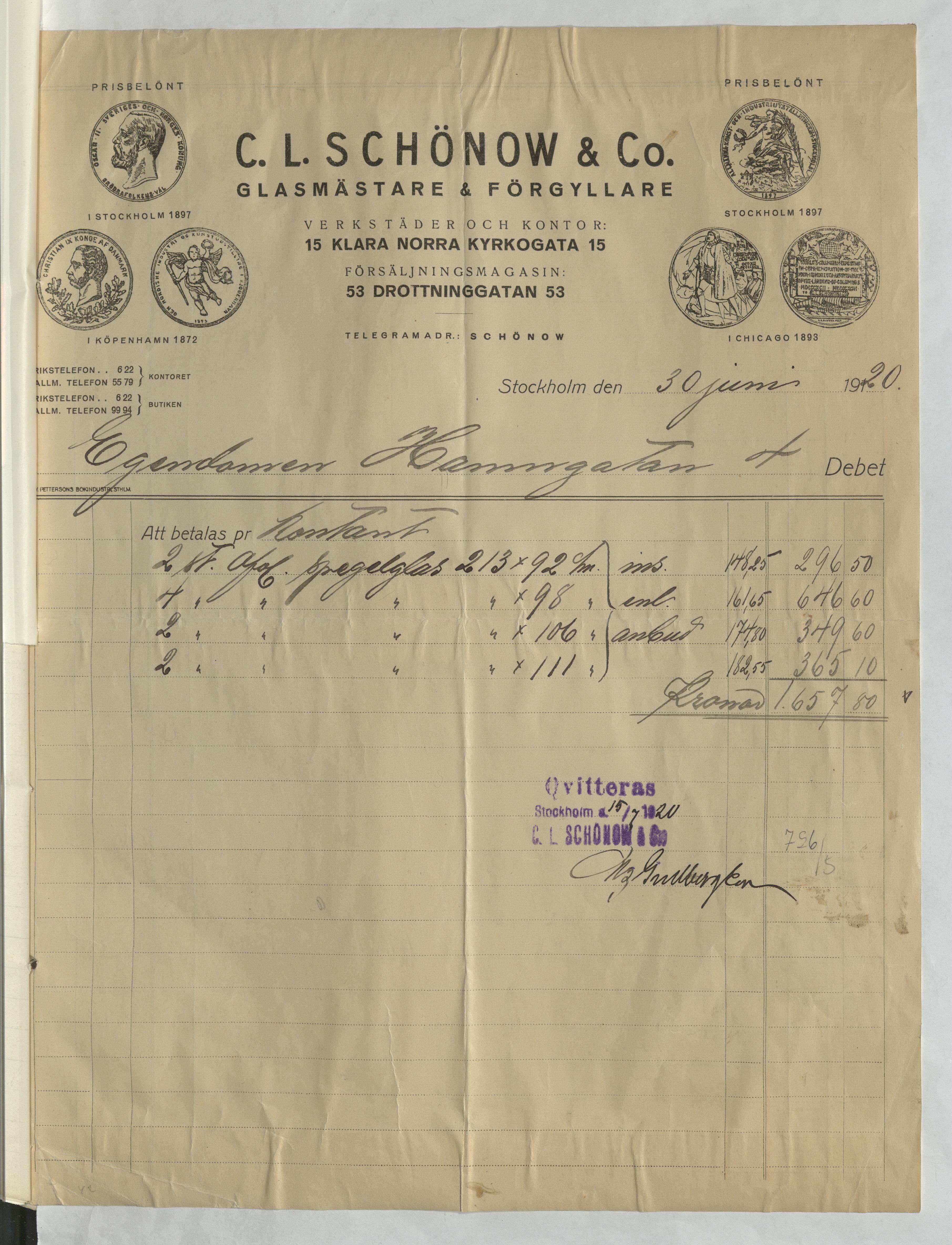 Kvitto från C. L. Schönow & Co. Glasmästare och Förgyllare