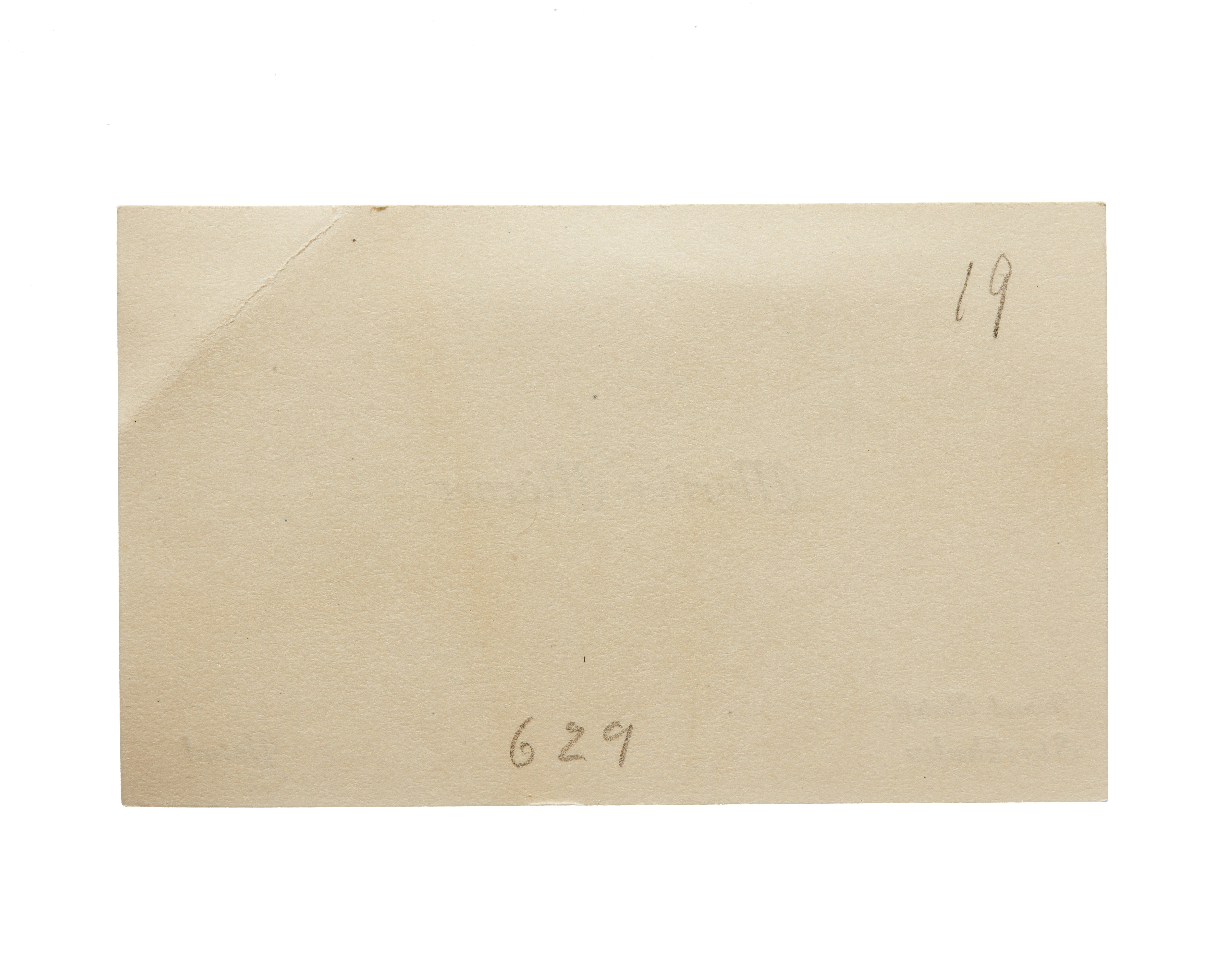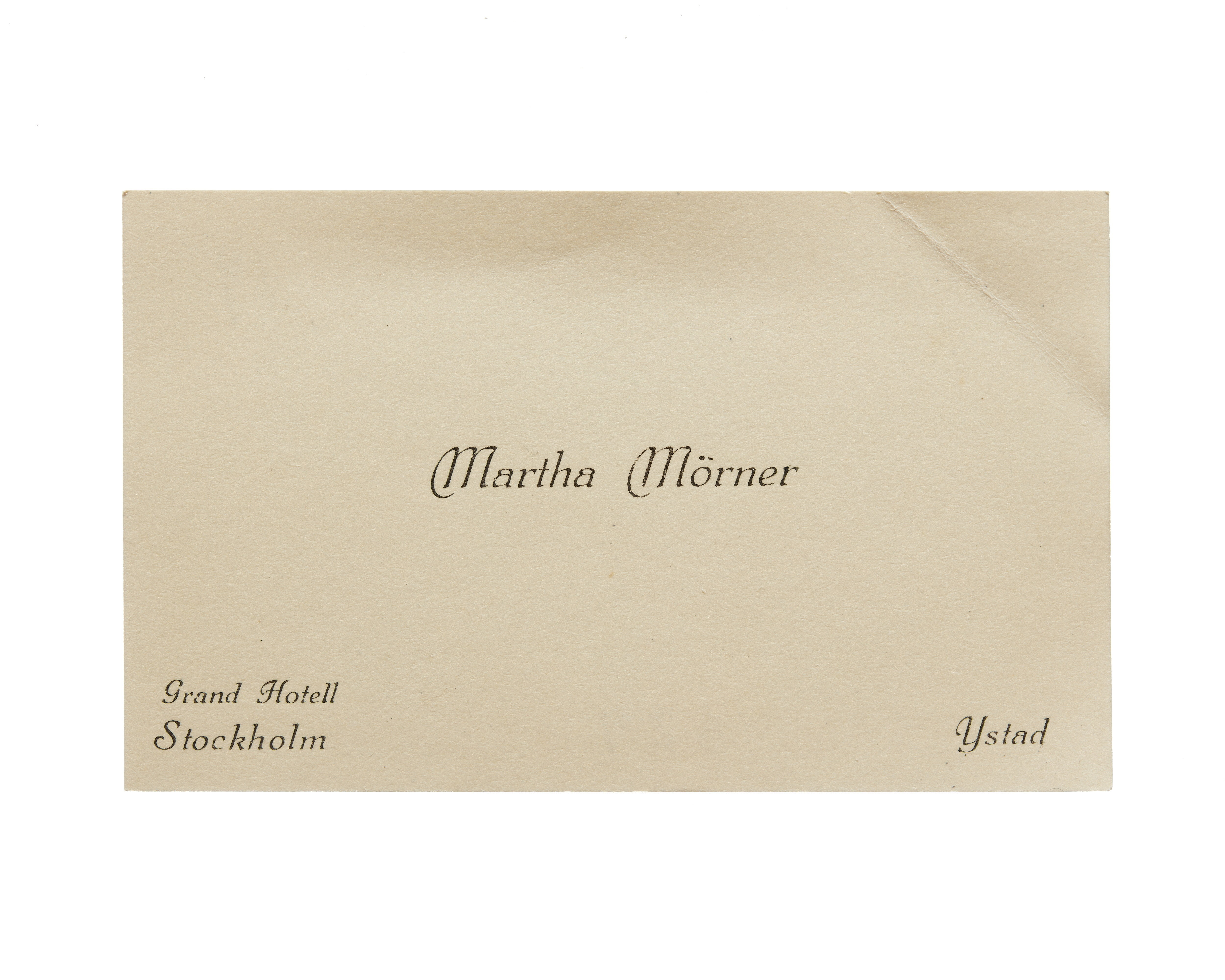 Ett visitkort från Martha Mörner, daterat 1919, vikt i övre högra hörnet. Adress (nedre vänstra hörnet) grand Hotell, Stockholm, (nedre högra hörnet) Ystad.