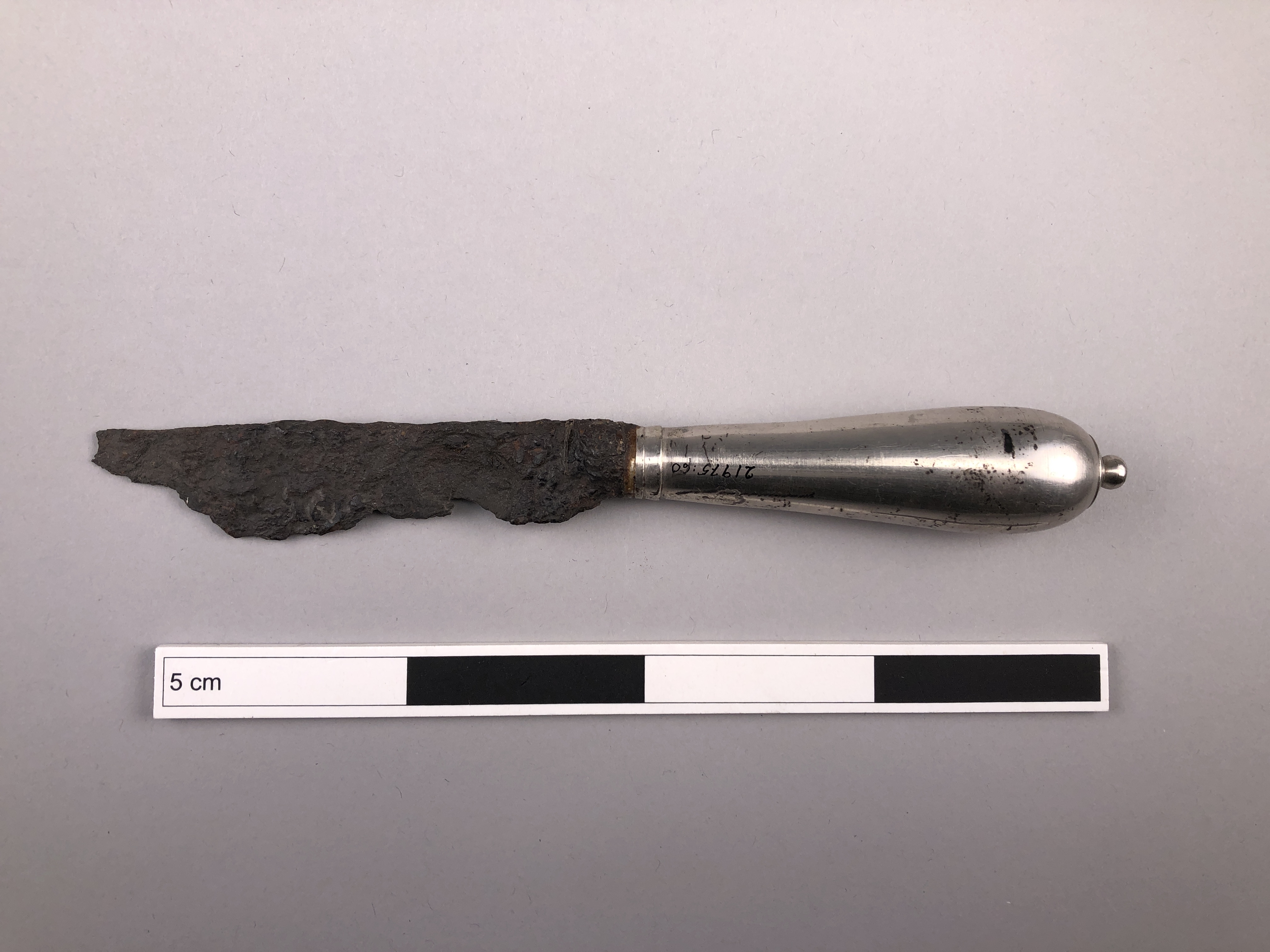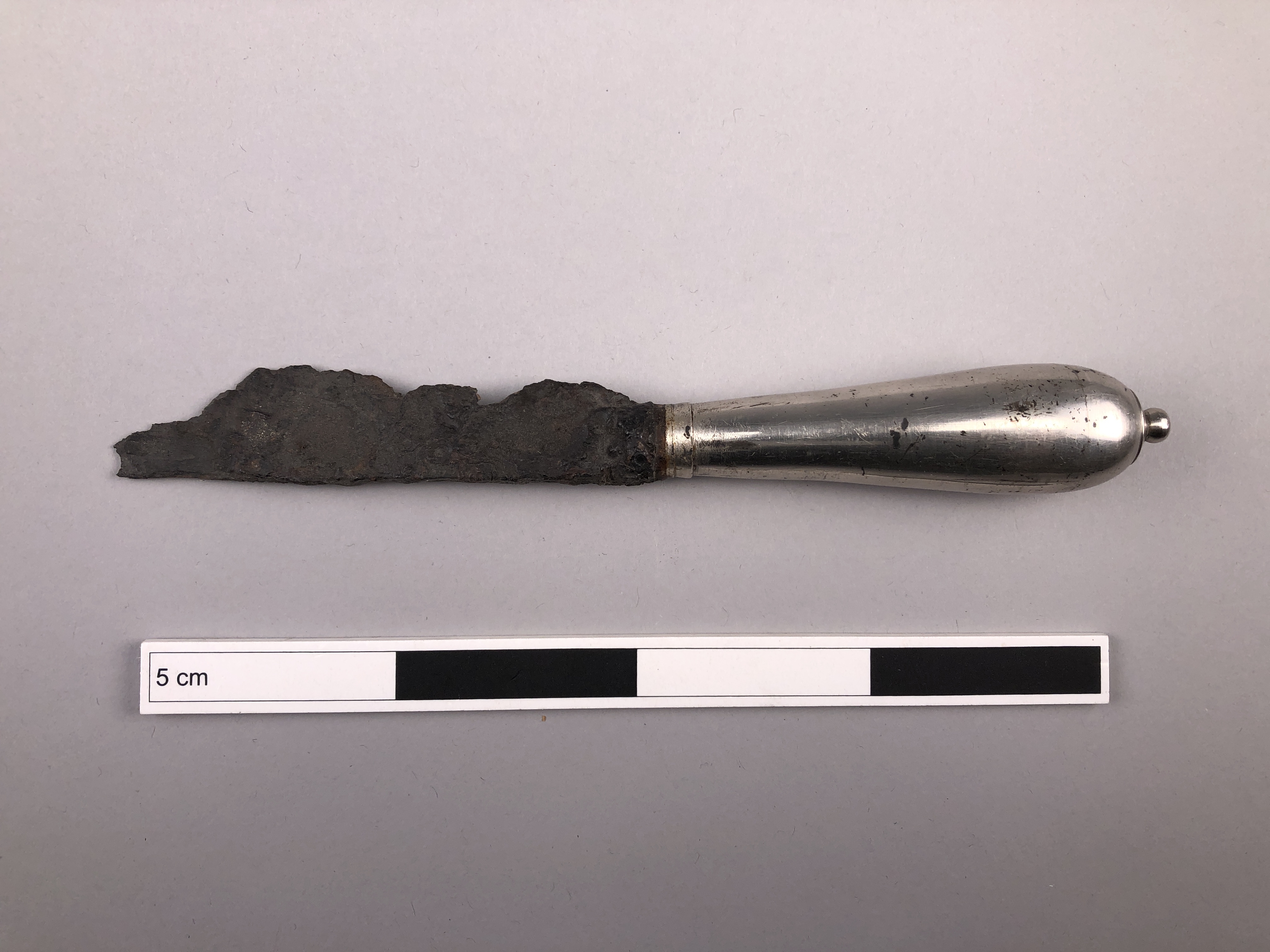 Tillverkad i London, ca år 1700. Skaft av silver, blad av järn.